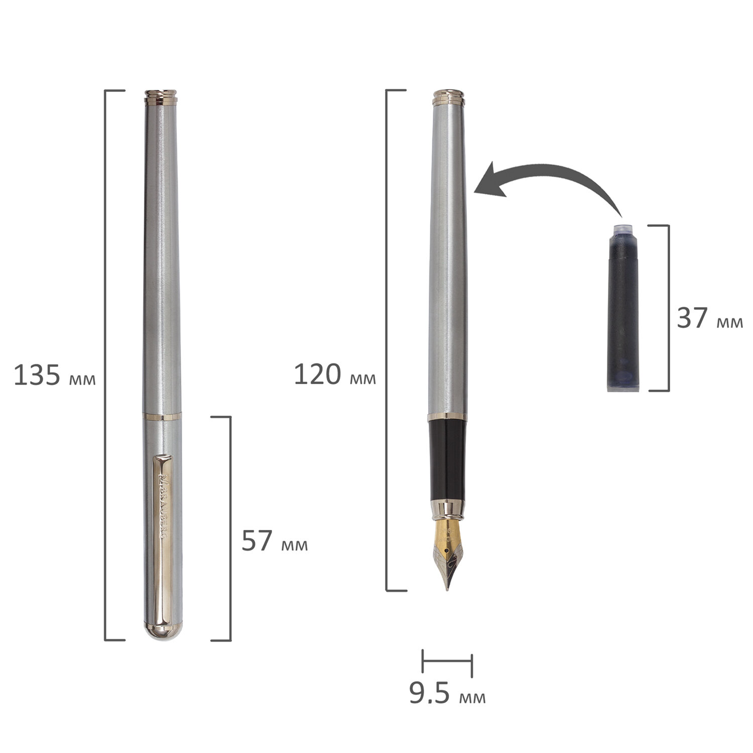 Ручка подарочная перьевая BRAUBERG "Larghetto", СИНЯЯ, корпус серебристый с хромированными деталями Код товара: 143475 501,96 ₽ Купить Производитель:BRAUBERG BRAUBERG "LARGHETTO" – это стильная и удобная перьевая ручка, которая не только порадует своего владельца, но и станет отличным подарком. Картридж с чернилами находится внутри корпуса. Способ применения: 1) Снимите с ручки колпачок, затем раскрутите ее корпус. 2) Вставьте картридж узким концом в ту часть ручки, на которой закреплено перо. 3) Надавите на картридж до щелчка, который возникает тогда, когда ниппель подачи чернил на перо протыкает картридж. 4) Подержите ручку в вертикальном положении, чтобы под силой тяжести чернила стекли к перу. Этот процесс может занять некоторое время. 5) Ручка готова к использованию. Стильная модель перьевой ручки с корпусом из металла серебристого цвета и хромированными деталями. Синий цвет чернил, иридиевое перо украшено гравировкой. Диаметр пишущего узла 0,5 мм. Тип пера M (Medium) – средняя ширина линии. Размер картриджа – 37 мм. Поставляется в фирменной упаковке.Производство: ИндияТип ручки: перьеваяМеханизм: -Серия: LarghettoЦвет корпуса: серебристыйМатериал корпуса: металлЦвет чернил: синийОтделка деталей: хромДлина стержня: 0 ммТип стержня: Картридж чернильныйТолщина линии письма: 0 ммУпаковка: фирменная коробкаСрок годности: 60 месВес: 60 грРазмер упаковки: 2.4 × 16.8 × 3.5 смОбъём: 0.0002 м3Промежуточная упаковка: 36 штТранспортная упаковка: 144 штШтрих-код: 4606224276311 Файлы Сертификат-1.jpg Сертификат-2.jpg Сертификат-3.jpg Сертификат-4.jpg Сертификат-5.jpg Сертификат-6.jpg Сертификат-7.jpg Сертификат-8.jpg Сертификат-9.jpg Сертификат-10.jpg Сертификат-11.jpg Сертификат-12.jpg Сертификат-13.jpg Сертификат-14.jpg Сертификат-15.jpg Сертификат-16.jpg Сертификат-17.jpg Сертификат-18.jpg Сертификат-19.jpg Сертификат-20.jpg Сертификат-21.jpg Сертификат-22.jpg Сертификат-23.jpg Сертификат-24.jpg Сертификат-25.jpg Сертификат-26.jpg Сертификат-27.jpg Сертификат-28.jpg