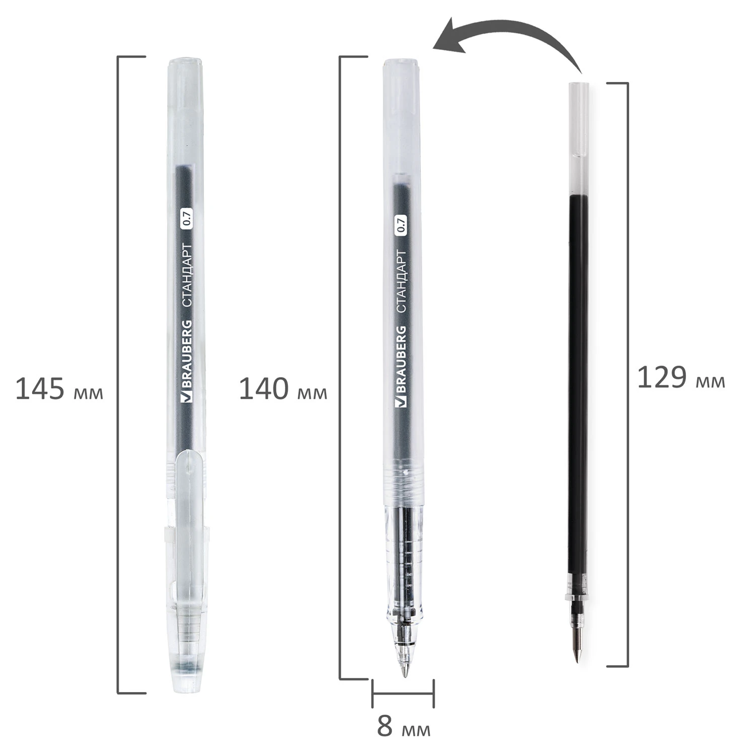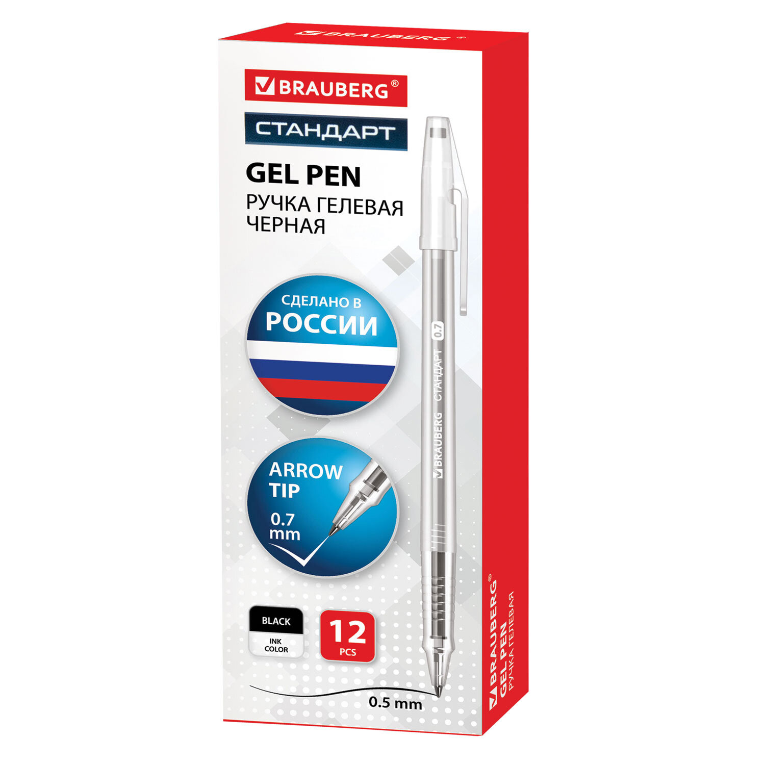Ручка гелевая РОССИЯ "СТАНДАРТ", ЧЕРНАЯ, корпус тонированный, узел 0,7 мм, линия письма 0,5 мм, BRAUBERG Код товара: 143958 28,41 ₽ Купить Производитель:BRAUBERG Классическая гелевая ручка BRAUBERG "СТАНДАРТ" с рифленой поверхностью в зоне захвата обеспечивает комфортное и качественное письмо. Имеет круглый прозрачный корпус с рифленой поверхностью в зоне захвата. Черный цвет чернил. Сменный стержень длиной 129 мм со стандартным наконечником позволит использовать ручку максимально долго. Диаметр пишущего узла, равный 0,7 мм, создает линию письма, равную 0,5 мм.Производство: РоссияЦвет чернил: черныйТолщина линии письма: 0.5 ммДиаметр пишущего узла: 0.7 ммФорма наконечника: стандартныйКоличество в комплекте: 1 шт.Эффект чернил: классическиеПодходит для ЕГЭ/ОГЭ: даСерия: Арктика-МДлина сменного стержня: 129 ммЭргономичная зона захвата: рифлениеЦвет корпуса: прозрачныйФорма корпуса: круглаяПокрытие корпуса: Матовое покрытиеДлина письма: 600 мУпаковка: картонная коробкаСрок годности: 60 месВес: 8 грРазмер упаковки: 1.1 × 14.4 × 1.3 смПромежуточная упаковка: 12 штТранспортная упаковка: 360 штШтрих-код: 4606224376172 Файлы Сертификат-1.jpg Сертификат-2.jpg Сертификат-3.jpg