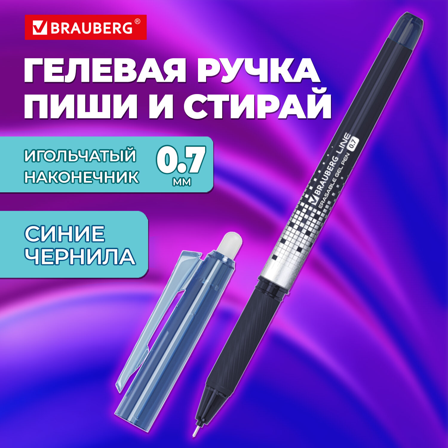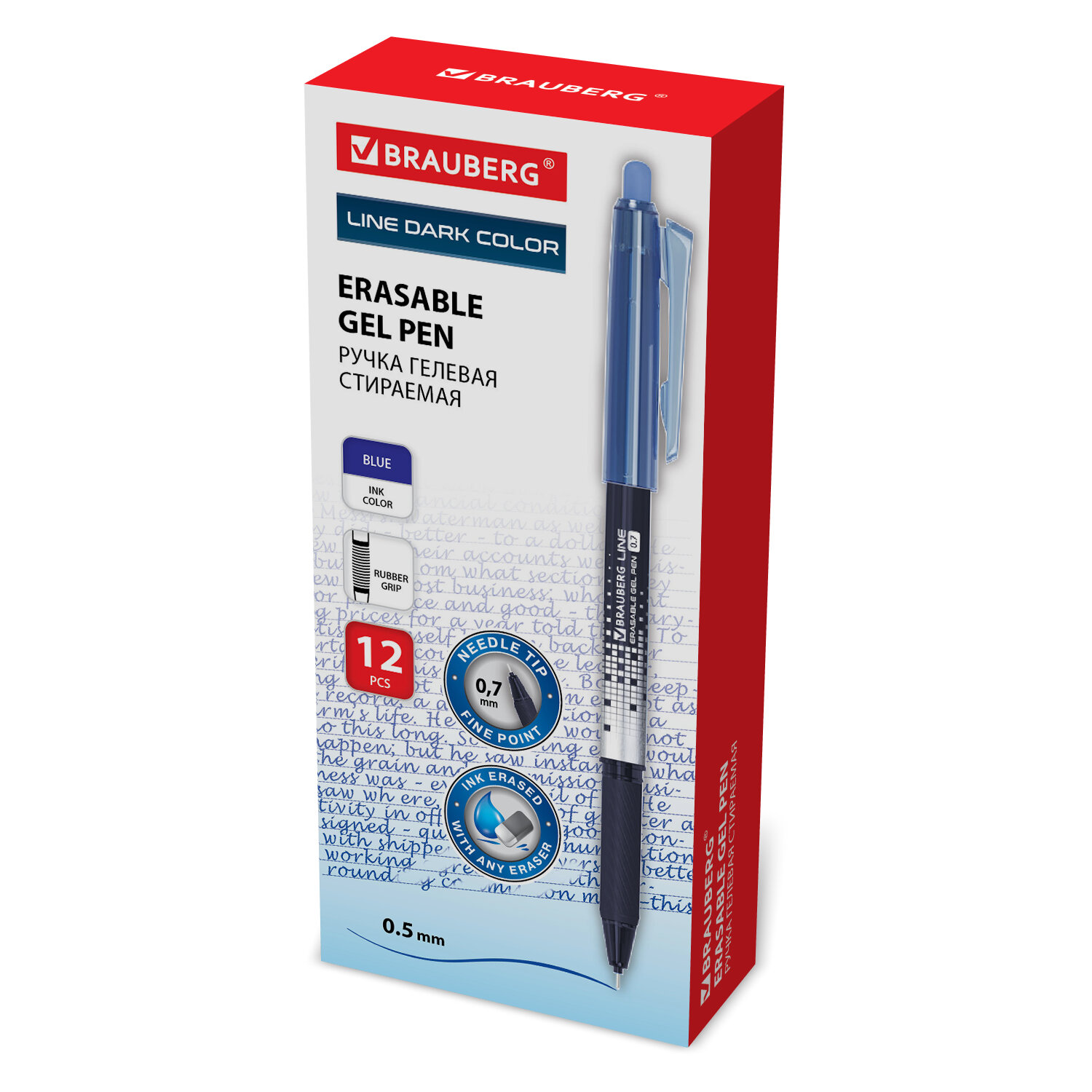 Ручка стираемая гелевая с грипом BRAUBERG "LINE DARK COLOR", СИНЯЯ, игольчатый наконечник 0,7 мм, линия письма 0,5 мм Код товара: 144438 48,45 ₽ Купить Производитель:BRAUBERG Ручка стираемая BRAUBERG "LINE" – надежный инструмент для создания безупречных записей с каллиграфической эстетикой. Функциональность стираемых чернил синего цвета и стильный дизайн делают ее универсальной для выполнения как учебных, так и рабочих задач. Круглый корпус ручки с удобным резиновым держателем в зоне захвата позволяет ручке удобно располагаться в руке, обеспечивая комфортный процесс письма. Оригинальный дизайн выполнен в темно-синих оттенках с деталями серебристого цвета. Игольчатый пишущий узел диаметром 0,7 мм скользит по бумаге с шелковой легкостью, почти не требуя нажатия, и создает линию письма толщиной 0,5 мм. Гелевые термочувствительные чернила становятся невидимыми при нагревании, поэтому легко стираются ластиком, встроенным в конструкцию колпачка, не повреждая бумагу. Восстановить написанное можно при температуре ниже -18 °С.Производство: КитайЦвет чернил: синийКоличество в комплекте: 1 шт.Толщина линии письма: 0.5 ммФорма наконечника: игольчатыйСерия: LINEТип ручки: гелеваяСтираемые чернила: даДиаметр пишущего узла: 0.7 ммСтирание чернил: стирательной резинкойДлина сменного стержня: 130 ммКомплектация: без запасных стержнейЦвет корпуса: синийФорма корпуса: круглаяПокрытие корпуса: без дополнительного покрытияЭргономичная зона захвата: резиновый держательУпаковка: картонная коробкаСрок годности: 60 месВес: 15 грРазмер упаковки: 1.2 × 1.2 × 14.4 смПромежуточная упаковка: 12 штТранспортная упаковка: 864 штШтрих-код: 4606224480824