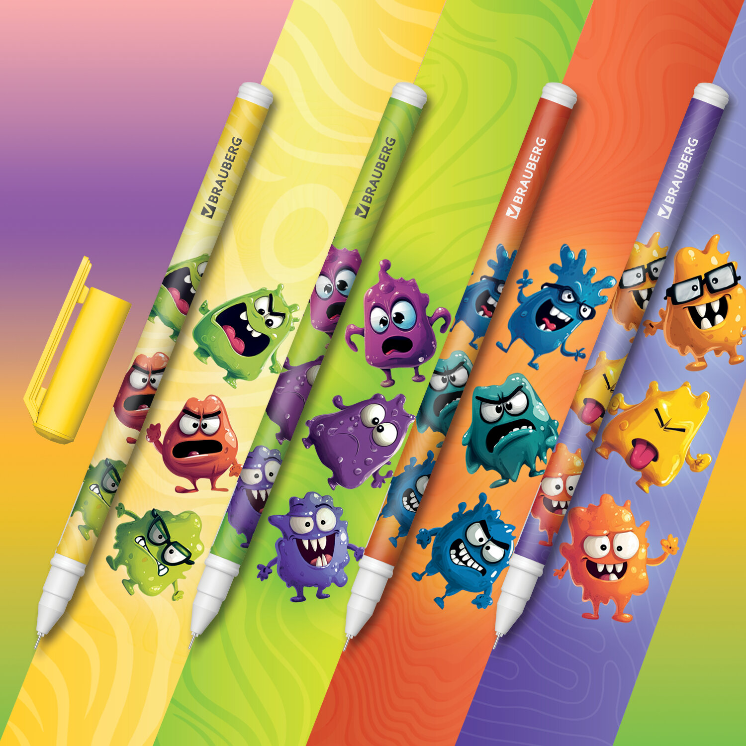 Ручка гелевая, кросс-серия "МОНСТРИКИ", BRAUBERG, СИНЯЯ, корпус ассорти, игольчатый наконечник 0,5 мм, линия письма 0,3 мм Код товара: 144483 56,87 ₽ Купить Производитель:BRAUBERG Ручка гелевая BRAUBERG "МОНСТРИКИ" – надежный пишущий инструмент и запоминающийся аксессуар, который дополнит процесс ведения записей положительными эмоциями и вдохновит на новые идеи. Представлена в четырех дизайнах с необычными и забавными монстриками, которые сразу притягивают взгляд и вызывают яркие эмоции. Круглый корпус с покрытием soft-touch обеспечивает удобное положение в руке и не скользит при письме. Гелевые чернила почти невесомо ложатся на бумагу, минимизируя усилия и позволяя вести записи максимально долго. Аккуратная линия письма толщиной 0,3 мм создается благодаря игольчатому наконечнику диаметром 0,5 мм. Цвет чернил – синий.Производство: КитайЦвет чернил: синийТолщина линии письма: 0.3 ммДиаметр пишущего узла: 0.5 ммФорма наконечника: игольчатыйКоличество в комплекте: 1 шт.Эффект чернил: гелевыеСерия: МОНСТРИКИДлина сменного стержня: 131 ммЭргономичная зона захвата: нетЦвет корпуса: ассортиФорма корпуса: круглаяПокрытие корпуса: Soft-touchДлина письма: 700 мУпаковка: пластиковая тубаСрок годности: 60 месВес: 9 грРазмер упаковки: 1 × 1.3 × 14.8 смПромежуточная упаковка: 30 штТранспортная упаковка: 1080 штШтрих-код: 4606224482408