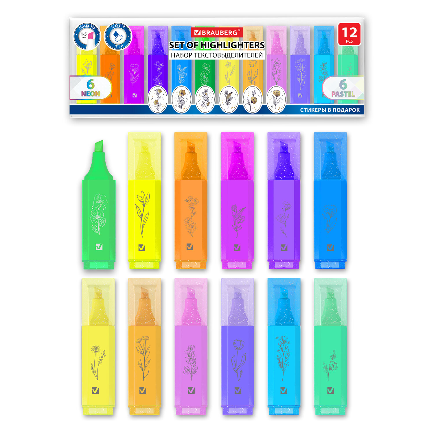 Набор текстовыделителей мини, 12 ЦВЕТОВ, BRAUBERG "ULTRA", 6 неоновых цветов + 6 пастельных цветов, линия 1-5 мм, 152538 Код товара: 152538 318,32 ₽ Купить Производитель:BRAUBERG Набор текстовыделителей мини BRAUBERG "ULTRA" предназначен для выделения текста на бумаге любого типа. Идеально подходит для решения учебных и домашних задач. 12 цветов в наборе: • 6 пастельных – мятный, песочный, лавандовый, персиковый, бирюзовый, пастельный розовый; • 6 неоновых – зеленый, желтый, фиолетовый, оранжевый, голубой и розовый. Неоновые цвета позволяют ярко выделить важное в тексте, а особые пастельные оттенки создают мягкие переходы и равномерно подчеркивают необходимую информацию. В набор также входят 6 стикеров в подарок для оформления конспектов и записей. Текстовыделители имеют прямоугольную форму корпуса диаметром 20 мм. Мягкий скошенный наконечник имеет толщину линии письма от 1 до 5 мм, что обеспечивает удобство при работе с текстом, напечатанным мелким шрифтом, или таблицами. Благодаря особой водной основе чернил текстовыделители не высыхают без колпачка в течение 8 часов. Текстовыделители обладают экономным расходом чернил, при этом длина линии письма достигает 300 метров. Чернила быстро впитываются и тем самым предотвращают размазывание в процессе использования. Цвет колпачка и корпуса соответствует цвету чернил. Необычный колпак с блестками отлично дополняется утончЕнными рисунками.Производство: КитайЦвет чернил: ассортиКоличество в комплекте: 12 шт.Форма наконечника: скошенныйСпецэффект цвета чернил : неоновый, пастельныйОснова чернил: воднаяСерия: ULTRAМин. толщина линии письма: 1 ммМакс. толщина линии письма: 5 ммФорма корпуса: прямоугольнаяДиаметр корпуса: 20 ммУпаковка: пластиковый футляр с европодвесомСрок годности: 48 месВес: 162 грРазмер упаковки: 2 × 25.5 × 9.1 смОбъём: 0.0006 м3Промежуточная упаковка: 12 штТранспортная упаковка: 96 штШтрих-код: 4606224438818 Сертификат-1.jpg Сертификат-2.jpg Сертификат-3.jpg