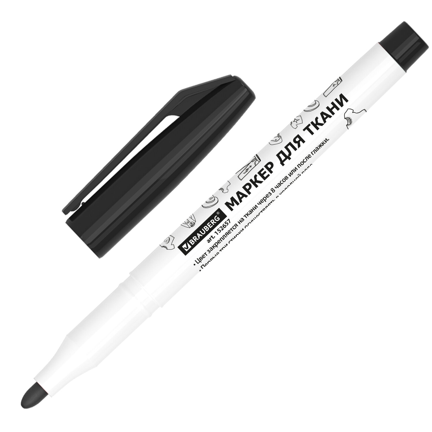 Маркер для ткани ЧЕРНЫЙ, TEXTILE MARKER, несмываемый, круглый наконечник 1-3 мм, BRAUBERG Код товара: 152657 48,96 ₽ Купить Производитель:BRAUBERG Маркер для ткани BRAUBERG TEXTILE MARKER предназначен для нанесения маркировки и рисования на одежде и любых текстильных поверхностях. Маркер для ткани черного цвета обладает круглой формой корпуса из пластика, диаметр –13 мм. Линия письма от 1 до 3 мм. Особая нестираемая водная основа чернил обеспечивает экономный расход: длина линии письма – 1000 метров. • Цвет закрепляется на ткани через 8 часов или после 4-минутной глажки; • Первые три стирки осуществлять в холодной воде; • Допускается легкое потускнение после первой стирки; • Температура стирки не выше 40 °C, ручная стирка должна быть более бережной. Изделие не перезаправляется. После использования плотно закрывайте колпачок для предотвращения высыхания наконечника и чернил. Цвет колпачка соответствует цвету чернил.Производство: ИндияЦвет чернил: черныйСерия: TEXTILE MARKERКоличество в комплекте: 1 шт.Форма наконечника: круглаяМинимальная толщина линии письма: 1 ммМаксимальная толщина линии письма: 3 ммТип чернил: водостойкиеФорма корпуса: круглаяДиаметр корпуса: 13 ммМатериал корпуса: пластикНаличие клипа: даОснова чернил: воднаяУпаковка: Картонная коробкаСрок годности: 60 месВес: 12 грРазмер упаковки: 0.6 × 13.8 × 0.8 смПромежуточная упаковка: 12 штТранспортная упаковка: 1152 штШтрих-код: 4606224515700 Сертификат-1.jpg Сертификат-2.jpg