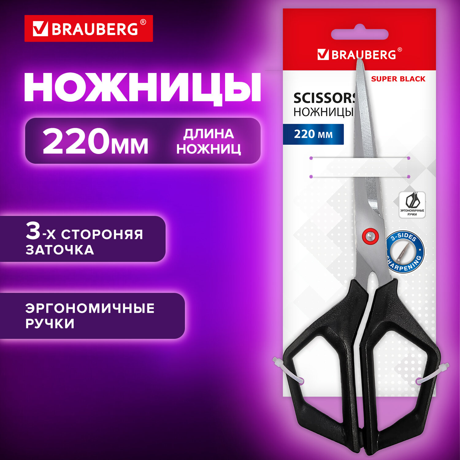 Ножницы BRAUBERG "Super black" 220 мм, черные, 3-х сторонняя заточка, ручки из ABS пластика Код товара: 238855 263,84 ₽ Купить Производитель:BRAUBERG BRAUBERG "Super black" – это ножницы для разрезания бумаги и картона. Идеальный вариант для регулярного применения в офисе или дома. Лезвия имеют 3-стороннюю заточку, ручки из пластика с резиновыми вставками. Специальная форма ручек в значительной степени облегчает выполнение работы. Прочные и долговечные лезвия обеспечивают необходимую устойчивость к износу. Это ножницы для тех, кто хочет добавить в набор канцелярских принадлежностей удобный, стильный и красивый инструмент, позволяющий в кратчайшие сроки и без лишних сложностей справиться с любой поставленной задачей – разрезанием бумаги, картона и т.д.Производство: КитайДлина: 220 ммТип ножниц: для правшиЗаточка лезвий: трёхсторонняяЭргономичная форма ручек: даФорма лезвий: остроконечныеДлина лезвий: 110 ммСерия: Super blackМатериал лезвия: нержавеющая стальМатериал ручек: пластикЦвет ручек: черныйУпаковка: блистер с европодвесомВес: 84 грРазмер упаковки: 2.5 × 8.5 × 21.5 смОбъём: 0.0004 м3Промежуточная упаковка: 12 штТранспортная упаковка: 144 штШтрих-код: 4606224472614