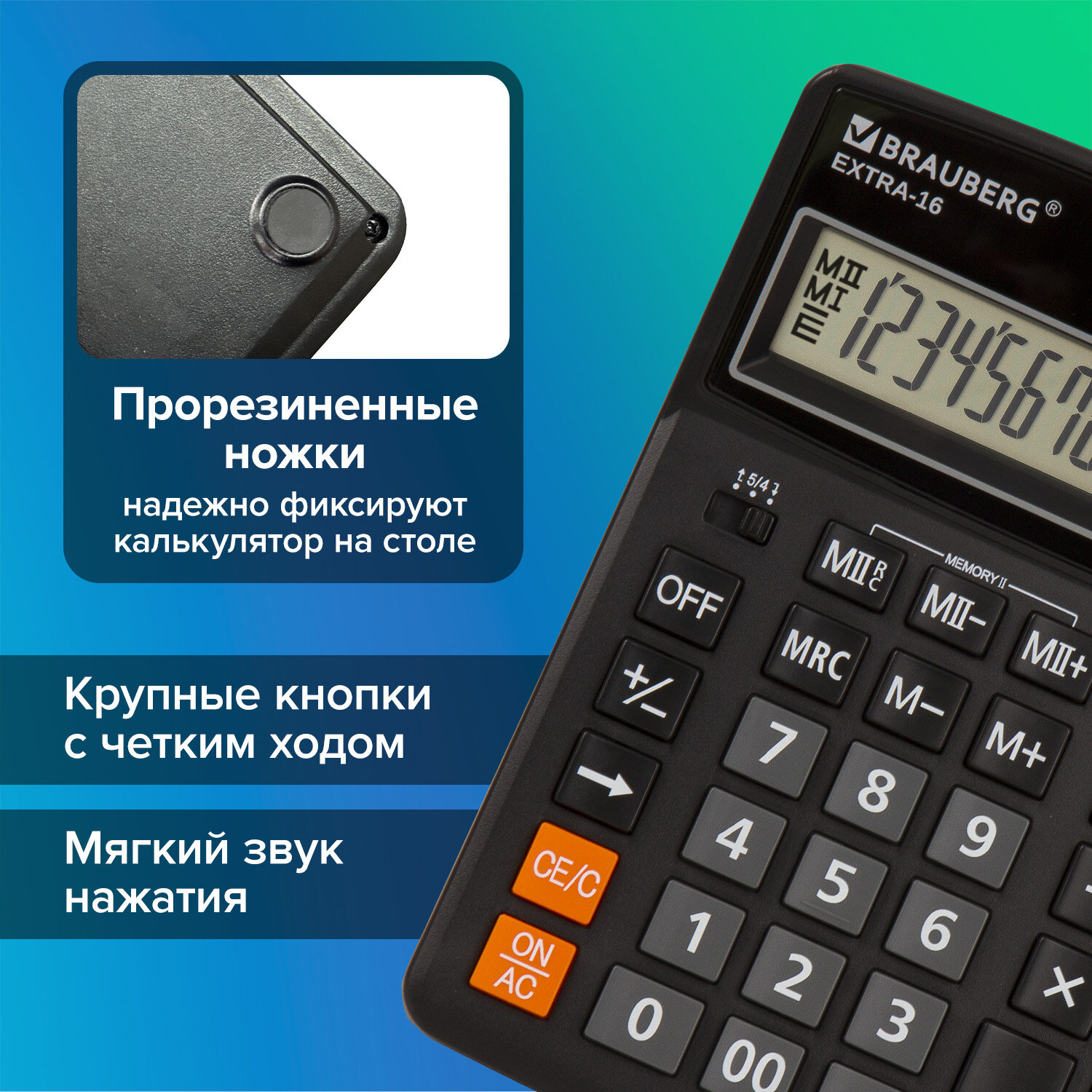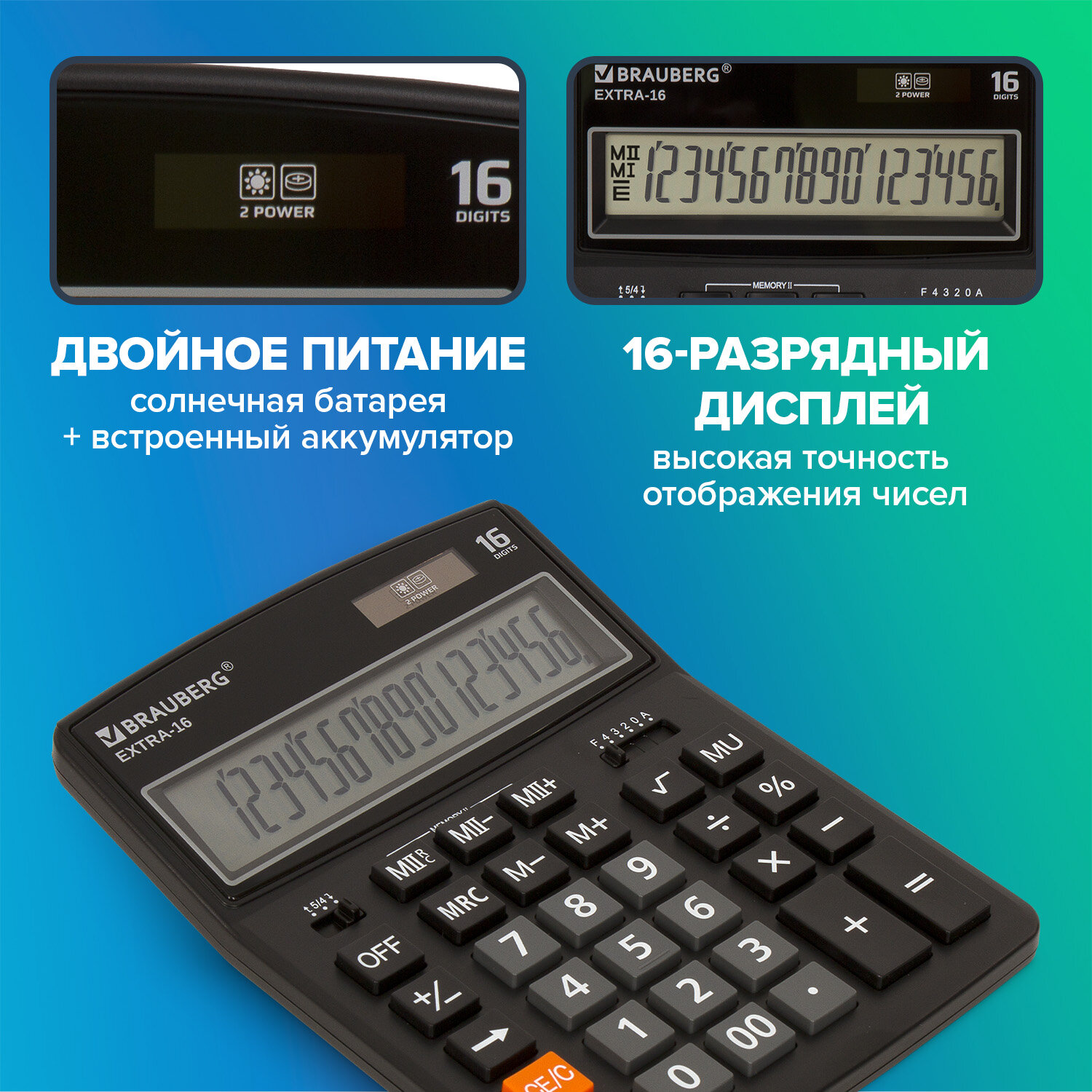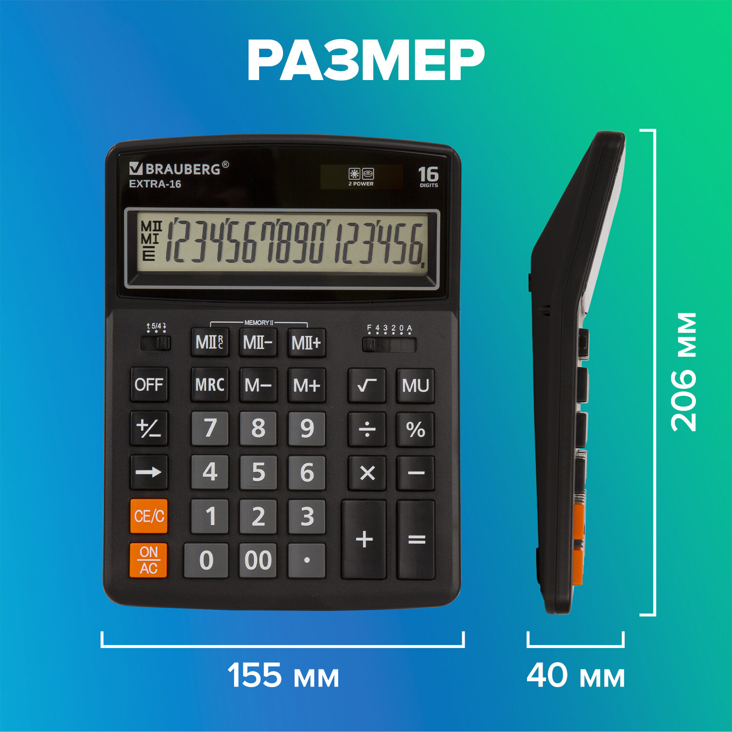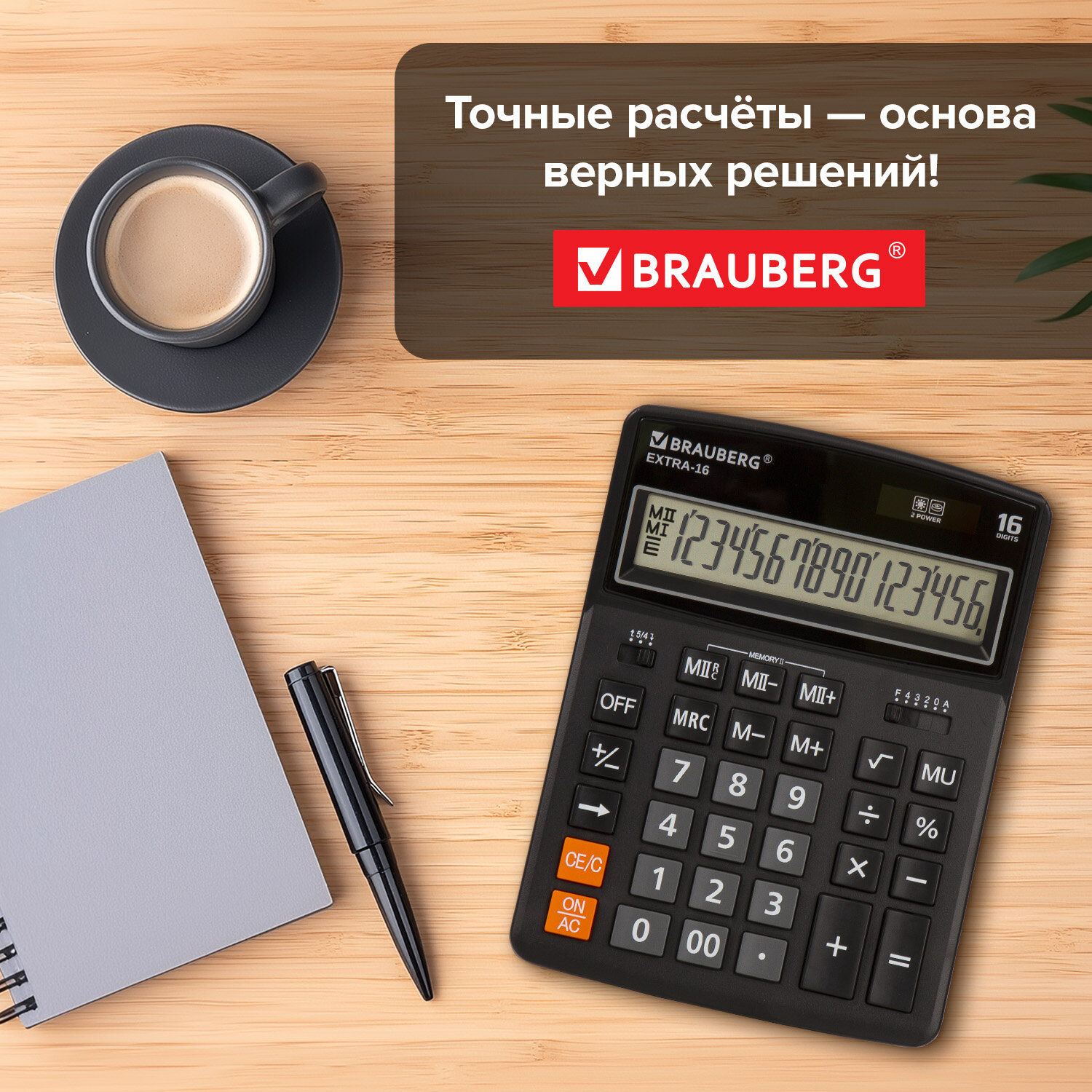 Калькулятор настольный BRAUBERG EXTRA-16-BK (206x155 мм), 16 разрядов, двойное питание, ЧЕРНЫЙ Код товара: 250475 1 203,73 ₽ Купить Производитель:BRAUBERG Настольный калькулятор BRAUBERG EXTRA-16-BK. Большой дисплей с увеличенным углом обзора, устойчивый корпус и клавиатура с цветной дифференциацией для эффективной работы с максимальным комфортом. Калькулятор производит все основные арифметические действия: возведение в степень, вычисления с процентами, извлечение квадратного корня. Незаменим для бухгалтеров благодаря наличию клавиш двойной памяти, «00» и MU для расчетов налогов и торговой наценки. Переключатели округления и положения десятичного знака позволяют производить нужные настройки. Большой шестнадцатиразрядный дисплей отображает большие значения с высокой точностью округления. Встроенный аккумулятор и солнечная батарея позволяют калькулятору работать при любом освещении, а клавиша выключения OFF и функция автоматического отключения (через 8-10 минут бездействия) позволяют максимально продлить срок его службы без замены батареи. Размер - 206x155 мм. Гарантия 10 лет.Производство: КитайРазрядность дисплея: 16Серия: ExtraТип размера: полноразмерныйТип применения: для бухгалтеровСтиль: классическийФункционал: вычисление наценки (MU)Исполнение: настольныйЧисло строк дисплея: 1Материал кнопок: пластикТип питания: 1 батарейка LR44 (LR1154/AG13), солнечный элементЦвет панели: черныйДлина корпуса: 206 ммШирина корпуса: 155 ммВысота корпуса: 40 ммВес: 349 грРазмер упаковки: 4.2 × 24.7 × 15.9 смОбъём: 0.002 м3Промежуточная упаковка: 20 штТранспортная упаковка: 40 штШтрих-код: 4606224282442 Сертификат-1.jpg Сертификат-2.jpg Сертификат-3.jpg
