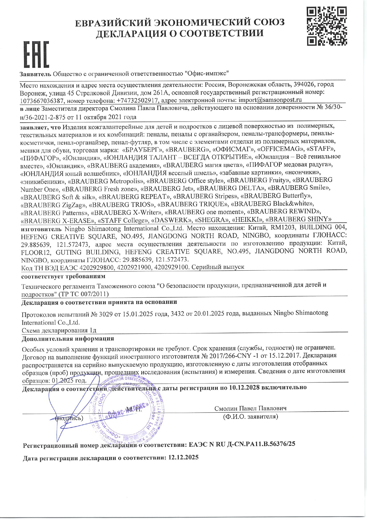 Пенал BRAUBERG, 1 отделение, полиэстер, "Sport", черный, 19х4х6 см Код товара: 270267 279,06 ₽ Купить Производитель:BRAUBERG Пенал BRAUBERG предназначен для хранения школьных принадлежностей, вмещает до 50 канцелярских предметов стандартного размера. Удобный и вместительный пенал не займет много места в школьном ранце или рюкзаке. Выполнен из прочного материала. Внутри пенала подкладка из полиэстера. Имеет одно отделение для канцелярских принадлежностей. Застежка-молния с металлическим бегунком. Упакован в прозрачный полиэтиленовый пакет с картонным подвесом, который сохранит качество и товарный вид при хранении и транспортировке. Универсальные косметички BRAUBERG - это высокое качество и проработанные до мелочей модели с современным дизайном и широким функционалом. На протяжении 15 лет наши специалисты сосредоточены на разработке, производстве и совершенствовании товаров повседневного спроса для детей и взрослых. Именно поэтому BRAUBERG знают и выбирают по всей стране.Производство: КитайТип товара: пенал-косметичкаЗастежка: молнияНазначение: универсальноеКоличество отделений: 1Материал: полиэстерСерия: BASEДизайн: BlackБазовый цвет: черныйДлина: 19 смШирина: 4 смУпаковка: прозрачный пакет с европодвесомВес: 52 грРазмер упаковки: 4.5 × 21.8 × 7.7 смОбъём: 0.0009 м3Промежуточная упаковка: 60 штТранспортная упаковка: 180 штШтрих-код: 4606224314792 Сертификат-1.jpg Сертификат-2.jpg Сертификат-3.jpg