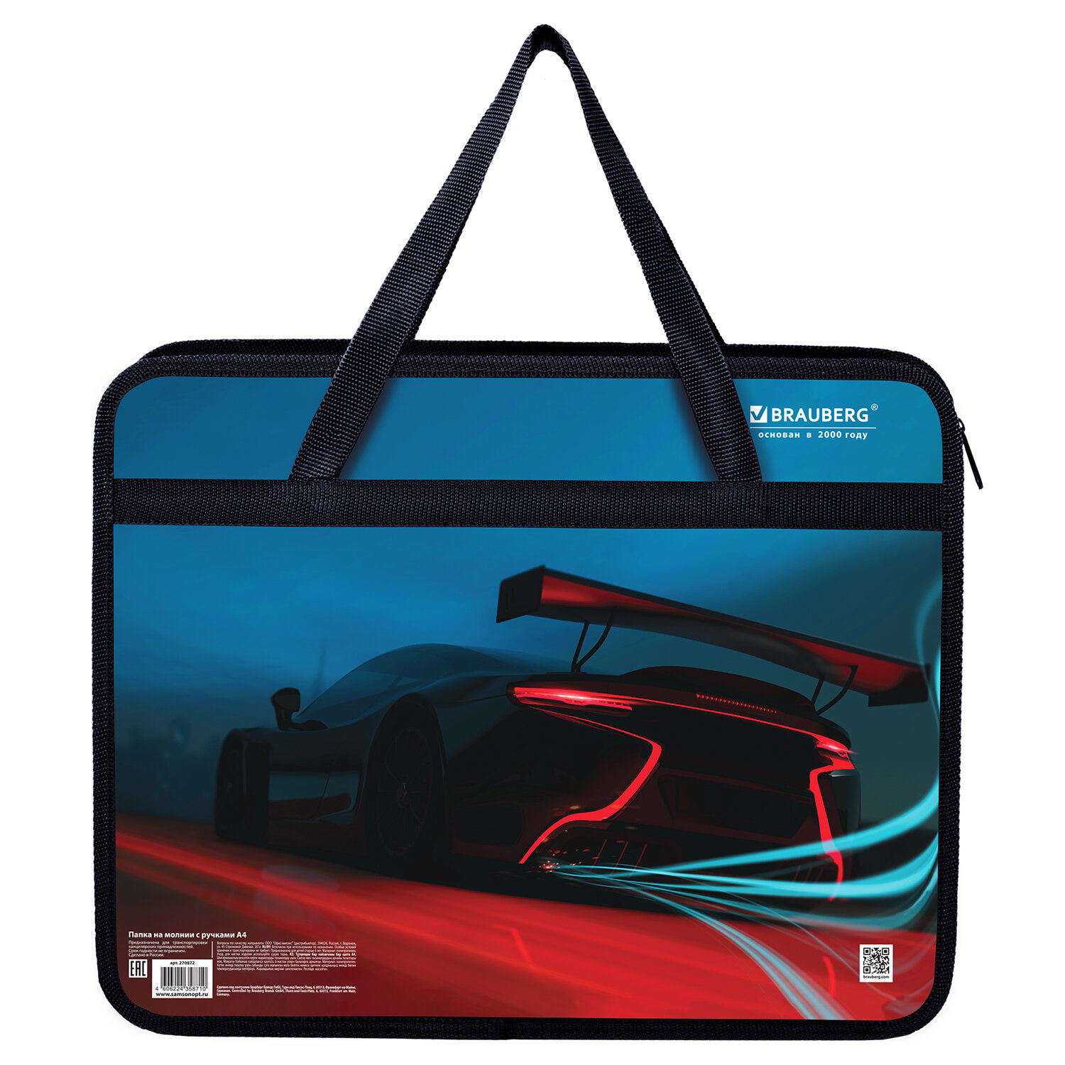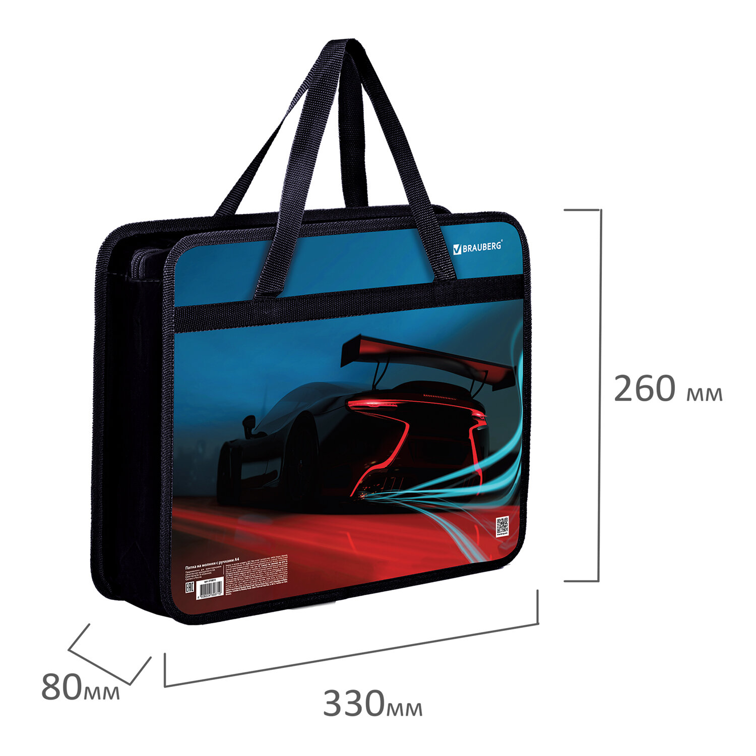 Папка на молнии с ручками BRAUBERG А4, 1 отделение, пластик, 80 мм, "Speed" Код товара: 270872 311,66 ₽ Купить Производитель:BRAUBERG Папка на молнии с ручками BRAUBERG А4 "Speed" предназначена для транспортировки и хранения канцелярских принадлежностей и учебных пособий. Папка защитит содержимое от замятий и повреждений. Идеально подходит для внешкольных занятий. Папка-сумка с ручками подходит для бумаг, документов и учебных пособий формата А4. Изготовлена из прочного износостойкого пластика с тканевой окантовкой по краям. Размер папки – 330х260 мм, ширина – 80 мм. Широкий формат товара позволяет разместить большое количество канцелярских принадлежностей для творчества внутри, в том числе стакан-непроливайку. Папка имеет удобную застежку-молнию сверху. Прочные ручки с надежным креплением к папке, изготовленные из тесьмы, способствуют комфортной переноске при большой нагрузке. Индивидуальная упаковка (полиэтиленовый пакет с европодвесом) сохраняет товар при транспортировке и позволяет удобно разместить его для клиента.Производство: РоссияТип товара: папка-сумкаФормат: А4Пол ребенка: для мальчиковКоличество отделений: 1Серия: DREAMДизайн: SpeedЗастежка: молнияРучки: тесьмаТолщина пластика: 0.5 ммТканевая окантовка: даЦветная печать: даМатериал: пластикДлина: 330 ммШирина: 260 ммГлубина: 80 ммЦвет: черный/синийВес: 157 грРазмер упаковки: 1.6 × 33.5 × 27.5 смОбъём: 0.0009 м3Промежуточная упаковка: 30 штТранспортная упаковка: 30 штШтрих-код: 4606224358710 Файлы Сертификат-1.jpg Сертификат-2.jpg Сертификат-3.jpg Сертификат-4.jpg