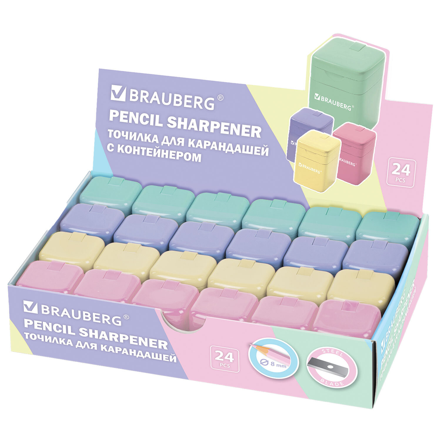 Точилка кросс-серия "PASTEL", с контейнером, корпус ассорти, BRAUBERG Код товара: 273255 34,1 ₽ Купить Производитель:BRAUBERG Точилка BRAUBERG "PASTEL" – незаменимый помощник для юных художников! Точилка прямоугольной формы с контейнером для сбора стружки. Корпус выполнен из пластика. Острое стальное лезвие продуманной конструкции обеспечивает быстрое и безопасное затачивание без повреждения грифеля. Точилка предназначена для цветных и чернографитных карандашей стандартного диаметра. Отверстие для карандаша закрывается крышкой. Выполнена в четырех пастельных цветах ассорти (без возможности выбора цвета). Компактная и эргономичная, эта точилка с легкостью поместится в любой пенал и не потеряется на рабочем столе, а оригинальный дизайн поможет в игровой форме освоить навык затачивания карандашей. Размер – 34х27х24 мм.Производство: КитайКоличество в комплекте: 1 шт.Материал корпуса: пластикФорма корпуса: прямоугольнаяКоличество отверстий: 1Контейнер для стружки: даСерия: КРОСС-СЕРИЯПодходит для левшей: даШторка для закрытия отверстий: даЦвет: пастельный ассортиВысота: 34 ммШирина: 27 ммГлубина: 24 ммУпаковка : дисплейВес: 11 грРазмер упаковки: 2.5 × 3.4 × 2.7 смПромежуточная упаковка: 24 штТранспортная упаковка: 1728 штШтрих-код: 4606224483108 Файлы Сертификат-1.jpg Сертификат-2.jpg Сертификат-3.jpg