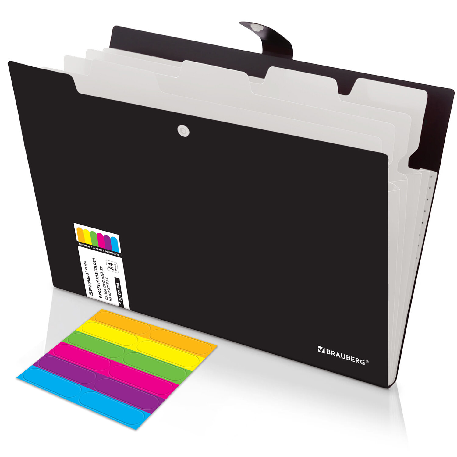 Папка-органайзер на кнопке 5 отделений, BRAUBERG "Extra", А4, черная с белым Код товара: 274094 261,16 ₽ Купить Производитель:BRAUBERG Папка-органайзер BRAUBERG "Extra" предназначена для хранения, транспортировки и систематизации ваших документов и ценных бумаг. Благодаря своей компактности и вместительности незаменима в учебе, работе, деловых поездках, командировках и путешествиях. Папка-органайзер изготовлена из качественного пластика солидного черного цвета толщиной 0,5 мм с фактурой "песок", снабжена разделителями белого цвета. Имеет 5 отделений с ярлыками на разделителях и яркими стикерами (в комплекте), что существенно упрощает процесс поиска нужного документа и позволяет структурировать информацию. Удобный и надежный замок-кнопка дает возможность быстро открывать и закрывать папку, не позволяя содержимому выпасть, и защищает его от влаги, пыли и механических повреждений. Органайзер отлично подойдет для хранения паспортов, СНИЛС, свидетельств о рождении, дипломов, ИНН, офисных документов, школьных тетрадей, рисунков, тетрадей для нот, курсовых работ и многого другого.Производство: КитайФормат: А4Серия: EXTRAКоличество отделений: 5 шт.Фактура: песокЗастежка: КнопкаКоличество карманов: 0 шт.Толщина материала: 0.5 ммИндексные ярлычки: даВысота: 237 ммШирина: 328 ммГлубина: 16 ммМатериал: полипропиленЦвет: белый/черныйВес: 125 грРазмер упаковки: 1 × 26.5 × 33 смОбъём: 0.0007 м3Промежуточная упаковка: 24 штТранспортная упаковка: 24 штШтрих-код: 4606224514529 Файлы Сертификат-1.jpg Сертификат-2.jpg Сертификат-3.jpg Сертификат-4.jpg Сертификат-5.jpg Сертификат-6.jpg Сертификат-7.jpg Сертификат-8.jpg Сертификат-9.jpg Сертификат-10.jpg Сертификат-11.jpg Сертификат-12.jpg Сертификат-13.jpg Сертификат-14.jpg Сертификат-15.jpg Сертификат-16.jpg Сертификат-17.jpg Сертификат-18.jpg Сертификат-19.jpg Сертификат-20.jpg Сертификат-21.jpg Сертификат-22.jpg Сертификат-23.jpg Сертификат-24.jpg Сертификат-25.jpg Сертификат-26.jpg