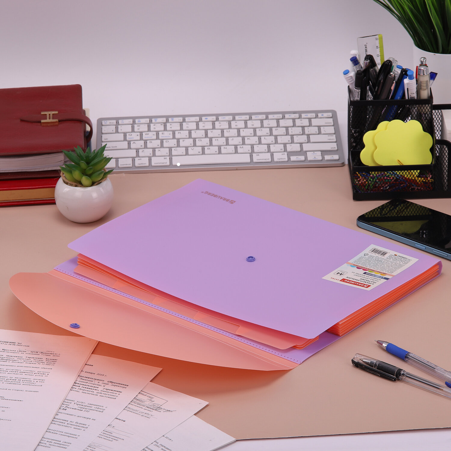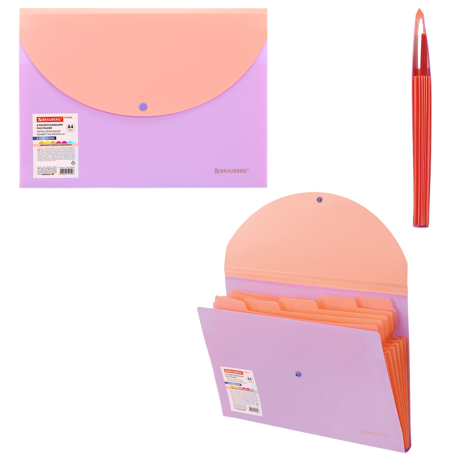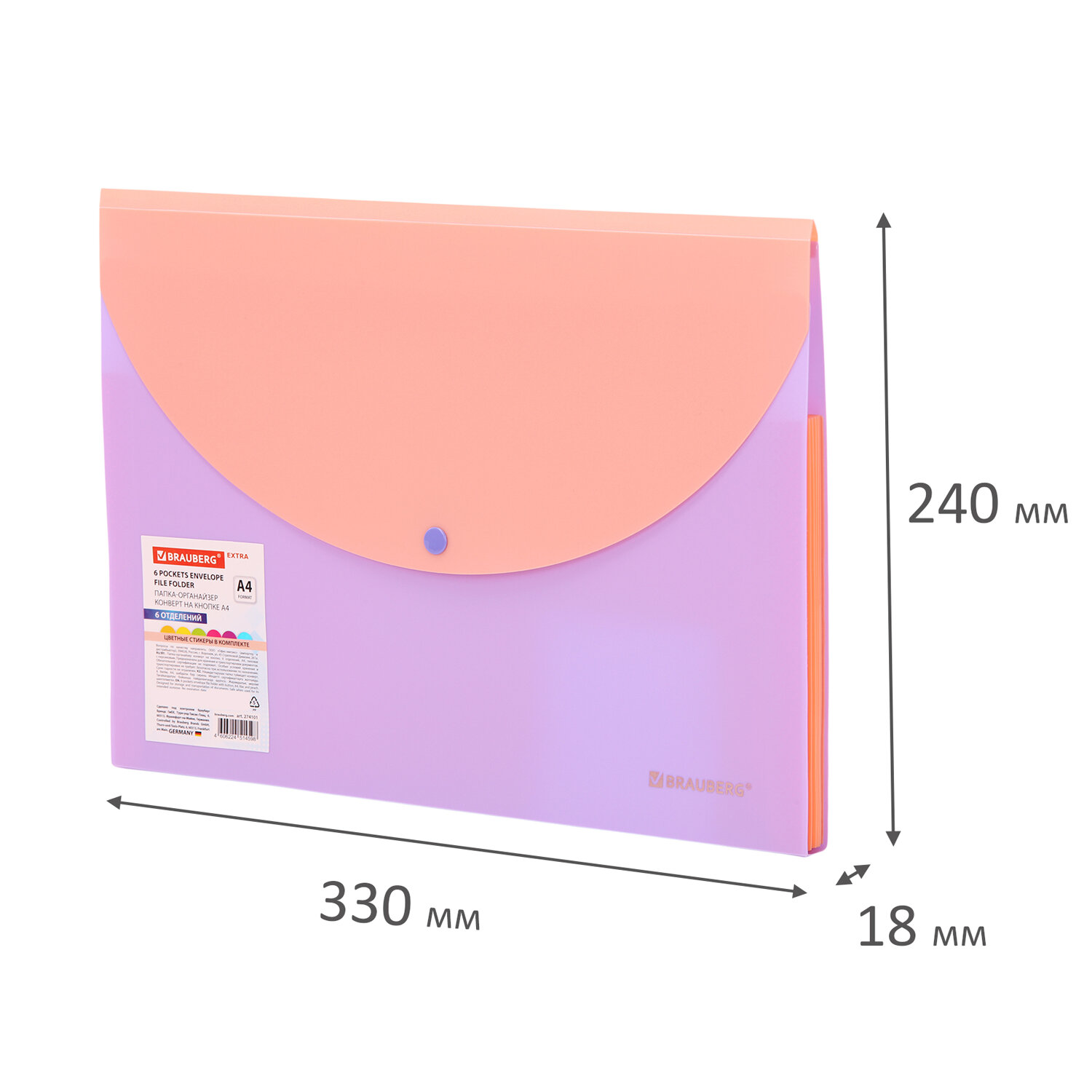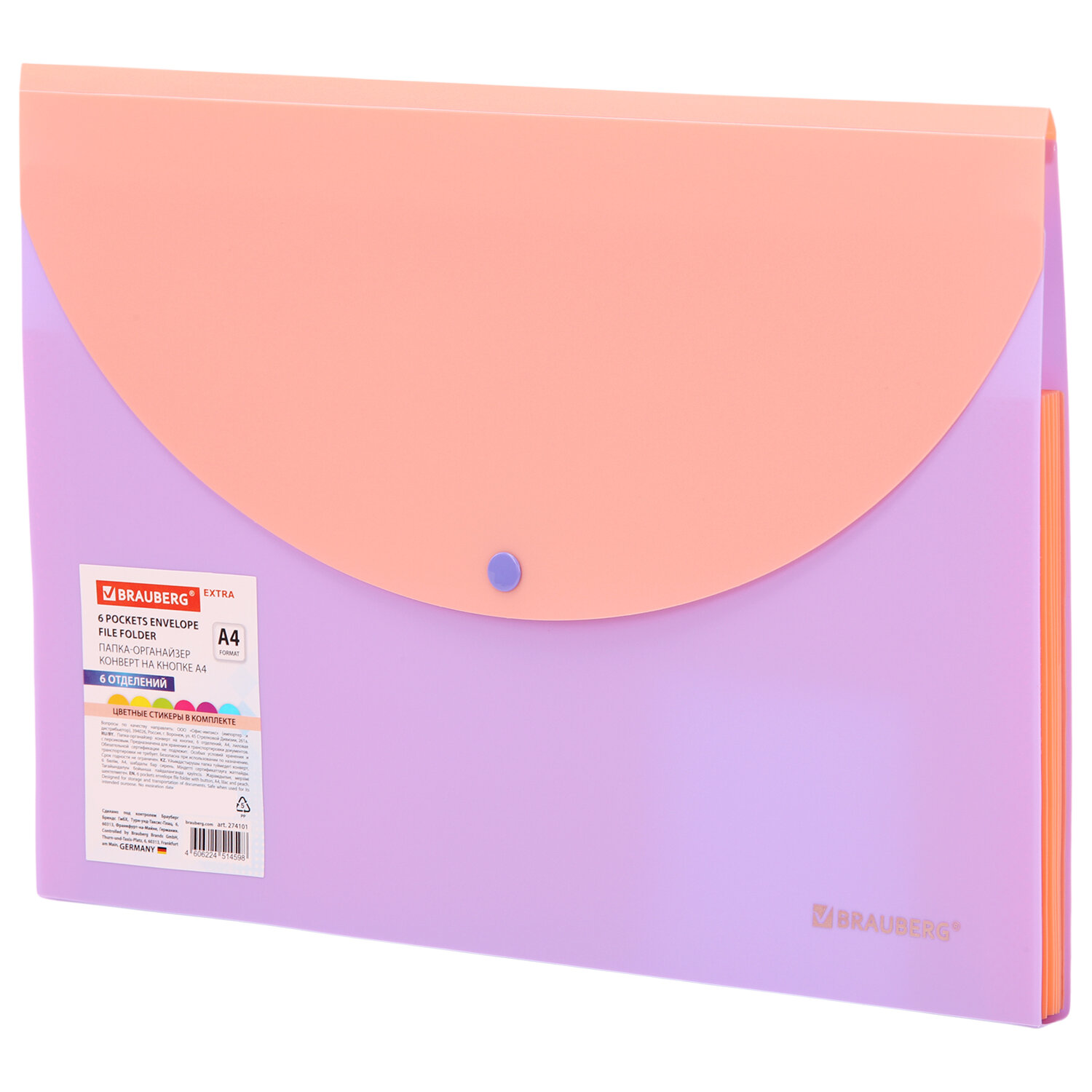 Папка-органайзер конверт на кнопке 6 отделений, BRAUBERG "Extra", A4, лиловая с персиковым Код товара: 274101 278,12 ₽ Купить Производитель:BRAUBERG Папка-органайзер BRAUBERG "Extra" предназначена для хранения, транспортировки и систематизации ваших документов и ценных бумаг. Благодаря своей компактности и вместительности незаменима в учебе, работе, деловых поездках, командировках и путешествиях. Папка-органайзер изготовлена из качественного пластика привлекательного лилового цвета толщиной 0,5 мм с фактурой "песок", снабжена разделителями персикового цвета. Имеет 6 отделений с ярлыками на разделителях и яркими стикерами (в комплекте), что существенно упрощает процесс поиска нужного документа и позволяет структурировать информацию. Удобный и надежный замок-кнопка дает возможность быстро открывать и закрывать папку, не позволяя содержимому выпасть, и защищает его от влаги, пыли и механических повреждений. Органайзер отлично подойдет для хранения паспортов, СНИЛС, свидетельств о рождении, дипломов, ИНН, офисных документов, школьных тетрадей, рисунков, тетрадей для нот, курсовых работ и многого другого.Производство: КитайФормат: А4Серия: EXTRA_1Количество отделений: 6 шт.Фактура: песокЗастежка: КнопкаКоличество карманов: 0 шт.Толщина материала: 0.5 ммИндексные ярлычки: даВысота: 240 ммШирина: 330 ммГлубина: 18 ммМатериал: полипропиленЦвет: розовый/фиолетовыйВес: 172 грРазмер упаковки: 2 × 32.9 × 24.9 смОбъём: 0.0013 м3Промежуточная упаковка: 24 штТранспортная упаковка: 24 штШтрих-код: 4606224514598 Файлы Сертификат-1.jpg Сертификат-2.jpg Сертификат-3.jpg Сертификат-4.jpg Сертификат-5.jpg Сертификат-6.jpg Сертификат-7.jpg Сертификат-8.jpg Сертификат-9.jpg Сертификат-10.jpg Сертификат-11.jpg Сертификат-12.jpg Сертификат-13.jpg Сертификат-14.jpg Сертификат-15.jpg Сертификат-16.jpg Сертификат-17.jpg Сертификат-18.jpg Сертификат-19.jpg Сертификат-20.jpg Сертификат-21.jpg Сертификат-22.jpg Сертификат-23.jpg Сертификат-24.jpg Сертификат-25.jpg Сертификат-26.jpg Сертификат-27.jpg Сертификат-28.jpg