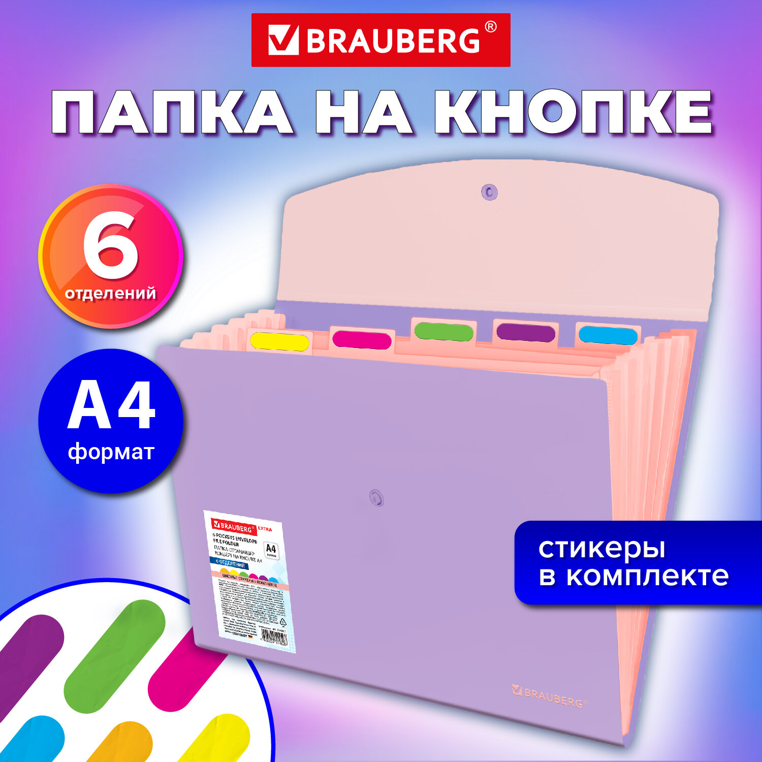 Папка-органайзер конверт на кнопке 6 отделений, BRAUBERG "Extra", A4, лиловая с персиковым Код товара: 274101 278,12 ₽ Купить Производитель:BRAUBERG Папка-органайзер BRAUBERG "Extra" предназначена для хранения, транспортировки и систематизации ваших документов и ценных бумаг. Благодаря своей компактности и вместительности незаменима в учебе, работе, деловых поездках, командировках и путешествиях. Папка-органайзер изготовлена из качественного пластика привлекательного лилового цвета толщиной 0,5 мм с фактурой "песок", снабжена разделителями персикового цвета. Имеет 6 отделений с ярлыками на разделителях и яркими стикерами (в комплекте), что существенно упрощает процесс поиска нужного документа и позволяет структурировать информацию. Удобный и надежный замок-кнопка дает возможность быстро открывать и закрывать папку, не позволяя содержимому выпасть, и защищает его от влаги, пыли и механических повреждений. Органайзер отлично подойдет для хранения паспортов, СНИЛС, свидетельств о рождении, дипломов, ИНН, офисных документов, школьных тетрадей, рисунков, тетрадей для нот, курсовых работ и многого другого.Производство: КитайФормат: А4Серия: EXTRAКоличество отделений: 6 шт.Фактура: песокЗастежка: КнопкаКоличество карманов: 0 шт.Толщина материала: 0.5 ммИндексные ярлычки: даВысота: 240 ммШирина: 330 ммГлубина: 18 ммМатериал: полипропиленЦвет: розовый/фиолетовыйВес: 125 грРазмер упаковки: 1 × 26.5 × 33 смОбъём: 0.0007 м3Промежуточная упаковка: 24 штТранспортная упаковка: 24 штШтрих-код: 4606224514598 Файлы Сертификат-1.jpg Сертификат-2.jpg Сертификат-3.jpg Сертификат-4.jpg Сертификат-5.jpg Сертификат-6.jpg Сертификат-7.jpg Сертификат-8.jpg Сертификат-9.jpg Сертификат-10.jpg Сертификат-11.jpg Сертификат-12.jpg Сертификат-13.jpg Сертификат-14.jpg Сертификат-15.jpg Сертификат-16.jpg Сертификат-17.jpg Сертификат-18.jpg Сертификат-19.jpg Сертификат-20.jpg Сертификат-21.jpg Сертификат-22.jpg Сертификат-23.jpg Сертификат-24.jpg Сертификат-25.jpg Сертификат-26.jpg