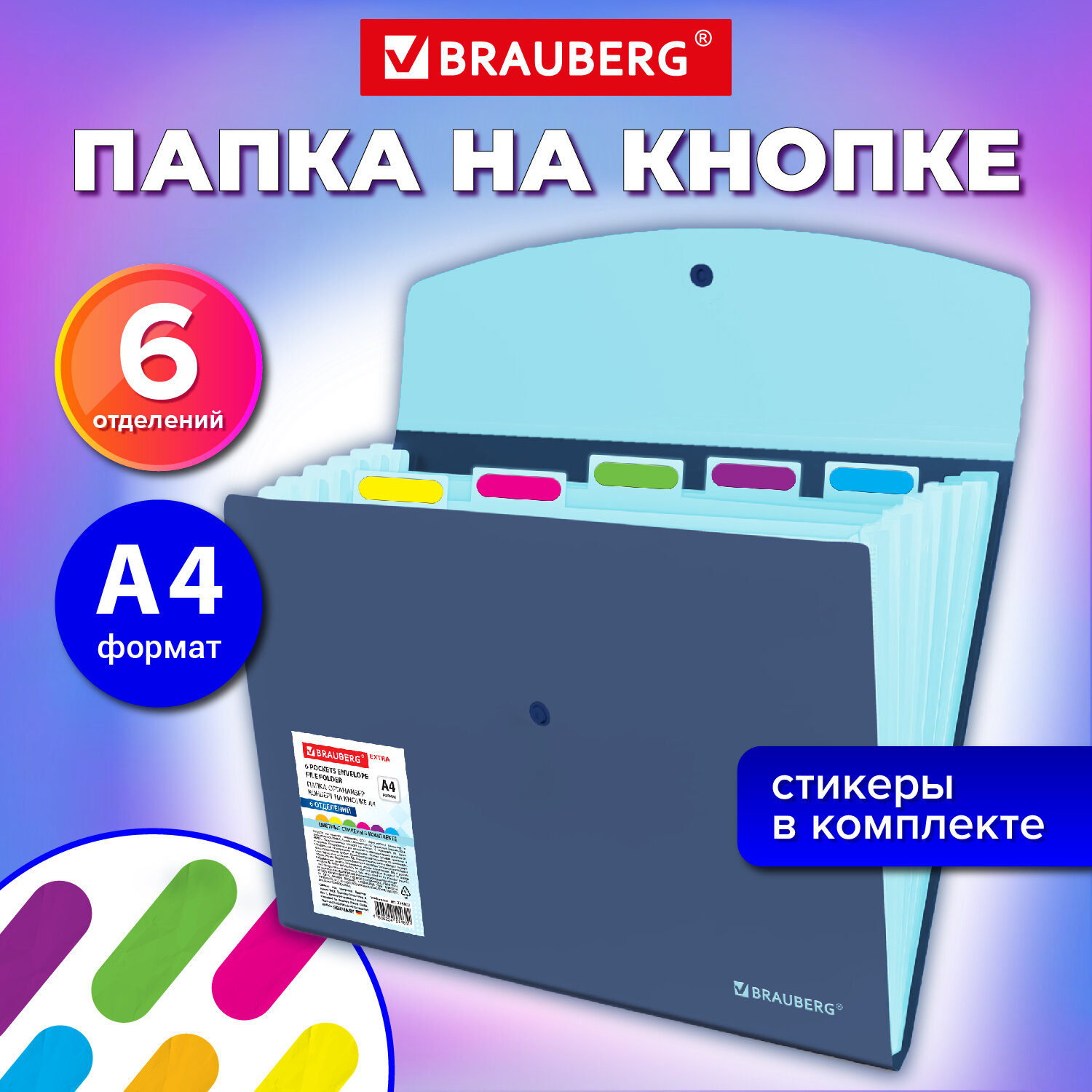 Папка-органайзер конверт на кнопке 6 отделений, BRAUBERG "Extra", A4, синяя с голубым Код товара: 274103 278,12 ₽ Купить Производитель:BRAUBERG Папка-органайзер BRAUBERG "Extra" предназначена для хранения, транспортировки и систематизации ваших документов и ценных бумаг. Благодаря своей компактности и вместительности незаменима в учебе, работе, деловых поездках, командировках и путешествиях. Папка-органайзер изготовлена из качественного пластика солидного синего цвета толщиной 0,5 мм с фактурой "песок", снабжена разделителями голубого цвета. Имеет 6 отделений с ярлыками на разделителях и яркими стикерами (в комплекте), что существенно упрощает процесс поиска нужного документа и позволяет структурировать информацию. Удобный и надежный замок-кнопка дает возможность быстро открывать и закрывать папку, не позволяя содержимому выпасть, и защищает его от влаги, пыли и механических повреждений. Органайзер отлично подойдет для хранения паспортов, СНИЛС, свидетельств о рождении, дипломов, ИНН, офисных документов, школьных тетрадей, рисунков, тетрадей для нот, курсовых работ и многого другого.Производство: КитайФормат: А4Серия: EXTRAКоличество отделений: 6 шт.Фактура: песокЗастежка: КнопкаКоличество карманов: 0 шт.Толщина материала: 0.5 ммИндексные ярлычки: даВысота: 240 ммШирина: 330 ммГлубина: 18 ммМатериал: полипропиленЦвет: голубой/синийВес: 125 грРазмер упаковки: 1 × 26.5 × 33 смОбъём: 0.0007 м3Промежуточная упаковка: 24 штТранспортная упаковка: 24 штШтрих-код: 4606224514611 Файлы Сертификат-1.jpg Сертификат-2.jpg Сертификат-3.jpg Сертификат-4.jpg Сертификат-5.jpg Сертификат-6.jpg Сертификат-7.jpg Сертификат-8.jpg Сертификат-9.jpg Сертификат-10.jpg Сертификат-11.jpg Сертификат-12.jpg Сертификат-13.jpg Сертификат-14.jpg Сертификат-15.jpg Сертификат-16.jpg Сертификат-17.jpg Сертификат-18.jpg Сертификат-19.jpg Сертификат-20.jpg Сертификат-21.jpg Сертификат-22.jpg Сертификат-23.jpg Сертификат-24.jpg Сертификат-25.jpg Сертификат-26.jpg