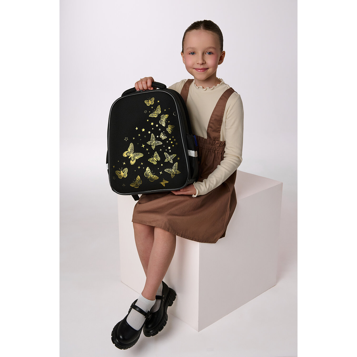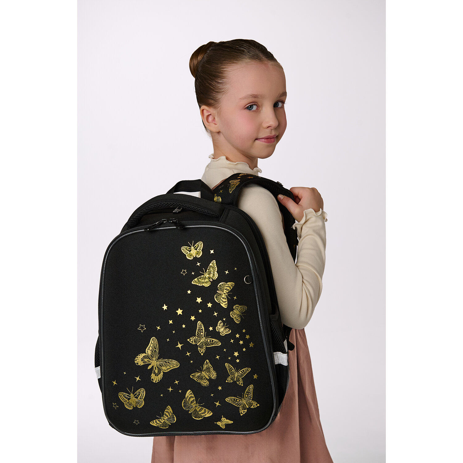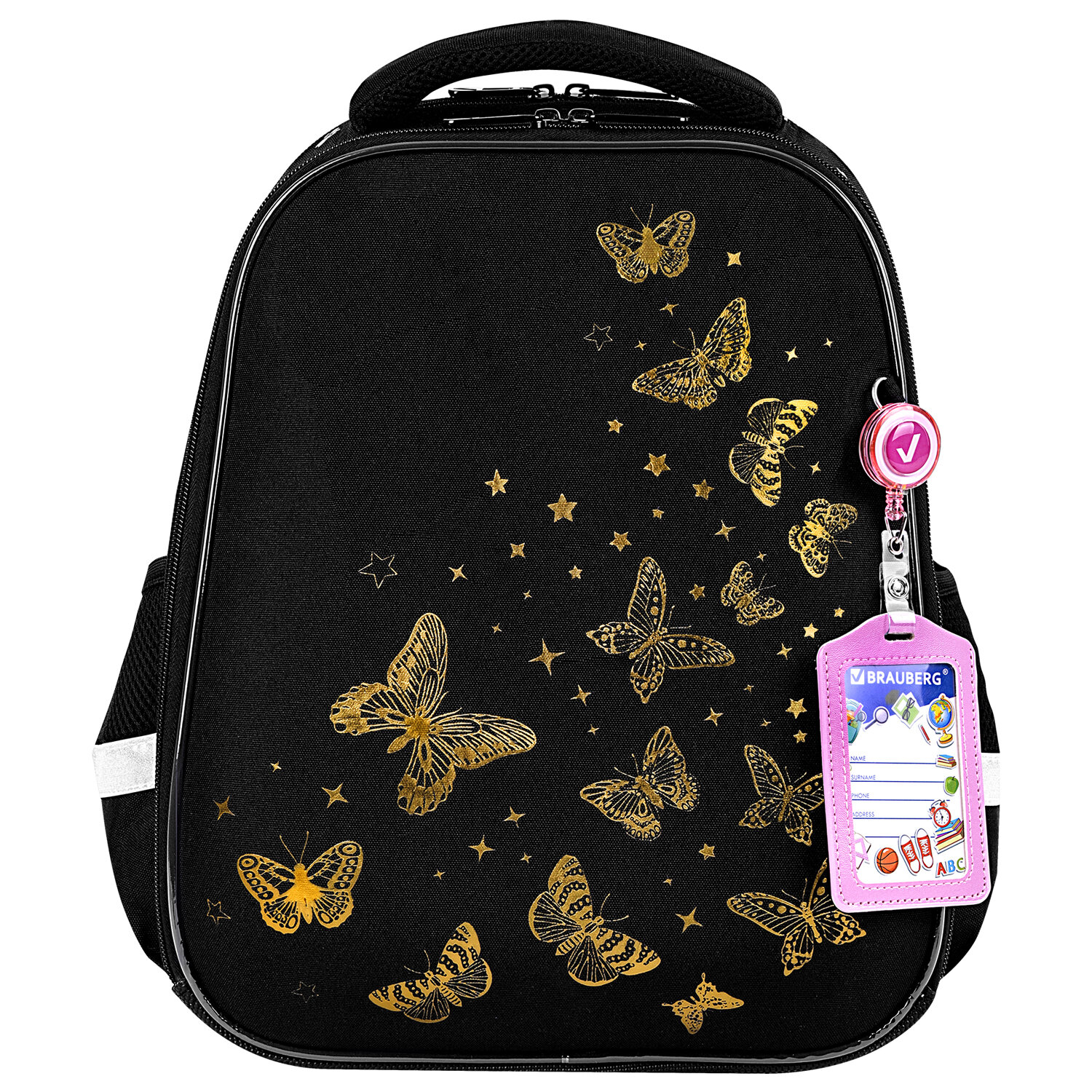 Ранец BRAUBERG FIT, 2 отделения, "Golden butterflies", 38х27х14 см Код товара: 274383 4 389,91 ₽ Купить Производитель:BRAUBERG Ранец BRAUBERG серии FIT изготовлен из легкого, формоустойчивого, экологичного материала EVA. Серия ранцев предназначена для учеников 7-11 лет. Ранцы имеют эргономичную вентилируемую спинку и фиксирующий нагрудный ремешок. Бейдж в комплекте. Ранцы BRAUBERG FIT протестированы НИИ гигиены и охраны здоровья детей и подростков ФГАУ "Национальный медицинский исследовательский центр здоровья детей". В рамках проведенных исследований* было установлено, что конструкции и материалы ученических ранцев соответствуют современным эргономическим требованиям и способствуют формированию здоровой осанки у школьников. Рисунок на передней панели ранца выполнен с применением золотой краски. Ранец покрыт высококачественной влагоотталкивающей нейлоновой тканью с приятной шелковистой поверхностью. Эта ткань легко чистится. Регулируемые по длине S-образные лямки можно оптимально подогнать под комплекцию ребенка, чтобы ранец носился с комфортом, несмотря на избыточный вес содержимого: учебников, тетрадей, канцтоваров. Регулируемый в двух направлениях нагрудный ремешок с фиксатором-защелкой поможет правильно распределить нагрузку. При правильной регулировке ранец практически не будет ощущаться на плечах и не будет доставлять дискомфорт. Удобная мягкая вентилируемая спинка с воздушными спонжевыми панелями разработана с учетом анатомических особенностей детей младшего школьного возраста. В процессе эксплуатации конструкция ранца позволит сохранить правильную осанку. В основном отделении ранца можно легко и быстро разместить учебники и тетради. Внутри основного отделения находится именная карточка школьника и большое отделение из сетки. Такая организация пространства поможет держать принадлежности в сохранности и приучить ребенка к порядку. Ранец широко раскрывается, повышая удобство использования, а благодаря боковым перегородкам содержимое не выскользнет из ранца. Ранец легко открывать и закрывать одной рукой с любой стороны – каждое отделение имеет долговечную реверсивную молнию с двумя металлическими бегунками. В боковых карманах на резинке можно разместить бутылочку, термос или зонт. На спинке ранца находится отделение на молнии для ценных вещей. Нести ранец будет удобно не только на плечах, но и в руке за прочную уплотненную ручку. Светоотражающие элементы ранца расположены спереди, на торцах и на лямках. Они необходимы для безопасности ребенка на дороге в темное время суток. Имеются резиновые ножки для устойчивости и защиты от загрязнений. В комплекте с ранцем поставляется бейдж для пропуска на рулетке. Для его надежной фиксации на одной из лямок ранца имеется специальное металлическое кольцо. Это очень удобно и экономит массу времени – ребенок просто прикладывает пропуск к турникету, вытягивая его на нужное расстояние, а рулетка автоматически возвращает его обратно. Пропуск всегда под рукой! Яркая этикетка расположена на передней стороне ранца, делая его более заметным на полке магазина, а информация в ней отражает главные потребительские свойства, помогая покупателю принять решение о покупке. Ранец упакован в плотный ПЭТ-пакет с замком Zip Lock, который сохранит качество и товарный вид при хранении и транспортировке. *Заключен