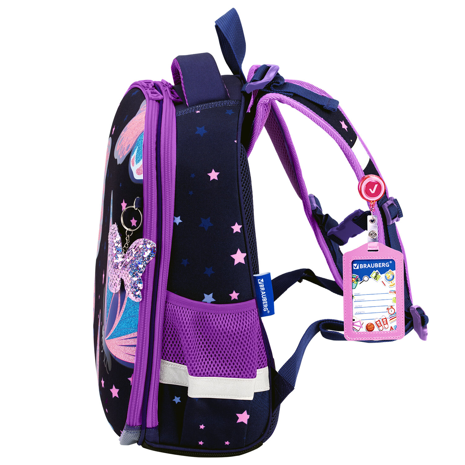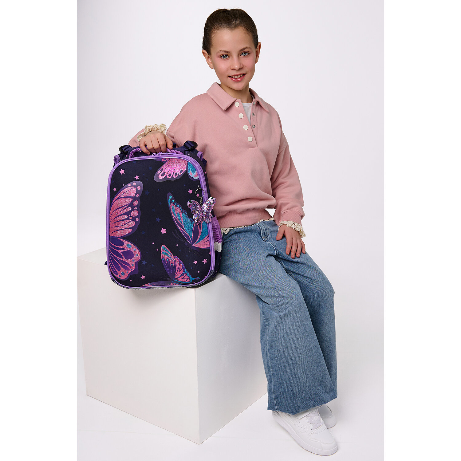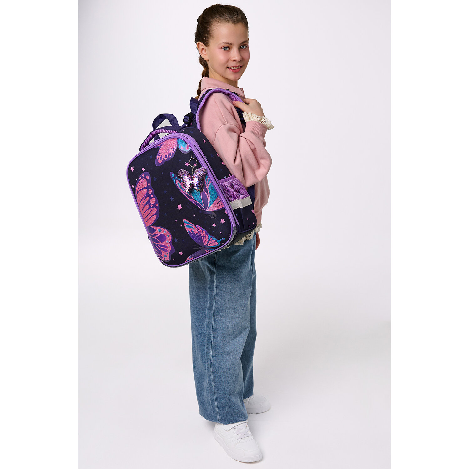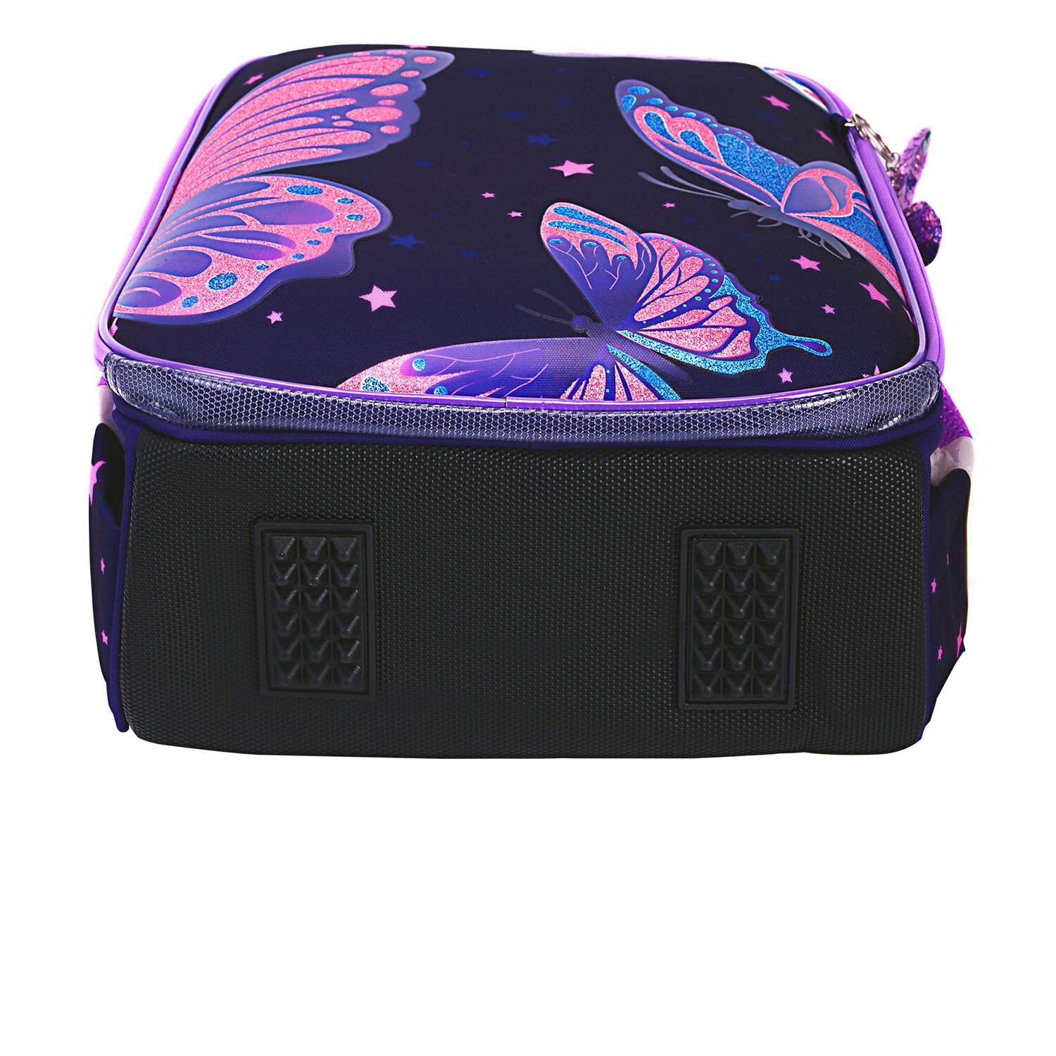 Бабочки на передней панели ранца выполнены печатью с переливающимися блестками!