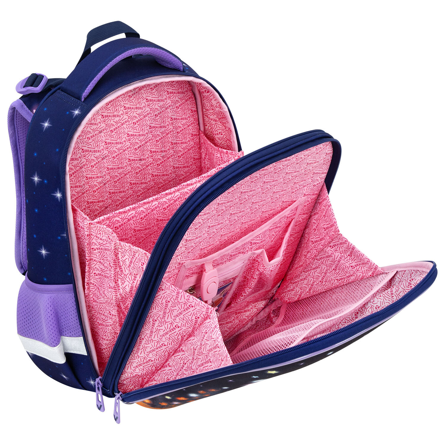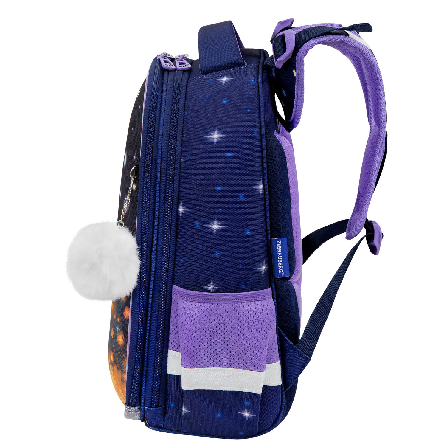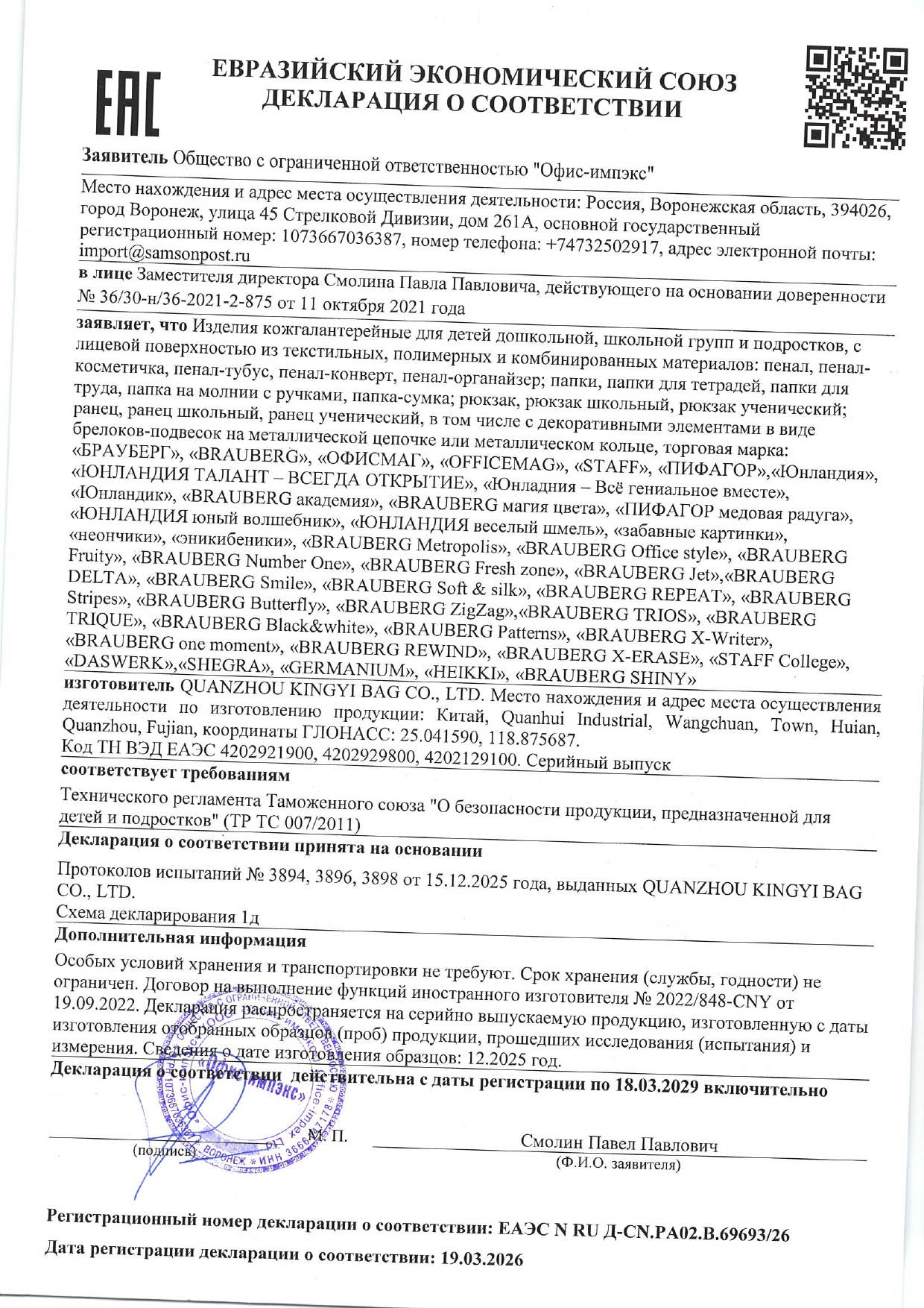 Ранец BRAUBERG ORIGINAL, 2 отделения, с брелком, "Dreaming fox", 38х29х16 см Код товара: 274404 3 751,24 ₽ Купить Производитель:BRAUBERG Ранец BRAUBERG серии ORIGINAL – самой популярной капсульной формы среди ранцев. Изготовлен из легкого, формоустойчивого, экологичного материала EVA с качественной и яркой печатью. В комплекте с ранцем поставляется брелок-подвеска. Ранцы BRAUBERG ORIGINAL протестированы НИИ гигиены и охраны здоровья детей и подростков ФГАУ "Национальный медицинский исследовательский центр здоровья детей". В рамках проведенных исследований* было установлено, что конструкции и материалы ученических ранцев соответствуют современным эргономическим требованиям и способствуют формированию здоровой осанки у школьников. Рисунок на передней панели ранца выполнен с применением ярких контрастных цветов, а пушистый брелок-подвеска дополняет дизайн ранца. Ранец покрыт высококачественной влагоотталкивающей нейлоновой тканью – кордура, в которой за счёт особой структуры нити достигнута четырёхкратная стойкость к истиранию по сравнению с обычным нейлоном. Кроме того, эта ткань легко чистится. Регулируемые по длине и высоте лямки можно оптимально подогнать под комплекцию ребенка, чтобы ранец носился с комфортом, несмотря на зачастую избыточный вес содержимого: учебников, тетрадей, канцелярских принадлежностей. Регулировка позволит использовать ранец не один год. Съёмные нагрудные ремешки помогают равномерно распределять нагрузку на спину. Удобная мягкая вентилируемая спинка с воздушными спонжевыми панелями разработана с учетом анатомических особенностей детей младшего школьного возраста. При правильной регулировке ранец будет практически не ощущаться на плечах и не будет доставлять дискомфорт при носке. В процессе эксплуатации равномерное распределение нагрузки позволит сохранить правильную осанку! В основном отделении ранца можно легко и быстро разместить учебники. Внутри фронтального отделения находится органайзер для канцтоваров, именная карточка, карман для телефона и большое отделение из сетки. Такая организация пространства поможет держать принадлежности в сохранности и приучить ребенка к порядку. Ранец широко раскрывается, повышая удобство использования, а за счёт боковых перегородок содержимое не выскользнет из ранца. Ранец легко открывать и закрывать одной рукой с любой стороны – каждое отделение имеет долговечную реверсивную молнию с двумя металлическими бегунками. Нести ранец будет удобно не только на плечах, но и в руке за прочную уплотненную ручку. Также имеется специальная петелька из плетеной нейлоновой нити для подвешивания на крючок парты. Модель имеет боковые карманы на резинке, в которых можно разместить бутылочку, термос или зонт. Светоотражающие элементы ранца расположены спереди, на торцах и на лямках. Они необходимы для безопасности ребенка в темное время суток. Декоративный брелок-подвеска в подарок. Яркая этикетка расположена на передней стороне ранца, делая его более заметным на полке магазина. Информация на ней отражает основные потребительские свойства, помогая покупателю принять решение о покупке. Ранец упакован в плотный ПЭТ-пакет с замком Zip Lock, который сохранит качество и товарный вид изделия при хранении и транспортировке. Рюкзаки и ранцы BRAUBERG – это высокое качество и проработанные до мелочей моде