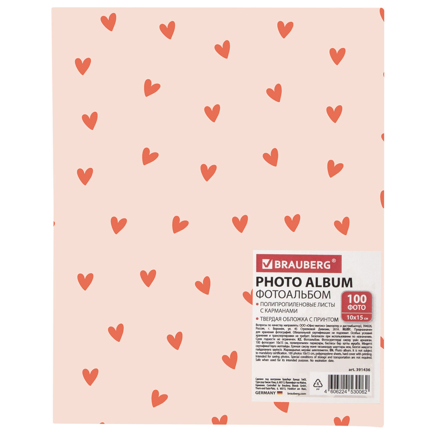 Фотоальбом BRAUBERG "Pink hearts" на 100 фото 10х15 см, твердая обложка Код товара: 391436 302,33 ₽ Купить Производитель:BRAUBERG Фотоальбом BRAUBERG станет настоящей коллекцией памятных дат и событий, а также отличным подарком. Состоит из 50 полипропиленовых листов размером 12х15,15 см с карманами и вмещает 100 фотографий размером 10х15 см по 2 штуки на странице. На обложке фотоальбома изображен трендовый принт с сердечками, а листы склеены в единый блок. Размер альбома – 13х17 см.Производство: КитайТип листов: полипропиленовые листы с карманамиМакс. количество фотографий: 100 штРазмер фотографий: 10х15 смТип обложки: твердаяБазовый цвет обложки: белыйДизайн: СердечкоКоличество листов: 50 шт.Размер листа: 12х15,15 смСкрепление страниц: термосваркаЦвет страниц: белыйВысота альбома: 17 смШирина альбома: 13 смШирина корешка: 5 смУпаковка: термоусадочная пленкаВес: 215 грРазмер упаковки: 5.2 × 16.7 × 13.1 смОбъём: 0.0011 м3Промежуточная упаковка: 24 штТранспортная упаковка: 24 штШтрих-код: 4606224530062 Файлы Сертификат-1.jpg Сертификат-2.jpg Сертификат-3.jpg Сертификат-4.jpg Сертификат-5.jpg Сертификат-6.jpg Сертификат-7.jpg Сертификат-8.jpg Сертификат-9.jpg Сертификат-10.jpg Сертификат-11.jpg Сертификат-12.jpg Сертификат-13.jpg Сертификат-14.jpg Сертификат-15.jpg Сертификат-16.jpg Сертификат-17.jpg Сертификат-18.jpg Сертификат-19.jpg Сертификат-20.jpg Сертификат-21.jpg Сертификат-22.jpg Сертификат-23.jpg Сертификат-24.jpg Сертификат-25.jpg Сертификат-26.jpg