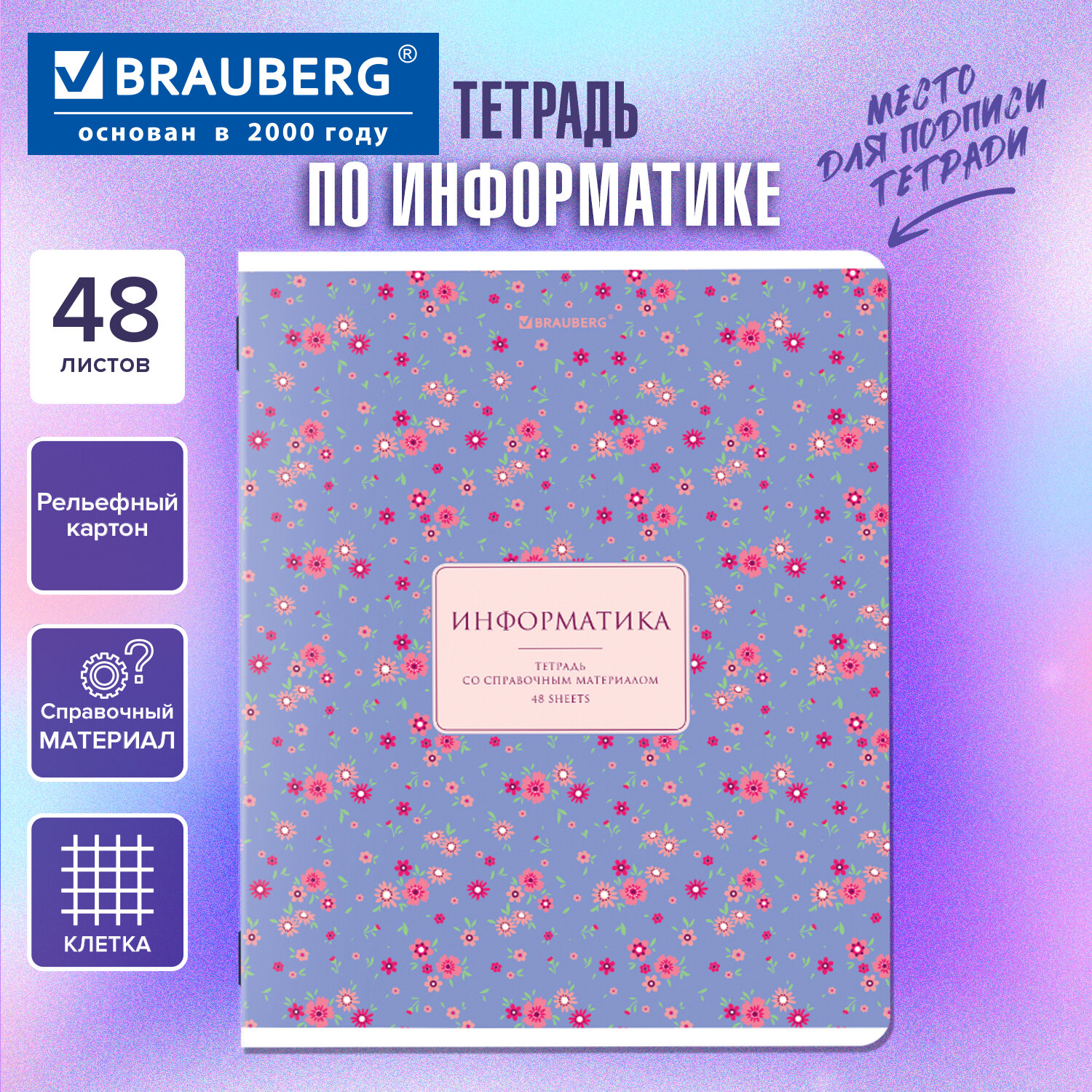 Тетрадь предметная "BLOSSOM" 48 л., рельефный картон, ИНФОРМАТИКА, клетка, подсказки, BRAUBERG Код товара: 405596 56,19 ₽ Купить Производитель:BRAUBERG Предметная тетрадь BRAUBERG из серии "BLOSSOM" предназначена для учащихся средних и старших классов. Выполнена в современном дизайне. Тетрадь формата А5 (165х205 мм) содержит 48 листов, изготовленных из высококачественной офсетной бумаги плотностью 60 г/м2 и белизной 100%. Листы соединены скобами. Линовка блока – в клетку, красные поля. Обложка выполнена из мелованного картона плотностью 190 г/м2. Рельефная фактура придает изображениям оригинальность. В справочном материале для учащихся собраны основные подсказки по школьному предмету.Производство: РоссияПредмет: информатикаСерия: BLOSSOMКоличество листов: 48Формат: А5Линовка блока: клеткаКрасные поля: даТип скрепления: скобаВнутренний блок: офсетПлотность внутренного блока: 60 г/м2Белизна: 100 %Обложка: мелованный картонДизайн: BLOSSOMПлотность обложки: 190 г/м2Тип спецэффектов на обложке: фактурное тиснениеСправочный материал: даДлина: 205 ммШирина: 165 ммВес: 109 грРазмер упаковки: 0.5 × 20.2 × 16.2 смОбъём: 0.0002 м3Промежуточная упаковка: 10 штТранспортная упаковка: 80 штШтрих-код: 4606224541990 Сертификат-1.jpg Сертификат-2.jpg Сертификат-3.jpg