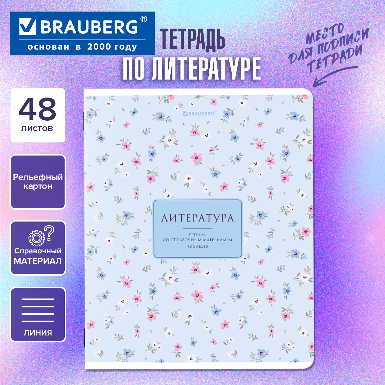 Тетрадь предметная "BLOSSOM" 48 л., рельефный картон, ЛИТЕРАТУРА, линия, подсказки, BRAUBERG Код товара: 405598 56,19 ₽ Купить Производитель:BRAUBERG Предметная тетрадь BRAUBERG из серии "BLOSSOM" предназначена для учащихся средних и старших классов. Выполнена в современном дизайне. Тетрадь формата А5 (165х205 мм) содержит 48 листов, изготовленных из высококачественной офсетной бумаги плотностью 60 г/м2 и белизной 100%. Листы соединены скобами. Линовка блока – в линию, красные поля. Обложка выполнена из мелованного картона плотностью 190 г/м2. Рельефная фактура придает изображениям оригинальность. В справочном материале для учащихся собраны основные подсказки по школьному предмету.Производство: РоссияПредмет: литератураСерия: BLOSSOMКоличество листов: 48Формат: А5Линовка блока: линияКрасные поля: даТип скрепления: скобаВнутренний блок: офсетПлотность внутренного блока: 60 г/м2Белизна: 100 %Обложка: мелованный картонДизайн: BLOSSOMПлотность обложки: 190 г/м2Тип спецэффектов на обложке: фактурное тиснениеСправочный материал: даДлина: 205 ммШирина: 165 ммВес: 108 грРазмер упаковки: 0.5 × 20.4 × 16.3 смОбъём: 0.0002 м3Промежуточная упаковка: 10 штТранспортная упаковка: 80 штШтрих-код: 4606224542010 Файлы Сертификат-1.jpg Сертификат-2.jpg Сертификат-3.jpg Сертификат-4.jpg