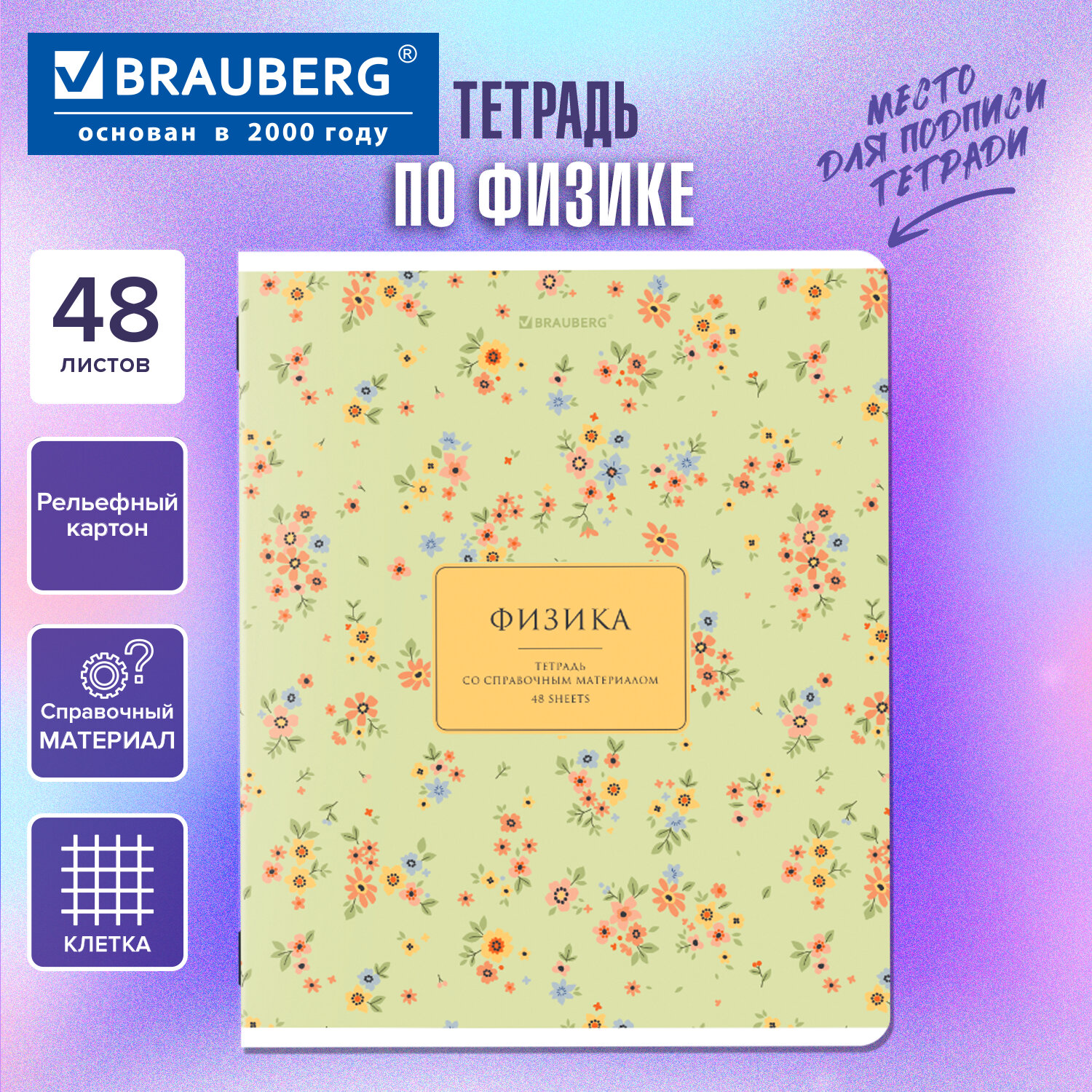 Тетрадь предметная "BLOSSOM" 48 л., рельефный картон, ФИЗИКА, клетка, подсказки, BRAUBERG Код товара: 405600 56,19 ₽ Купить Производитель:BRAUBERG Предметная тетрадь BRAUBERG из серии "BLOSSOM" предназначена для учащихся средних и старших классов. Выполнена в современном дизайне. Тетрадь формата А5 (165х205 мм) содержит 48 листов, изготовленных из высококачественной офсетной бумаги плотностью 60 г/м2 и белизной 100%. Листы соединены скобами. Линовка блока – в клетку, красные поля. Обложка выполнена из мелованного картона плотностью 190 г/м2. Рельефная фактура придает изображениям оригинальность. В справочном материале для учащихся собраны основные подсказки по школьному предмету.Производство: РоссияПредмет: физикаСерия: BLOSSOMКоличество листов: 48Формат: А5Линовка блока: клеткаКрасные поля: даТип скрепления: скобаВнутренний блок: офсетПлотность внутренного блока: 60 г/м2Белизна: 100 %Обложка: мелованный картонДизайн: BLOSSOMПлотность обложки: 190 г/м2Тип спецэффектов на обложке: фактурное тиснениеСправочный материал: даДлина: 205 ммШирина: 165 ммВес: 107 грРазмер упаковки: 0.5 × 20.2 × 16.3 смОбъём: 0.0002 м3Промежуточная упаковка: 10 штТранспортная упаковка: 80 штШтрих-код: 4606224542034 Сертификат-1.jpg Сертификат-2.jpg Сертификат-3.jpg
