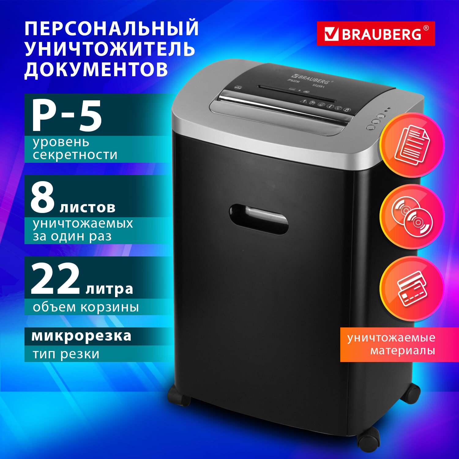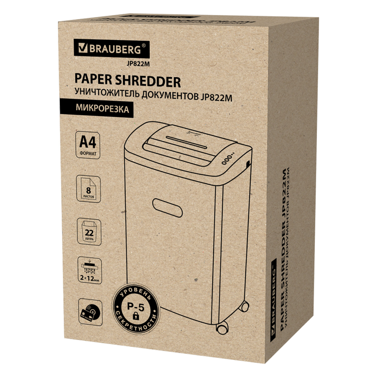 Уничтожитель (шредер) BRAUBERG JP822M, CD, 5 уровень секретности, 2х12 мм, 8 листов, корзина 22 литра Код товара: 532591 15 539,77 ₽ Купить Производитель:BRAUBERG Уничтожитель документов (шредер) BRAUBERG JP822M предназначен для уничтожения документов, компакт-дисков и пластиковых карт (банковских, дисконтных и прочих), потерявших актуальность. Отлично подходит для интенсивного персонального или коллективного использования в малом и среднем офисах. Резка на фрагменты размером 2x12 мм обеспечивает P-5 уровень секретности (DIN 66399). Устройство надежно уничтожит бумажные документы и компакт-диски с очень уязвимыми и конфиденциальными данными, а также персональными данными. Кроме того, надежные ножи способны уничтожать пластиковые карты. Рекомендуемое количество пользователей – от 5 до 10. За один раз уничтожает 8 листов формата А4 и 1 компакт-диск. Объем корзины составляет 22 л. Шредер оснащен защитой двигателя от перегрева, что крайне важно для подобных устройств и является заметным преимуществом товара. Для удобства отслеживания наполняемости корзины отходами в ней предусмотрено прозрачное смотровое окошко. Комплектация: уничтожитель, руководство пользователя, гарантийный талон.Производство: КитайУровень секретности (DIN 66399): P-5Область применения: офисныйВозможности уничтожения: бумаги А4 (80 г/м2), дисков CD и DVD, пластиковых картРекомендуемое кол-во пользователей: 5-10Тип резки: микрорезкаКоличество уничтожаемых листов: 8 А4Резка бумаги на полоски / фрагменты размером: 2x12 ммВремя непрерывной работы: 8 минВремя перерыва: 35 минСредняя скорость резки: 2 м/минОбъем приемной корзины: 22 литр.Ширина входного отверстия: 220 ммУровень шума: 55 дБАвтостарт: даРеверс: даБесшумный: даТехнология "Anti-Jam" предотвращает замятие бумаги: даИндикатор перегрева двигателя: даИндикатор заполнения корзины : даКомплектуется колесиками: даВысота: 53.8 смШирина: 35 смГлубина: 25 смМатериал корпуса: пластикЦвет: черныйВес: 9.2 кгРазмер упаковки: 33 × 41.5 × 65 смОбъём: 0.089 м3Промежуточная упаковка: 1 штТранспортная упаковка: 1 штШтрих-код: 4606224502915 Файлы Сертификат-1.jpg Сертификат-2.jpg