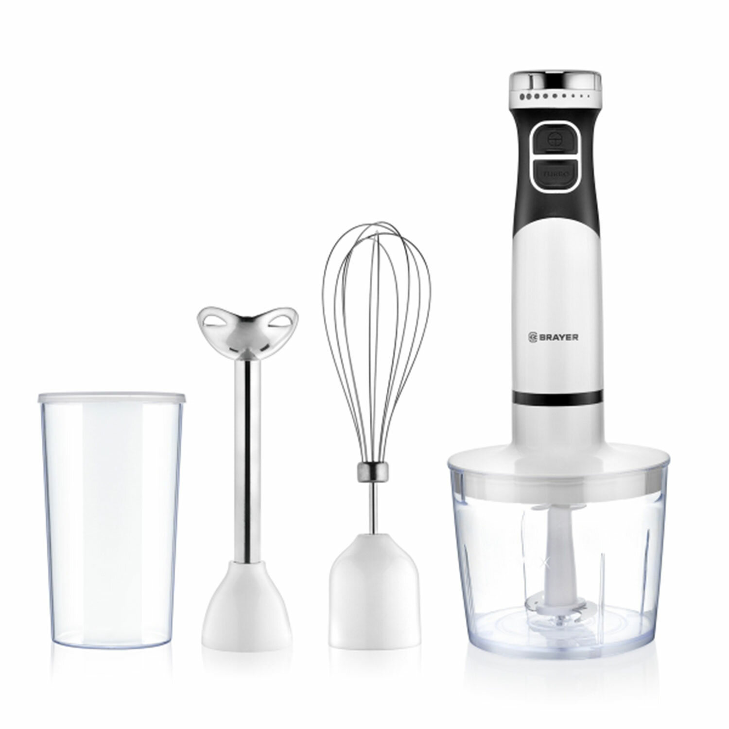 Блендер погружной BRAYER BR1242, 800 Вт, 2 скорости, 3 насадки, стакан, белый Код товара: 456086 3 031,86 ₽ Купить Производитель:BRAYER Погружной блендер BRAYER BR1242 мощностью 800 Вт поможет приготовить разнообразные блюда. Корпус из пластика декорирован нержавеющей сталью. Блендер станет отличным дополнением кухонного интерьера. У блендера BR1242 плавная регулировка скорости и есть Турборежим, благодаря чему Вы сможете как взбить тесто, так и перемолоть орехи в измельчителе. Все рабочие элементы легко снимаются и очищаются от загрязнений. Блендер поставляется с венчиком для взбивания, насадкой-блендером и измельчителем. Насадка-измельчитель. В измельчителе объемом 500 мл Вы сможете нарезать овощи и фрукты, а также порубить орехи. Насадкой-венчиком для взбивания Вы сможете взбить белки, сливки, жидкое тесто. Насадка-блендер для измельчения и смешивания предназначена для приготовления смузи, фруктового пюре и крем-супов. Устройство дополнено системой защиты от перегрева и перегрузки. Производитель оставляет за собой право без предварительного уведомления вносить изменения в технические характеристики, комплектацию и конструкцию, не ухудшающие эксплуатационные характеристики изделия.Производство: КитайТип товара: погружнойМощность: 800 ВтТип управления: механическийТурборежим: даПлавная регулировка скорости: даКоличество скоростей: 2Количество насадок: 3 шт.Измельчитель: даВенчик для взбивания: даЕмкость стакана: 0.7 лЕмкость измельчителя: 0.5 лМатериал корпуса : пластикМатериал чаши: пластикМатериал погружной части: нержавеющая стальЦвет: белыйДлина сетевого шнура: 1 мВысота: 24.5 смШирина: 13.5 смГлубина: 24 смВес: 1.4 кгСерия: BR12Размер упаковки: 14.1 × 24.1 × 24.5 смОбъём: 0.0093 м3Промежуточная упаковка: 6 штТранспортная упаковка: 6 штШтрих-код: 9120099330824 Файлы Приложение-1.pdf Сертификат-1.jpg Сертификат-2.jpg Сертификат-3.jpg Сертификат-4.jpg Сертификат-5.jpg Сертификат-6.jpg Сертификат-7.jpg Сертификат-8.jpg Сертификат-9.jpg Сертификат-10.jpg