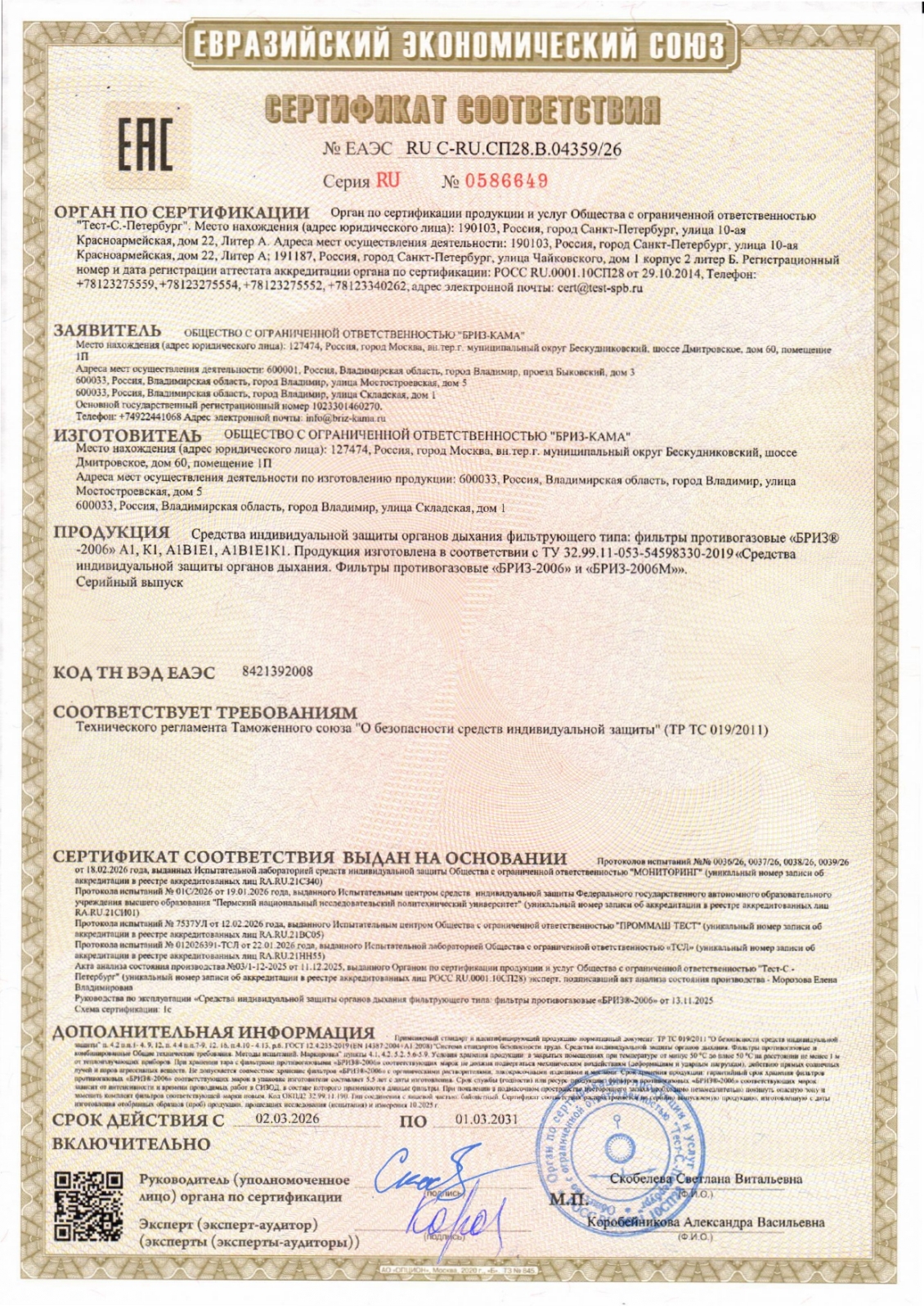 Фильтр противогазовый БРИЗ-2006, комплект 2 шт., органические газы и пары класса А1 Код товара: 610949 674,89 ₽ Купить Производитель:Бриз-Кама Фильтры противогазовые БРИЗ®-2006 марки A1 имеют универсальное байонетное соединение и предназначены для применения в составе различных фильтрующих СИЗОД производства ООО "Бриз-Кама". Предназначены для очистки вдыхаемого человеком воздуха от химически опасных и вредных токсичных веществ в том числе аварийно-химически опасных веществ ингаляционного действия (АХОВИД). Фильтры БРИЗ®-2006 марки A1 защищают от паров органических веществ с температурой кипения свыше 65 °С. Рабочий интервал температур: от -50 до +50 °С. Запрещается применение противогазовых фильтров БРИЗ®-2006 при неизвестном составе загрязняющих воздушную среду веществ в зоне применения фильтров и при концентрации кислорода ниже 17% в воздушной среде зоны применения фильтров. Подходят для полумасок БРИЗ®-4206 (НОТ), маски БРИЗ®-4306 (ЭВР), маски БРИЗ®-6300. Фильтры соответствуют требованиям ГОСТ 12.4.235-2012 (ГОСТ 12.4.235-2019), ТР ТС 019/2011, ТУ 32.99.11-053-54598330-2019. Комплектация: 1) комплект фильтров БРИЗ®-2006 A1; 2) руководство по эксплуатации; 3) полиэтиленовый пакет или пленка БОПП. Cертификат – ТР ТС 019/2011Производство: РоссияТип товара: расходные материалыВид: фильтрСтепень защиты до: A1Класс фильтра: 1Соответствие стандартам: ГОСТ 12.4.235-2012 (ГОСТ 12.4.235-2019), ТР ТС 019/2011, ТУ 32.99.11-053-54598330-2019Количество в упаковке: 2 шт.Способ крепления: байонетВес: 242 грРазмер упаковки: 3.9 × 19.6 × 11.7 смОбъём: 0.0009 м3Промежуточная упаковка: 56 штТранспортная упаковка: 56 штШтрих-код: 4631165605616 Файлы Сертификат-1.jpg Сертификат-2.jpg Сертификат-3.jpg