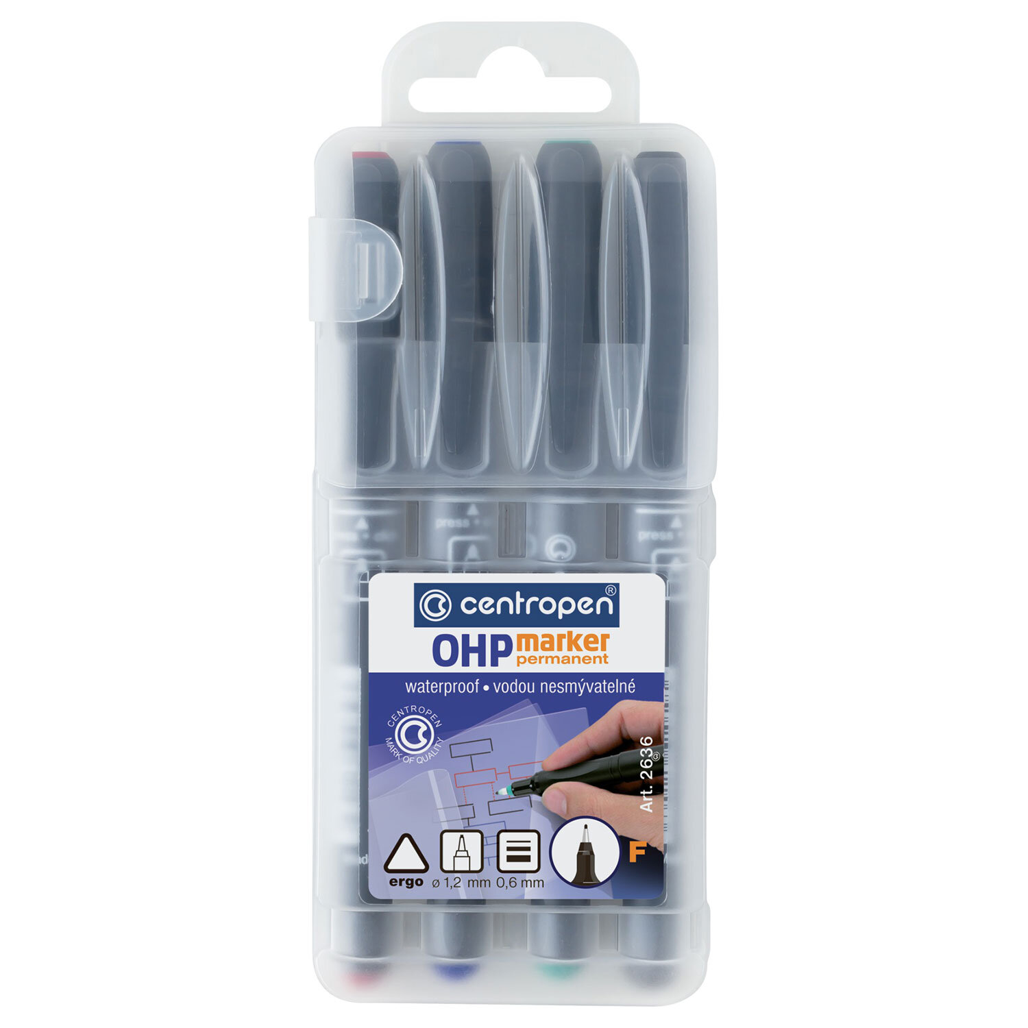 Маркеры перманентные для любой гладкой поверхности 4 ЦВЕТА CENTROPEN "OHP", 0,6 мм, 2 Код товара: 152681 359,18 ₽ Купить Производитель:CENTROPEN Набор перманентных (нестираемых) маркеров CENTROPEN, подходящих для непористых поверхностей. Эргономичная зона обхвата, устойчивые к воде и стиранию. Чернила на спиртовой основе. Набор маркеров перманентных, 4 цвета. Ширина линии письма 0,6 мм. Пригодны для письма по большинству видов поверхностей: бумаге, картону, резине, пластику, металлу, стеклу. Маркер может находиться до 14 дней без колпачка, при этом чернила не высыхают. Фетровый (или пористый) наконечник. Светостойкие, водостойкие, термостойкие чернила. Тонкий наконечник. Товар не предназначен для детей и подростковПроизводство: ЧехияЦвет чернил: ассортиКоличество в комплекте: 4 шт.Форма наконечника: тонкийМинимальная толщина линии письма: 0.6 ммМаксимальная толщина линии письма: 0.6 ммСерия: 2636Подходит для левшей: даВодостойкие чернила: даПовышенная светостойкость: даБыстросохнущие чернила: даНаконечник устойчив к повреждению и истиранию: даФорма корпуса: круглаяМатериал корпуса: пластикНаличие клипа: даОснова чернил: спиртоваяСрок годности: 36 месВес: 46 грРазмер упаковки: 15.8 × 2.4 × 6.3 смОбъём: 0.0002 м3Промежуточная упаковка: 10 штТранспортная упаковка: 50 штШтрих-код: 8595013611326