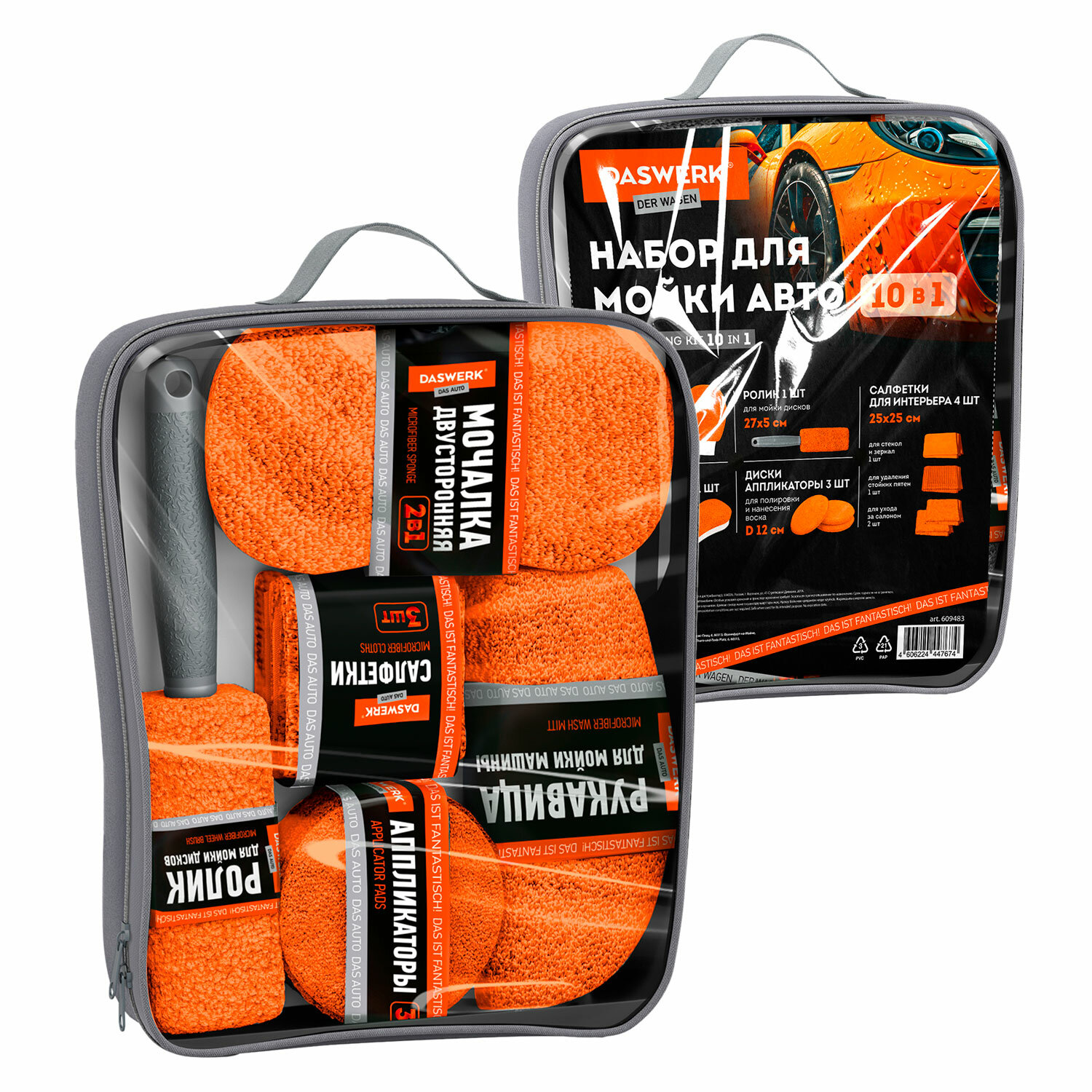 Набор для мойки авто 10 в 1, оранжевый, СУМКА ДЛЯ ХРАНЕНИЯ В КОМПЛЕКТЕ, DASWERK (ДАСВЕРК), 609483 Код товара: 609483 866,48 ₽ Купить Производитель:DASWERK Набор для мойки авто DASWERK идеально подходит для бережной мойки автомобиля как снаружи, так и в салоне. В наборе есть все самое необходимое для ухода за автомобилем. В наборе 10 предметов: • Салфетки – 4 шт., размер – 25х25 см. Салфетка для стекла плотностью 280 г/м2 – 1 шт.; салфетки из микрофибры плотностью 240 г/м2 – 2 шт.; салфетка для удаления разводов плотностью 300 г/м2 – 1 шт. Цвет – оранжевый. • Диски-аппликаторы – 3 шт. Диски-аппликаторы представляют собой губку круглой формы из микрофибры и полиуретана (плотность 230 г/м2). Предназначены для нанесения воска и полировки автомобиля. Края обработаны оверлоком для более бережного нанесения воска. Цвет – оранжевый. • Ролик для мойки дисков и колес поможет избавиться от загрязнений на дисках и в труднодоступных местах благодаря продолговатой чистящей части ролика плотностью 450 г/м2. Край обработан эластичным оверлоком. Цвет – оранжевый. • Рукавица для мойки изготовлена из микрофибры, предназначена для уборки поверхностей от пыли и загрязнений. Плотность материала – 310 г/м2. Благодаря волокнам микрофибры не оставляет разводов и обладает высокой влаговпитываемостью, которая обеспечивает превосходное качество уборки. Может применяться как для интерьера, так и для экстерьера автомобиля. Цвет – оранжевый. • Мочалка имеет двойной функционал. С одной стороны, она является губкой из микрофибры и подходит для бережного вспенивания и мойки автомобиля, также она способна впитывать большое количество жидкости, не оставляя разводов. С другой стороны, это сеточка из полиэстера для удаления стойких пятен с поверхности кузова автомобиля. Плотность микрофибры – 450 г/м2. Край обработан оверлоком. Цвет – оранжевый. В комплект входит удобная сумка серого цвета – она идеально подходит для хранения и транспортировки всего набора.Производство: КитайВид: набор Материал обработки: универсальныйМатериал: тканыйЦвет: оранжевыйКоличество в комплекте: 10 шт.Комплектация: диски-аппликаторы, мочалка, ролик, рукавица, салфетки, сумкаУпаковка: сумка с ручкойВес: 411 грРазмер упаковки: 6 × 30.9 × 25.8 смОбъём: 0.0051 м3Промежуточная упаковка: 50 штТранспортная упаковка: 50 штШтрих-код: 4606224447674 Файлы Сертификат-1.jpg Сертификат-2.jpg Сертификат-3.jpg Сертификат-4.jpg Сертификат-5.jpg Сертификат-6.jpg Сертификат-7.jpg Сертификат-8.jpg Сертификат-9.jpg Сертификат-10.jpg Сертификат-11.jpg Сертификат-12.jpg Сертификат-13.jpg Сертификат-14.jpg Сертификат-15.jpg Сертификат-16.jpg Сертификат-17.jpg Сертификат-18.jpg Сертификат-19.jpg Сертификат-20.jpg Сертификат-21.jpg Сертификат-22.jpg Сертификат-23.jpg Сертификат-24.jpg Сертификат-25.jpg Сертификат-26.jpg