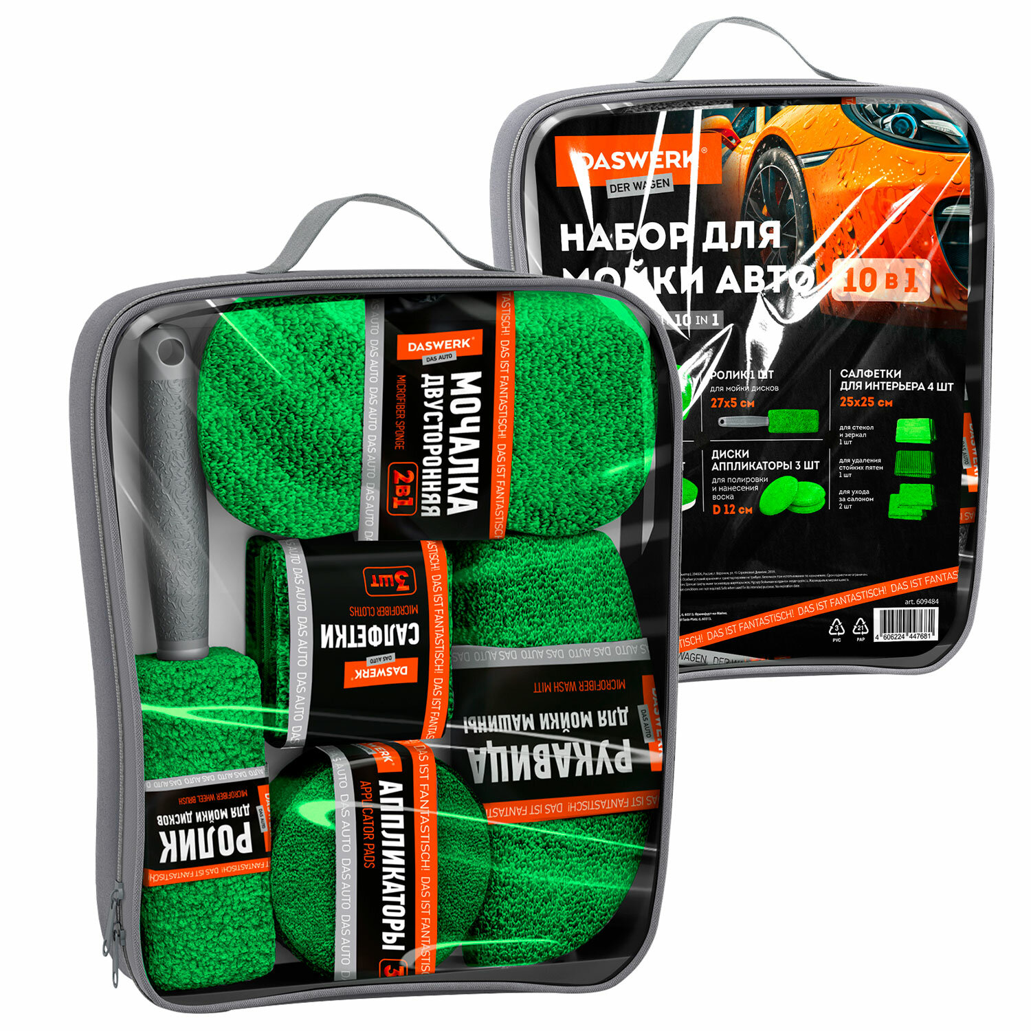 Набор для мойки авто 10 в 1, зеленый, СУМКА ДЛЯ ХРАНЕНИЯ В КОМПЛЕКТЕ, DASWERK (ДАСВЕРК), 609484 Код товара: 609484 866,48 ₽ Купить Производитель:DASWERK Набор для мойки авто DASWERK идеально подходит для бережной мойки автомобиля как снаружи, так и в салоне. В наборе есть все самое необходимое для ухода за автомобилем. В наборе 10 предметов: • Салфетки – 4 шт., размер – 25х25 см. Салфетка для стекла плотностью 280 г/м2 – 1 шт.; салфетки из микрофибры плотностью 240 г/м2 – 2 шт.; салфетка для удаления разводов плотностью 300 г/м2 – 1 шт. Цвет – зеленый. • Диски-аппликаторы – 3 шт. Диски-аппликаторы представляют собой губку круглой формы из микрофибры и полиуретана (плотность 230 г/м2). Предназначены для нанесения воска и полировки автомобиля. Края обработаны оверлоком для более бережного нанесения воска. Цвет – зеленый. • Ролик для мойки дисков и колес поможет избавиться от загрязнений на дисках и в труднодоступных местах благодаря продолговатой чистящей части ролика плотностью 450 г/м2. Край обработан эластичным оверлоком. Цвет – зеленый. • Рукавица для мойки изготовлена из микрофибры, предназначена для уборки поверхностей от пыли и загрязнений. Плотность материала – 310 г/м2. Благодаря волокнам микрофибры не оставляет разводов и обладает высокой влаговпитываемостью, которая обеспечивает превосходное качество уборки. Может применяться как для интерьера, так и для экстерьера автомобиля. Цвет – зеленый. • Мочалка имеет двойной функционал. С одной стороны, она является губкой из микрофибры и подходит для бережного вспенивания и мойки автомобиля, также она способна впитывать большое количество жидкости, не оставляя разводов. С другой стороны, это сеточка из полиэстера для удаления стойких пятен с поверхности кузова автомобиля. Плотность микрофибры – 450 г/м2. Край обработан оверлоком. Цвет – зеленый. В комплект входит удобная сумка серого цвета – она идеально подходит для хранения и транспортировки всего набора.Производство: КитайВид: набор Материал обработки: универсальныйМатериал: тканыйЦвет: зеленыйКоличество в комплекте: 10 шт.Комплектация: диски-аппликаторы, мочалка, ролик, рукавица, салфетки, сумкаУпаковка: сумка с ручкойВес: 412 грРазмер упаковки: 6.6 × 31 × 27.4 смОбъём: 0.0051 м3Промежуточная упаковка: 50 штТранспортная упаковка: 50 штШтрих-код: 4606224447681 Файлы Сертификат-1.jpg Сертификат-2.jpg Сертификат-3.jpg Сертификат-4.jpg Сертификат-5.jpg Сертификат-6.jpg Сертификат-7.jpg Сертификат-8.jpg Сертификат-9.jpg Сертификат-10.jpg Сертификат-11.jpg Сертификат-12.jpg Сертификат-13.jpg Сертификат-14.jpg Сертификат-15.jpg Сертификат-16.jpg Сертификат-17.jpg Сертификат-18.jpg Сертификат-19.jpg Сертификат-20.jpg Сертификат-21.jpg Сертификат-22.jpg Сертификат-23.jpg Сертификат-24.jpg Сертификат-25.jpg Сертификат-26.jpg