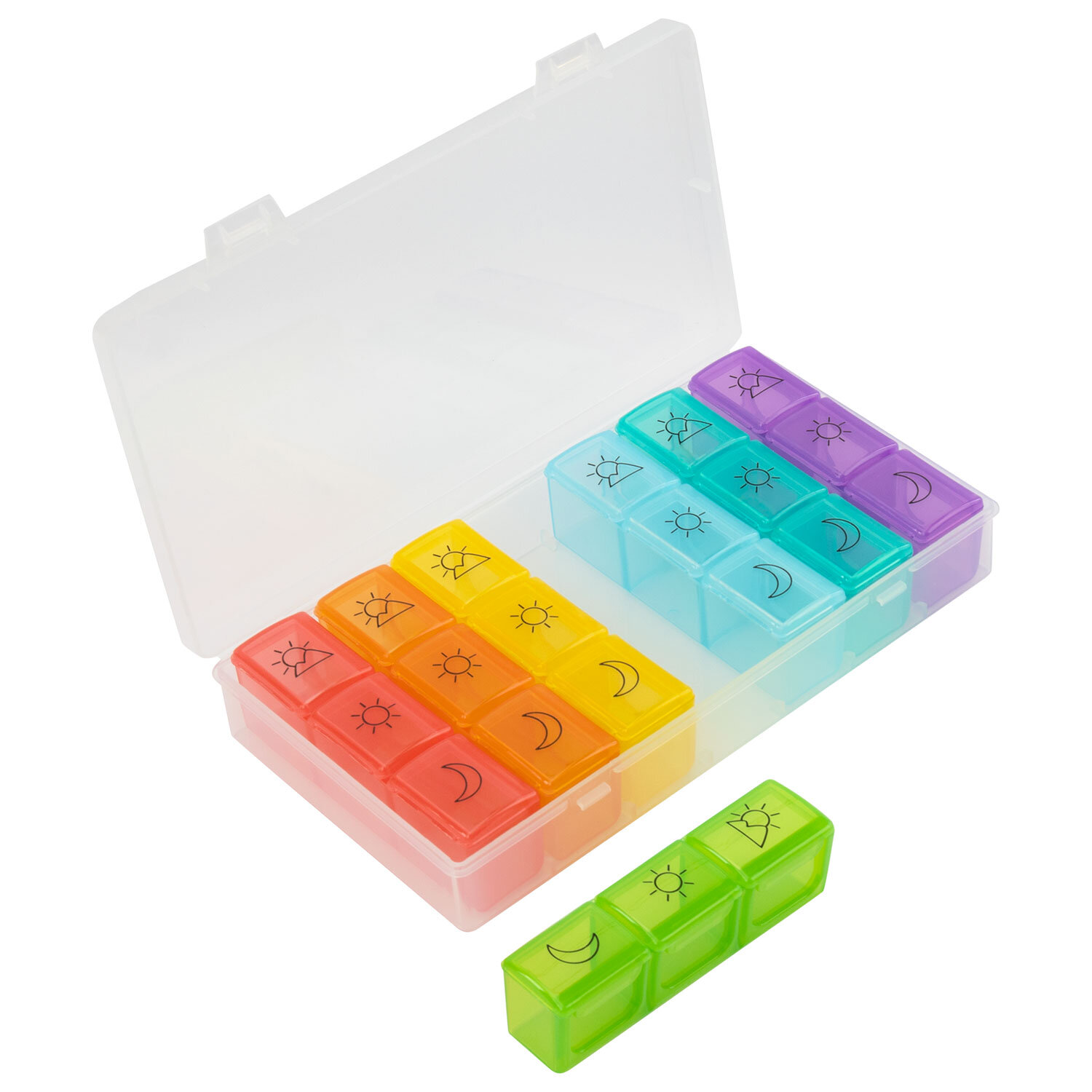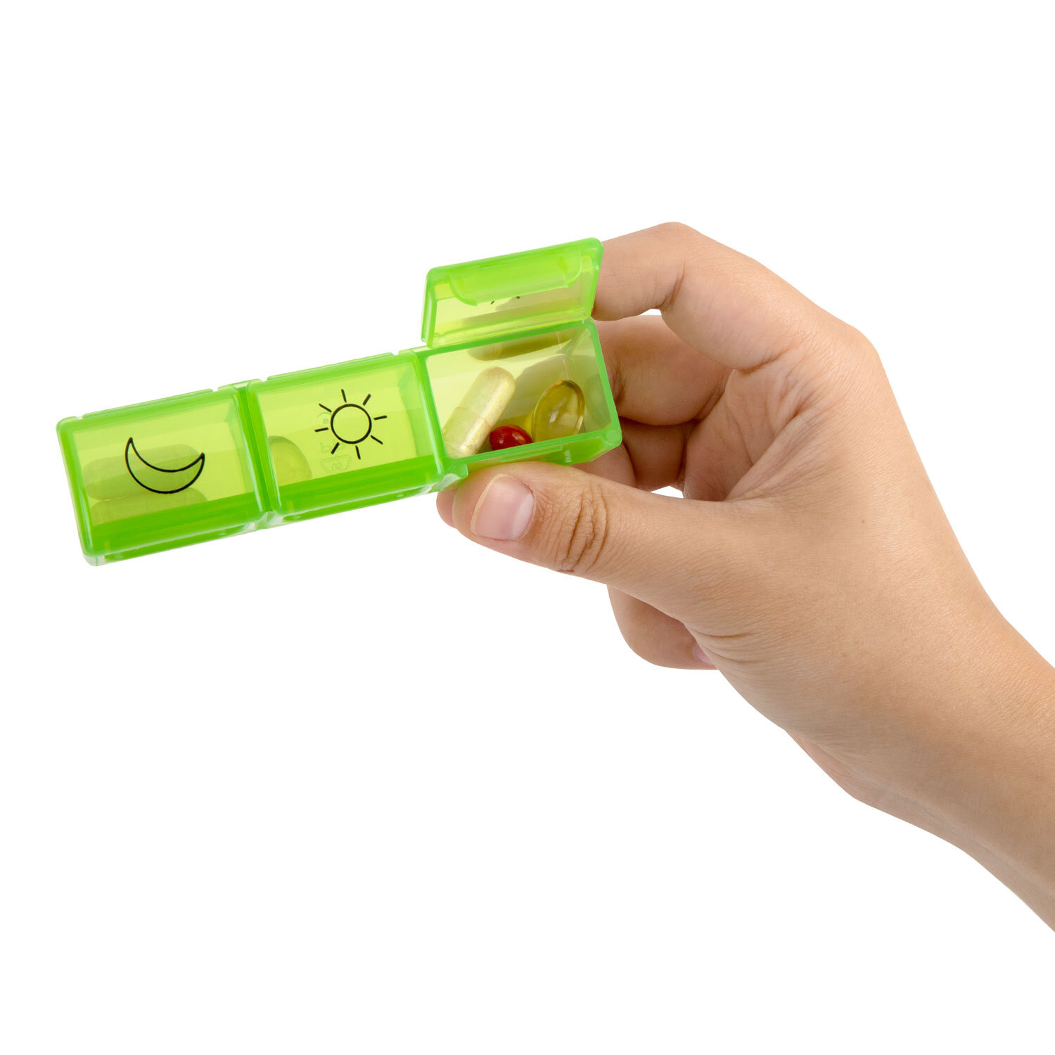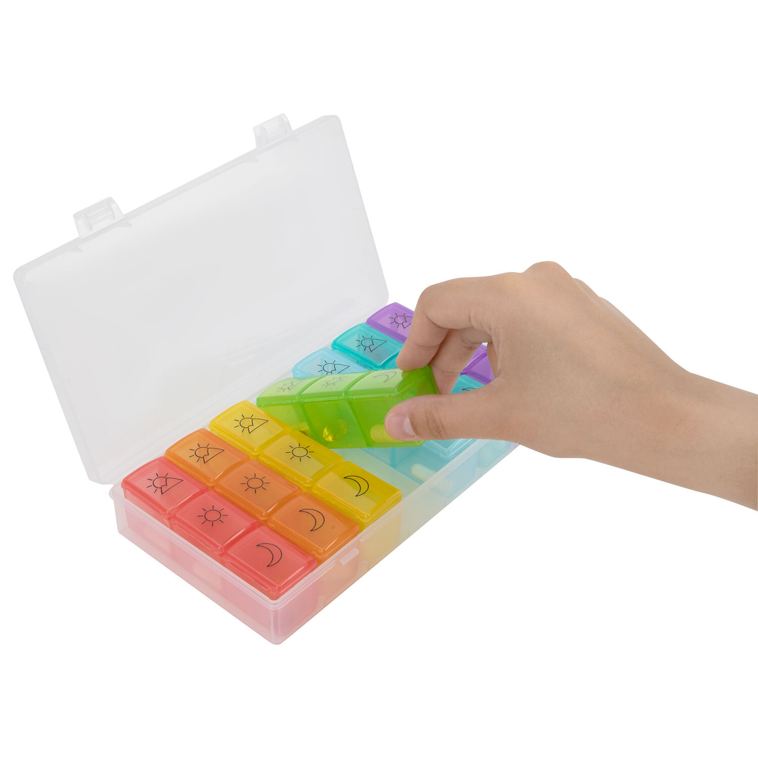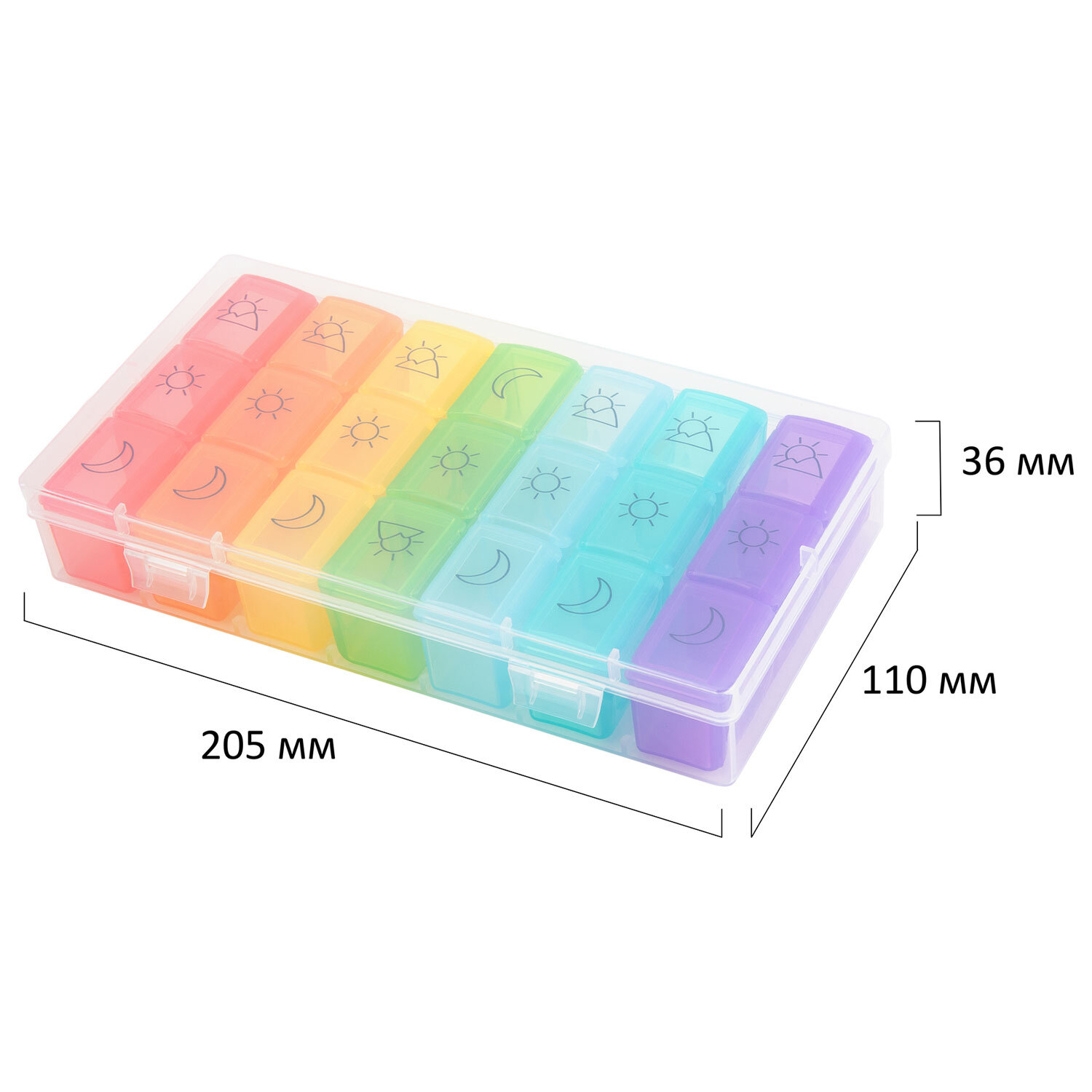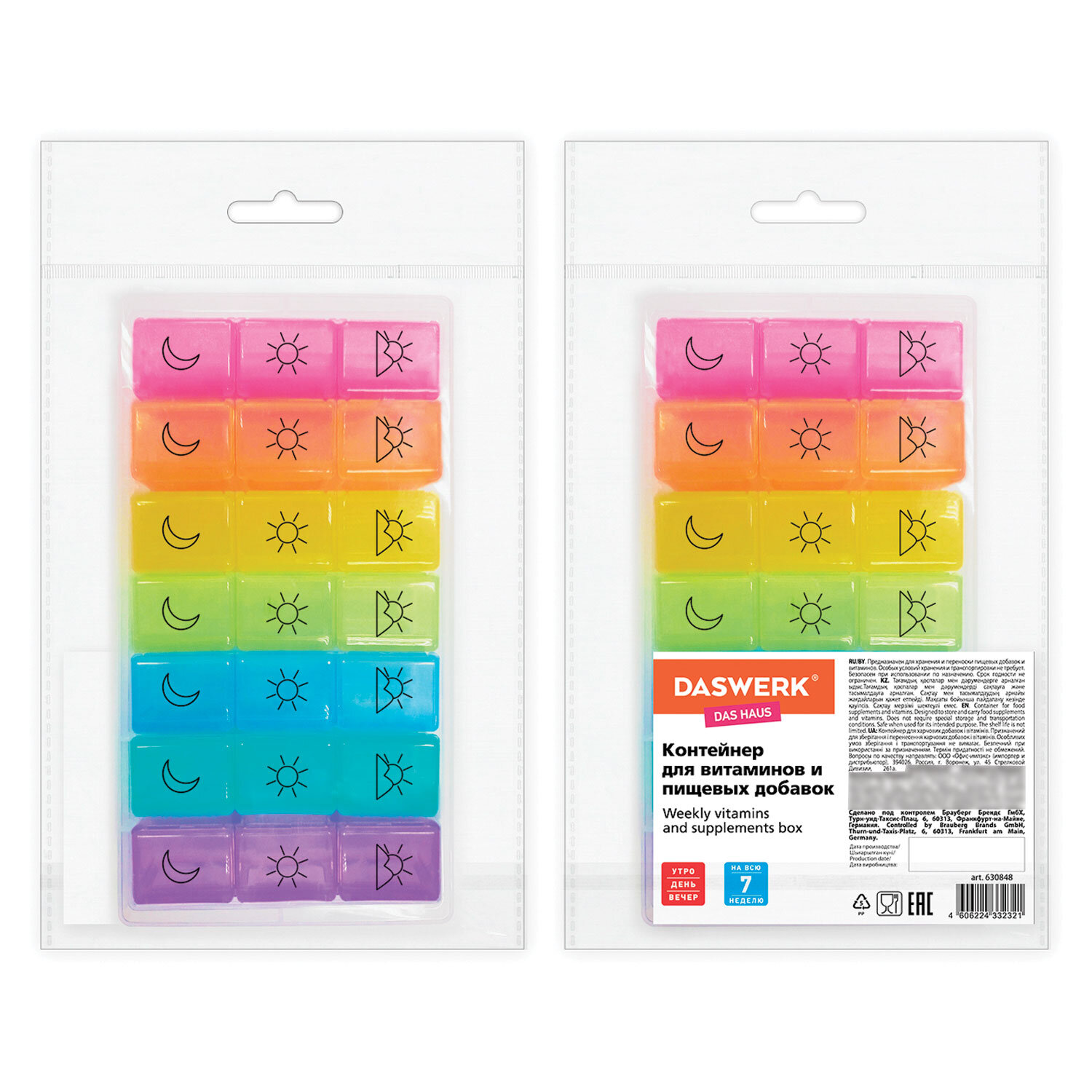 ТАБЛЕТНИЦА / Контейнер-органайзер для лекарств и витаминов, 7 дней/3 приема BOX, DASWERK (ДАСВЕРК) Код товара: 630848 414,97 ₽ Купить Производитель:DASWERK Таблетница DASWERK предназначена для надежного хранения лекарств, витаминов и пищевых добавок. Контейнер из легкого и прочного пластика гарантирует удобство и безопасность в использовании. Таблетница представляет собой прозрачный пластиковый бокс на защелках, внутри которого расположено 7 отдельных ежедневных контейнеров, каждый из которых рассчитан на 3 приема лекарств. Это позволяет брать с собой как всю таблетницу, так и отдельные, более компактные, контейнеры на один день. Каждый из контейнеров в наборе выполнен в различных ярких цветах, и содержит маркировку, соответствующую суточному режиму приема лекарств: утро, день, вечер. Маркировка выполнена при помощи специальной УФ печати. Надписи не сотрутся от длительного и частого использования. Каждое отделение оборудовано отдельной плотно закрывающейся крышкой, что предотвращает рассыпание содержимого. Прозрачный дизайн позволяет без труда контролировать прием лекарственных средств. Перед первым использованием рекомендуется промыть контейнер теплой водой с мылом и тщательно высушить.Производство: КитайКоличество дней: 7Количество ячеек: 21 шт.Длина: 205 ммШирина: 110 ммВысота: 36 ммСерия: DAS HAUSМатериал: пластикВес: 227 грРазмер упаковки: 3.8 × 20.8 × 11.7 смОбъём: 0.0011 м3Промежуточная упаковка: 60 штТранспортная упаковка: 60 штШтрих-код: 4606224332321 Сертификат-1.jpg Сертификат-2.jpg Сертификат-3.jpg