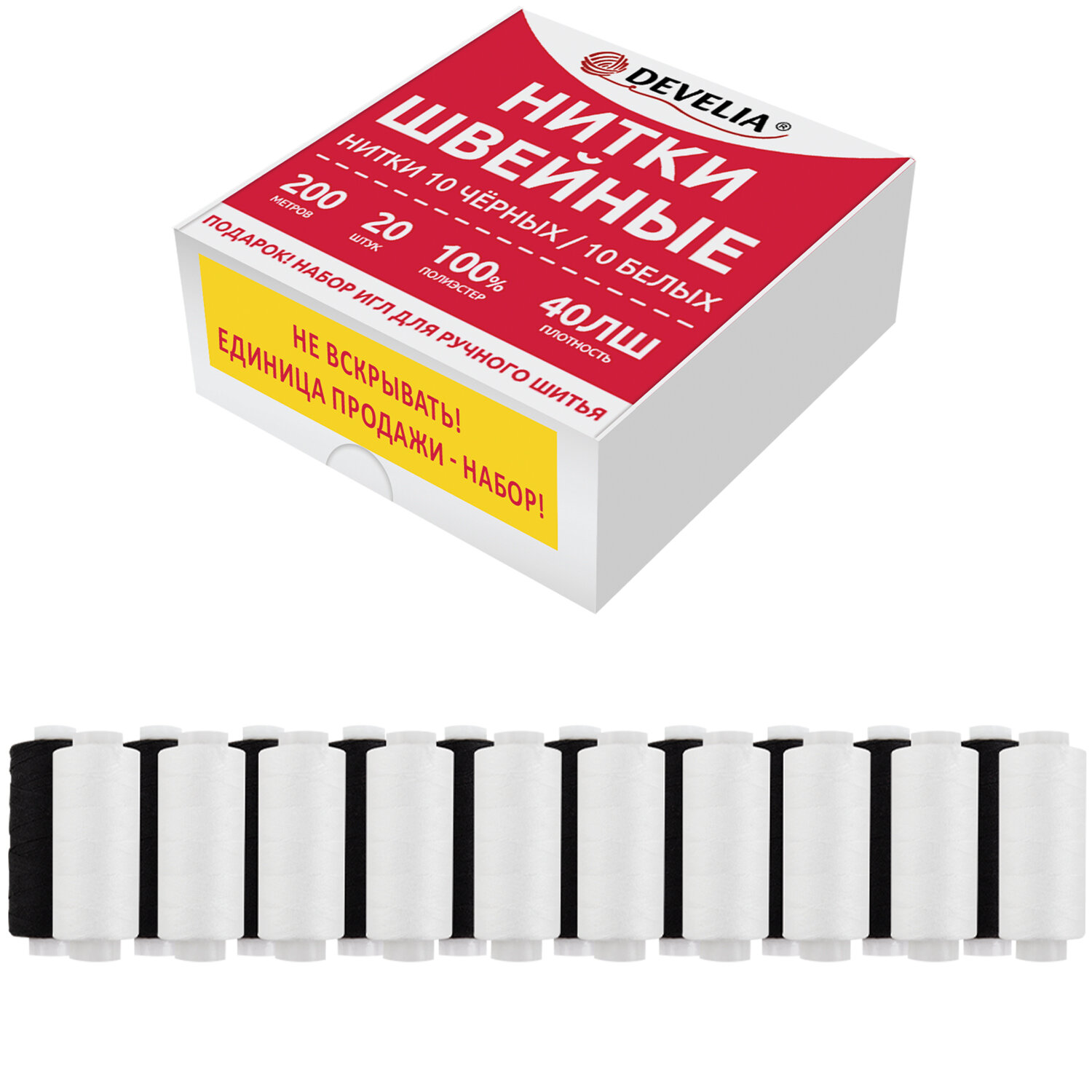 В набор входит 20 катушек 40 ЛШ двух цветов (белый, черный) в намотке 200 м и набор игл для ручного шитья (15 штук). Поставляются в картонной коробке.