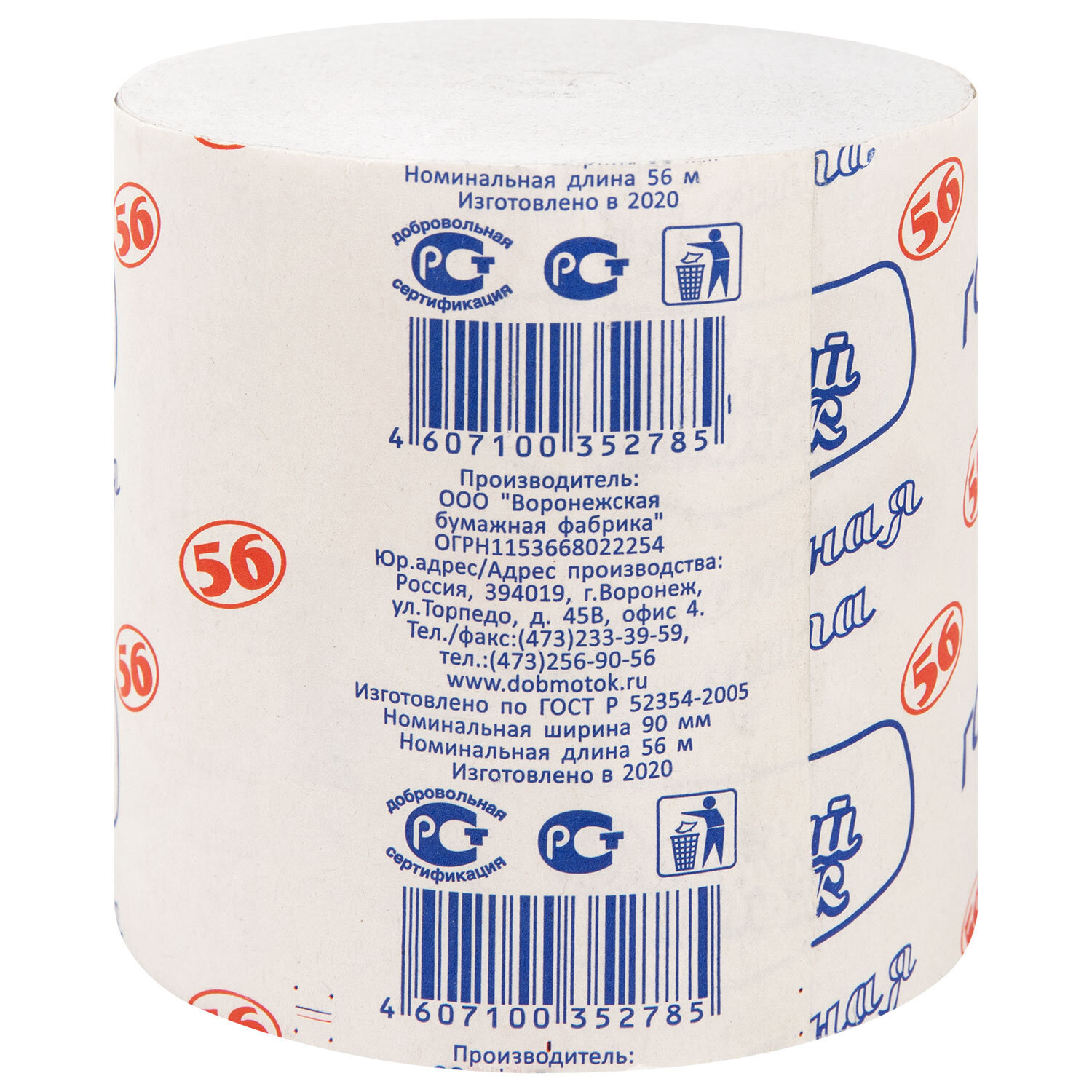 Бумага туалетная бытовая, 56 м, ДОБРЫЙ МОТОК, ГОСТ-56, без втулки (эконом) Код товара: 118738 25,15 ₽ Купить Производитель:ДОБРЫЙ МОТОК Однослойная туалетная бумага эконом-класса из экологически чистого сырья. Изготовлена по ГОСТ Р52354-2005. Длина рулона – 56 метров, ширина – 9 см. Товар обладает базовым набором характеристик и простой упаковкой, при этом полностью соответствует основным требованиям потребителей. Произведена с использованием вторичного сырья. С заботой о сохранении природных ресурсов.Производство: РоссияСырье: макулатураКоличество слоев: 1Спайка/комплект: 1 шт.Длина намотки: 56 мДоля вторичного сырья: 100 %Цвет: серыйАромат: нетДиаметр рулона: 90 ммШирина рулона: 9 смТовар относится к сегменту ЭКОНОМ: даСерия: ЭкономВес: 129 грРазмер упаковки: 8.8 × 8.8 × 8.8 смОбъём: 0.0007 м3Промежуточная упаковка: 48 штТранспортная упаковка: 48 штШтрих-код: 4607100352785