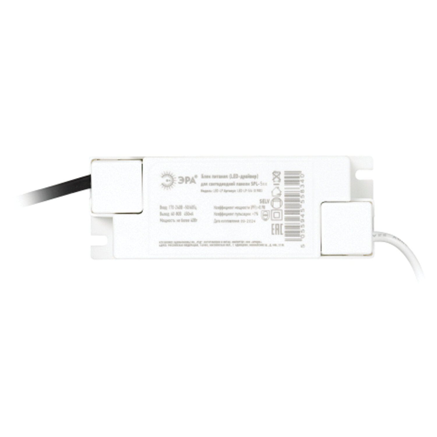 Блок питания (драйвер, ЭПРА) ЭРА LED-LP-5/6 для светодиодных панелей SPL-5; SPL-6; SPL-7; SPL-9 Код товара: 454002 563,52 ₽ Купить Производитель:ЭРА LED-драйвер к панелям SPL-5, SPL-6, не применяется без них. Изделие является независимым устройством. Коэффициент мощности, PF > 0,98. Производство: КитайТип товара: блок питанияТип лампы: нетТип светильника: -Максимальная мощность ламп: 0 ВтКоличество ламп/светодиодов: 0 шт.Класс пылевлагозащищенности: IP20Напряжение питания: 170-265 ВПотребляемая мощность: 0 ВтЦветовая температура: 0 КСветовой поток: 0 ЛмИндекс цветопередачи Ra: 0Срок службы: 50000 чВстроенный драйвер (блок питания): даКласс защиты от поражения электрическим током: IIКласс энергоэффективности: AДиапазон рабочих температур: от +1 до +35 °CТип корпуса: накладнойКомплектация: драйверМатериал: пластикЦвет корпуса: белыйДлина: 120 ммШирина: 30 ммВысота: 15 ммВес: 102 грРазмер упаковки: 2.4 × 18.5 × 4.5 смОбъём: 0.0003 м3Промежуточная упаковка: 50 штТранспортная упаковка: 50 штШтрих-код: 5056183712464 Сертификат-1.jpg Сертификат-2.jpg