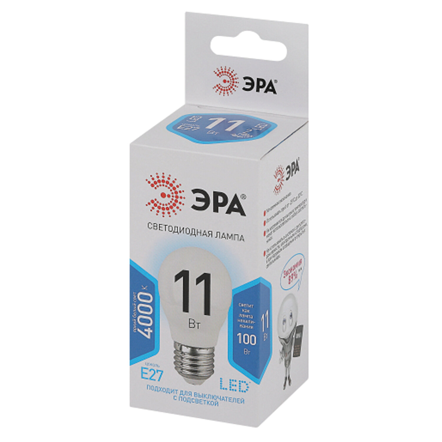 Лампа светодиодная ЭРА STD, 11 (100) Вт, цоколь E27, шар, нейтральный белый свет, 35000 ч., LED P45-11W-840-E27 Код товара: 457695 137,55 ₽ Купить Производитель:ЭРА Эта светодиодная лампа ЭРА STD – современный, качественный и доступный источник света. Позволяет экономить до 90% электроэнергии по сравнению с лампой накаливания с аналогичным световым потоком. Светит ярким белым светом, который максимально приближен к естественному дневному. Идеальна для ежедневного применения в быту. Мгновенное включение. Ровное освещение. Можно использовать как с люстрами, так и со светильниками, в том числе настольными и бра.Производство: Китай Тип цоколя : E27Оттенок света: нейтральный белыйМощность: 11 ВтТип лампы: светодиоднаяТип колбы: шарообразнаяВид колбы: матоваяМинимальное рабочее напряжение: 170 ВМаксимальное рабочее напряжение: 265 ВМощность эквивалентной по световому потоку лампы накаливания: 100 ВтСветовой поток: 880 ЛмЦветовая температура: 4000 КИндекс цветопередачи: 80 %Срок службы: 35000 ч.Высота (длина) лампы: 82 ммДиаметр лампы: 45 ммВес: 35 грРазмер упаковки: 4.6 × 11.5 × 4.6 смОбъём: 0.0002 м3Промежуточная упаковка: 10 штТранспортная упаковка: 100 штШтрих-код: 5056183732578 Файлы Сертификат-1.jpg Сертификат-2.jpg Сертификат-3.jpg Сертификат-4.jpg Сертификат-5.jpg
