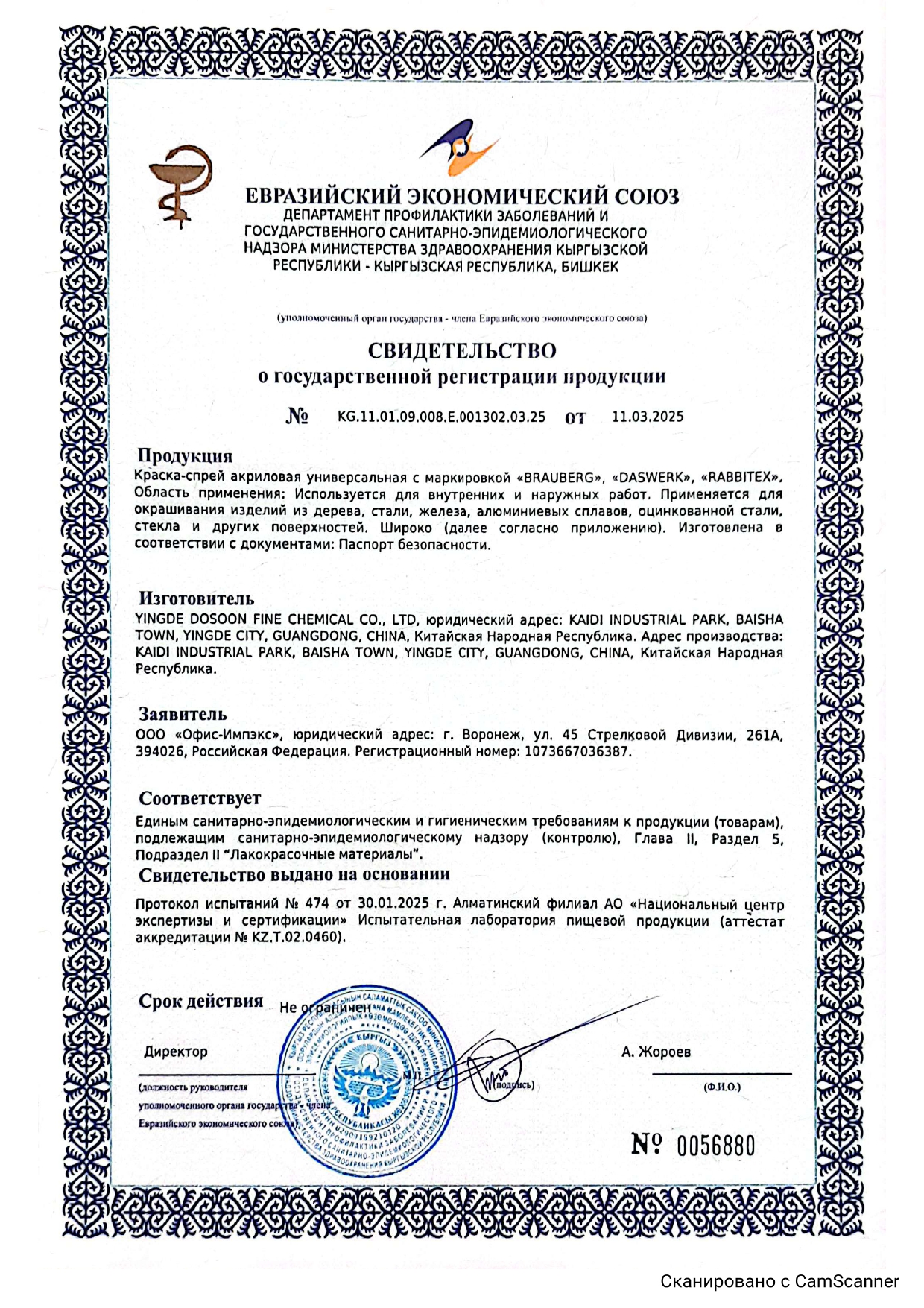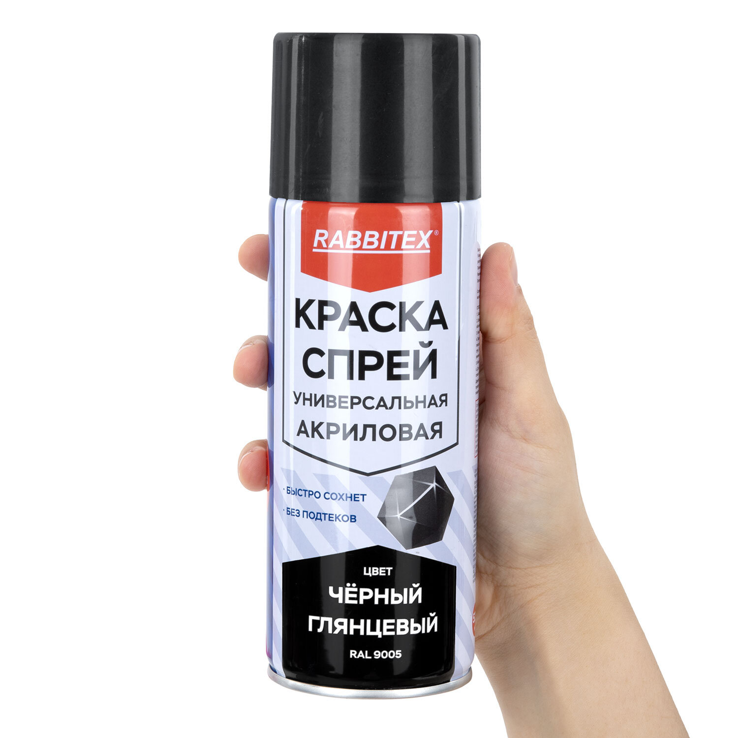 Краска-спрей акриловая универсальная черная глянцевая RAL 9005, 520 мл, нетто-вес 265 грамм, RABBITEX (РАББИТЕКС) Код товара: 700301 299,43 ₽ Купить Производитель:RABBITEX Краска-спрей акриловая RABBITEX предназначена для качественного окрашивания различных деталей из пластика, металла, дерева и других материалов. Она обеспечивает устойчивое и равномерное покрытие, стойкое ко внешним воздействиям. Краска-спрей акриловая универсальная RABBITEX обладает рядом преимуществ благодаря своему составу. Она быстро сохнет, образует плотное и долгосрочное покрытие, сохраняет насыщенность цвета и подходит как для профессионального, так и для домашнего использования. Полное покрытие и ровный цвет достигается в 2 слоя. Равномерно распыляется и не растекается по поверхности. Легко наносится в труднодоступных местах. Способ применения: 1. Защитите поверхности, не подлежащие окрашиванию. 2. Окрашиваемую поверхность очистите от грязи, ржавчины, краски. Обезжирьте и высушите. 3. Встряхните баллон в течении 1-3 минут пока шарики внутри не начнут свободно перемещаться. 4. Нанесите слой краски с расстояния 15-25 см. Интервал нанесения между слоями 5-15 минут. Рекомендуется распылять при температуре от +10до +30 °С. При температуре ниже +10 °С эффект распыления может быть слабым, выравнивание поверхности и блеск могут быть недостаточными. Условия хранения и транспортировки: в сухом, прохладном и хорошо проветриваемом помещении, вдали от источников огня и прямых солнечных лучей при температуре от 0 до +50 °С. Цвет: черный глянцевый RAL 9005. Объем: 520 мл.Производство: КитайТип: краскаМесто применения: на улице и внутри помещенияЦвет: черныйВид покрытия: глянцевоеОбъем/Вес: 520 мл/гОснова: акриловаяЦвет RAL: 9005Влагостойкость: даНазначение: универсальноеСрок годности: 84 месРазмер упаковки: 20 × 6.6 × 6.6 смОбъём: 0.001 м3Промежуточная упаковка: 12 штТранспортная упаковка: 12 штШтрих-код: 4606224472973 Файлы Сертификат-1.jpg Сертификат-2.jpg Сертификат-3.jpg