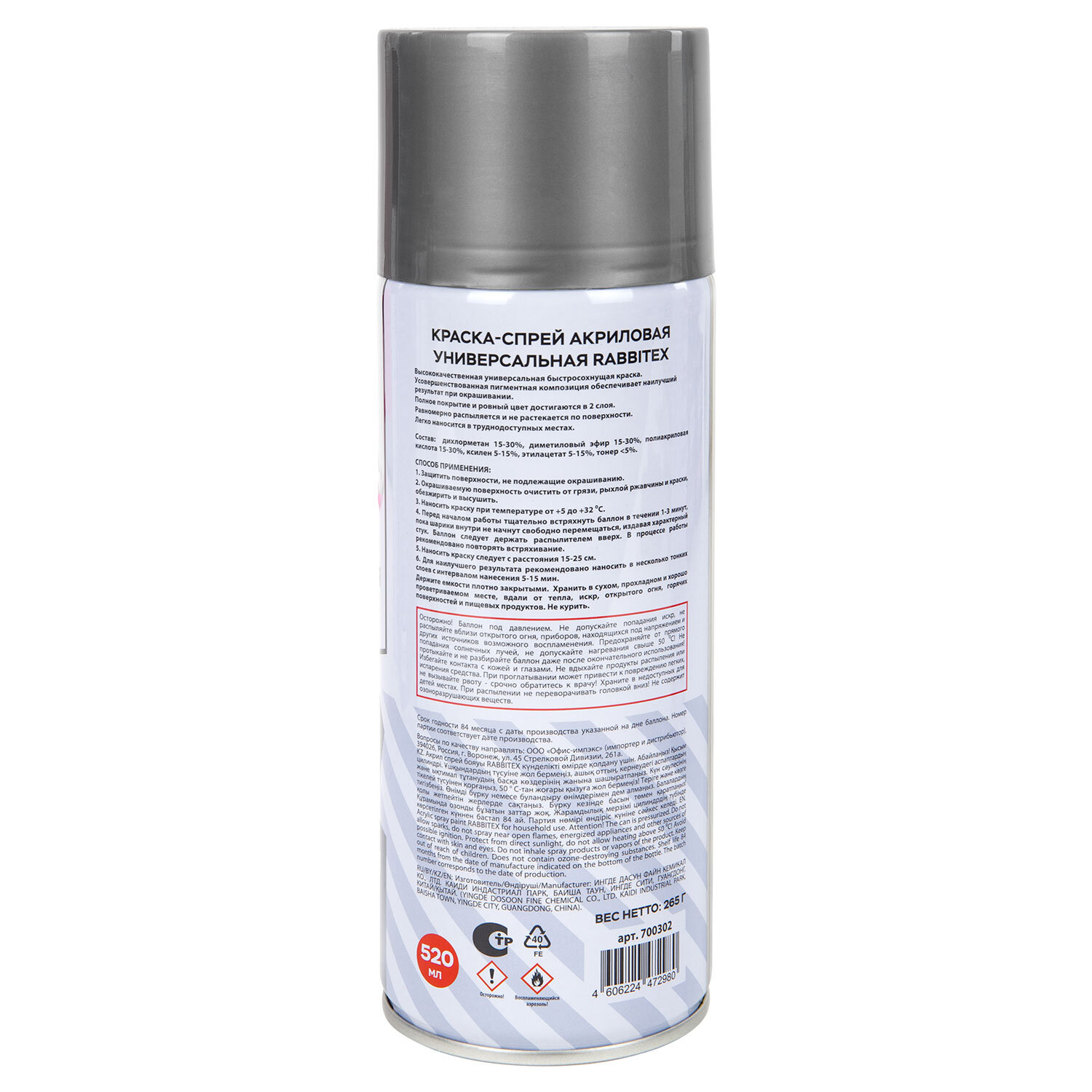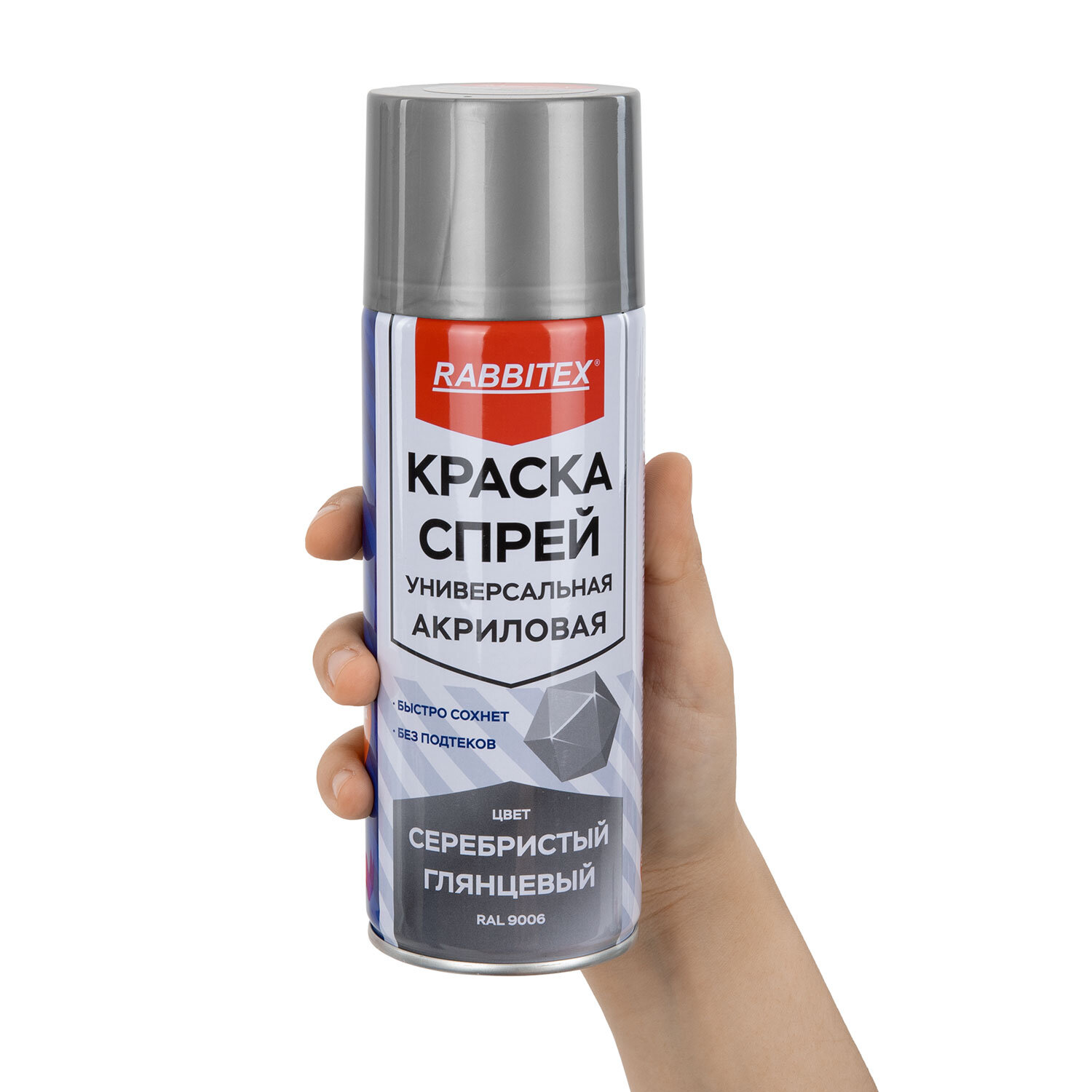 Краска-спрей акриловая универсальная серебряная глянцевая RAL 9006, 520 мл, нетто-вес 265 грамм, RABBITEX (РАББИТЕКС) Код товара: 700302 299,43 ₽ Купить Производитель:RABBITEX Краска-спрей акриловая RABBITEX предназначена для качественного окрашивания различных деталей из пластика, металла, дерева и других материалов. Она обеспечивает устойчивое и равномерное покрытие, стойкое ко внешним воздействиям. Краска-спрей акриловая универсальная RABBITEX обладает рядом преимуществ благодаря своему составу. Она быстро сохнет, образует плотное и долгосрочное покрытие, сохраняет насыщенность цвета и подходит как для профессионального, так и для домашнего использования. Полное покрытие и ровный цвет достигается в 2 слоя. Равномерно распыляется и не растекается по поверхности. Легко наносится в труднодоступных местах. Способ применения: 1. Защитите поверхности, не подлежащие окрашиванию. 2. Окрашиваемую поверхность очистите от грязи, ржавчины, краски. Обезжирьте и высушите. 3. Встряхните баллон в течении 1-3 минут пока шарики внутри не начнут свободно перемещаться. 4. Нанесите слой краски с расстояния 15-25 см. Интервал нанесения между слоями 5-15 минут. Рекомендуется распылять при температуре от +10 до +30 °С. При температуре ниже +10 °С эффект распыления может быть слабым, выравнивание поверхности и блеск могут быть недостаточными. Условия хранения и транспортировки: в сухом, прохладном и хорошо проветриваемом помещении, вдали от источников огня и прямых солнечных лучей при температуре от 0 до +50 °С. Цвет: серебряный глянцевый RAL 9006. Объем: 520 мл.Производство: КитайТип: краскаМесто применения: на улице и внутри помещенияЦвет: серебристыйВид покрытия: глянцевоеОбъем/Вес: 520 мл/гОснова: акриловаяЦвет RAL: 9006Влагостойкость: даНазначение: универсальноеСрок годности: 84 месРазмер упаковки: 19.9 × 6.5 × 6.5 смОбъём: 0.001 м3Промежуточная упаковка: 12 штТранспортная упаковка: 12 штШтрих-код: 4606224472980 Файлы Сертификат-1.jpg Сертификат-2.jpg Сертификат-3.jpg