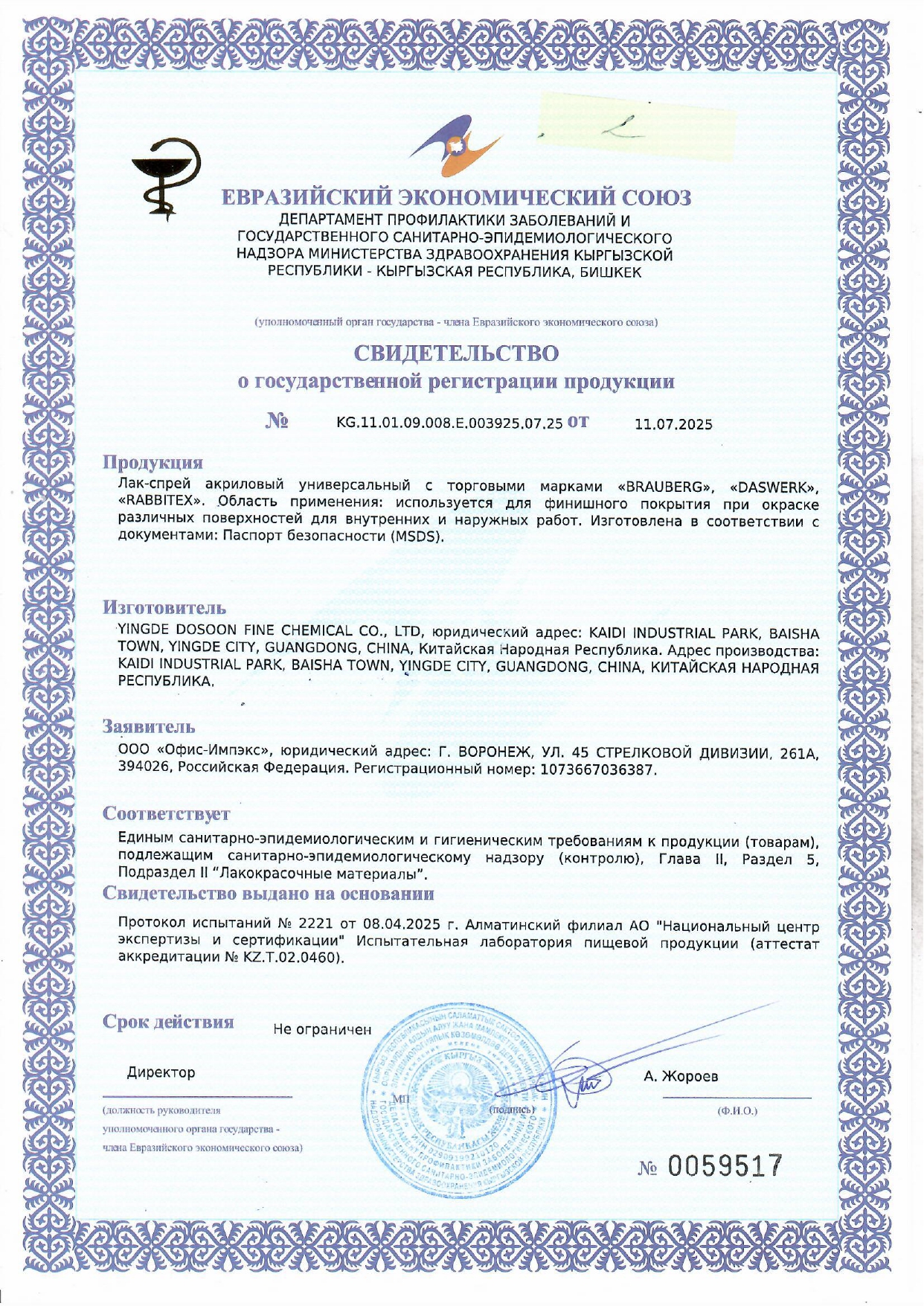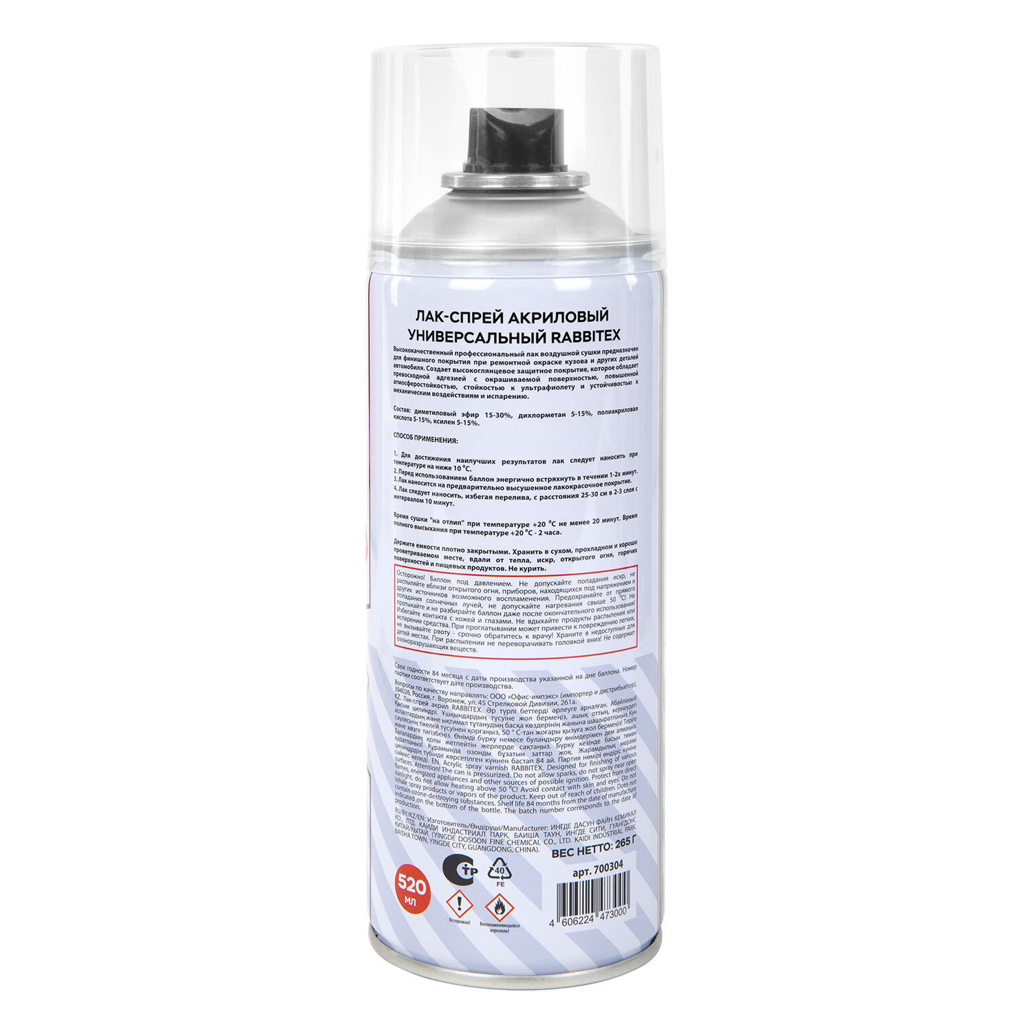 Лак-спрей акриловый универсальный глянцевый 520 мл, нетто-вес 265 грамм, RABBITEX (РАББИТЕКС) Код товара: 700304 299,43 ₽ Купить Производитель:RABBITEX Глянцевый аэрозольный лак RABBITEX обеспечит идеальную защиту и сияющий финиш любых поверхностей. Лак-спрей – это удобный и эффективный способ покрытия без лишних усилий. Глянцевый аэрозольный лак RABBITEX легко наносится, быстро сохнет и создает прочное, прозрачное покрытие, подчеркивающее свет и текстуру основания. Лак равномерно наносится без подтеков и следов. Он устойчив к влаге, царапинам и выцветаниями. Идеально подходит для дерева, металла, пластика, керамики, бумаги и других материалов. Подходит к использованию в ремонте, декоре, творчестве и обновлении любых предметов. Применение: 1. Лак следует наносить при температуре не ниже 10 °С. 2. Перед использованием необходимо встряхнуть баллон в течении 1-2 минут. 3. Лак следует наносить на высохшее лакокрасочное покрытие. 4. Лак следует наносить, избегая перелива, с расстояния 25-30 см в 2-3 слоя с интервалом в 10 минут. Рекомендуется распылять при температуре от +10 до +30 °С. При температуре ниже +10 °С эффект распыления может быть слабым, выравнивание поверхности и блеск могут быть недостаточными. Условия хранения и транспортировки: в сухом, прохладном и хорошо проветриваемом помещении, вдали от источников огня и прямых солнечных лучей при температуре от 0 до +50 °С. Цвет: прозрачный глянцевый. Объем: 520 мл.Производство: КитайТип: лакМесто применения: на улице и внутри помещенияЦвет: прозрачныйВид покрытия: глянцевоеОбъем/Вес: 520 мл/гОснова: акриловаяВлагостойкость: даНазначение: универсальноеСрок годности: 84 месРазмер упаковки: 20 × 6.6 × 6.6 смОбъём: 0.001 м3Промежуточная упаковка: 12 штТранспортная упаковка: 12 штШтрих-код: 4606224473000 Файлы Сертификат-1.jpg Сертификат-2.jpg