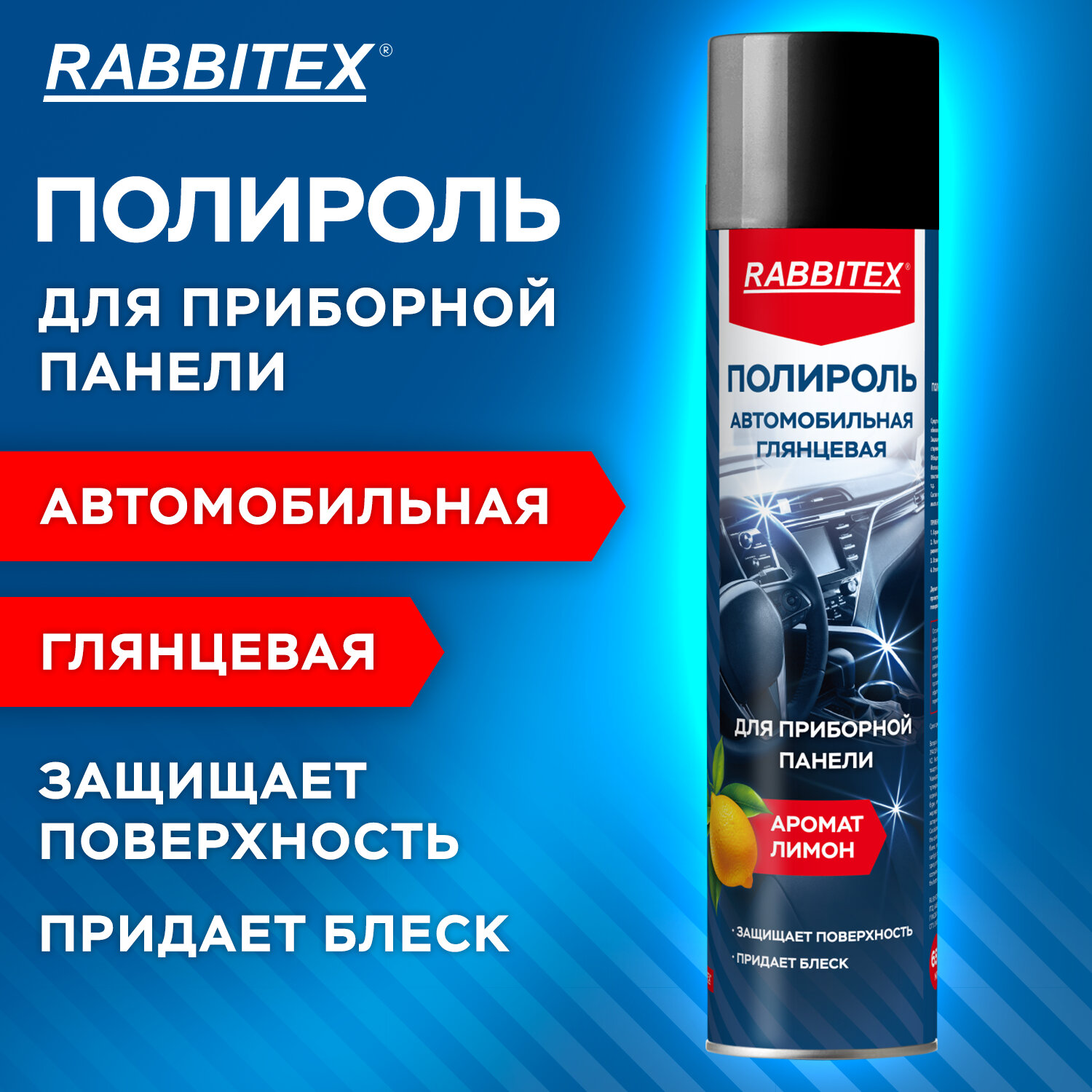 Полироль для приборной панели автомобильная 650 мл, ЛИМОН, аэрозоль с трубочкой, RABBITEX Код товара: 700305 127,82 ₽ Купить Производитель:FORMIX Полироль автомобильная RABBITEX вернет вашему автомобилю первозданный блеск! Полироль RABBITEX не только придает глянцевую поверхность, но и надежно защищает от пыли, выгорания и мелких царапин. Полироль автомобильная RABBITEX: - освежает внешний вид поверхностей - обладает антистатическим эффектом - защищает от УФ-лучей и выцветания - имеет приятный и ненавязчивый аромат Лимона - подходит для пластика, винила, резины Объем: 650 мл.Производство: КитайТип товара: полирольТип использования: для приборной панелиФорма выпуска: аэрозольОбъем/Вес: 650 мл/гУпаковка: баллонСрок годности: 84 месРазмер упаковки: 6.5 × 6.5 × 24 смОбъём: 0.0014 м3Промежуточная упаковка: 12 штТранспортная упаковка: 12 штШтрих-код: 4606224473017