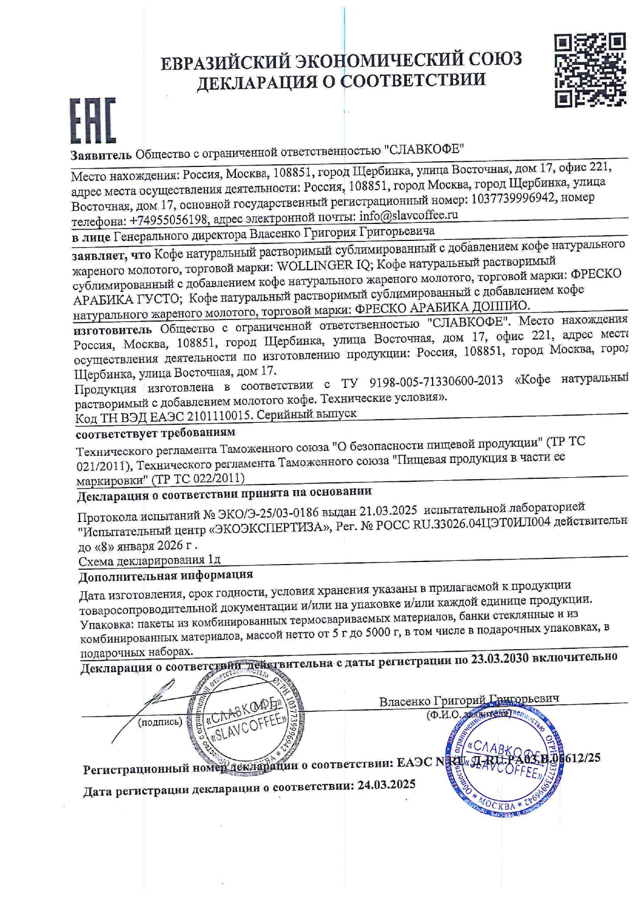 Кофе молотый в растворимом FRESCO "Doppio" 100 г, стеклянная банка, сублимированный Код товара: 622502 465 ₽ Купить Производитель:FRESCO Кофе FRESCO "Doppio" создан по уникальной технологии производства растворимого кофе высшего качества, при которой молотый жареный кофе «арабика премиум» становится неотъемлемой частью каждого кристалла растворимого сублимированного кофе. Такая технология обеспечивает неповторимый стойкий аромат сразу на этапе приготовления напитка. Насыщенный плотный вкус и неповторимый стойкий аромат свежезаваренного кофе — уникальная особенность FRESCO "Doppio".Производство: РоссияТип кофе: растворимыйСерия: FRESCOВкус: DoppioВес: 100 гУпаковка: стеклянная банкаСрок годности: 24 месРазмер упаковки: 6.2 × 15.5 × 8.3 смОбъём: 0.001 м3Промежуточная упаковка: 6 штТранспортная упаковка: 6 штШтрих-код: 4630007982786 Сертификат-1.jpg Сертификат-2.jpg Сертификат-3.jpg