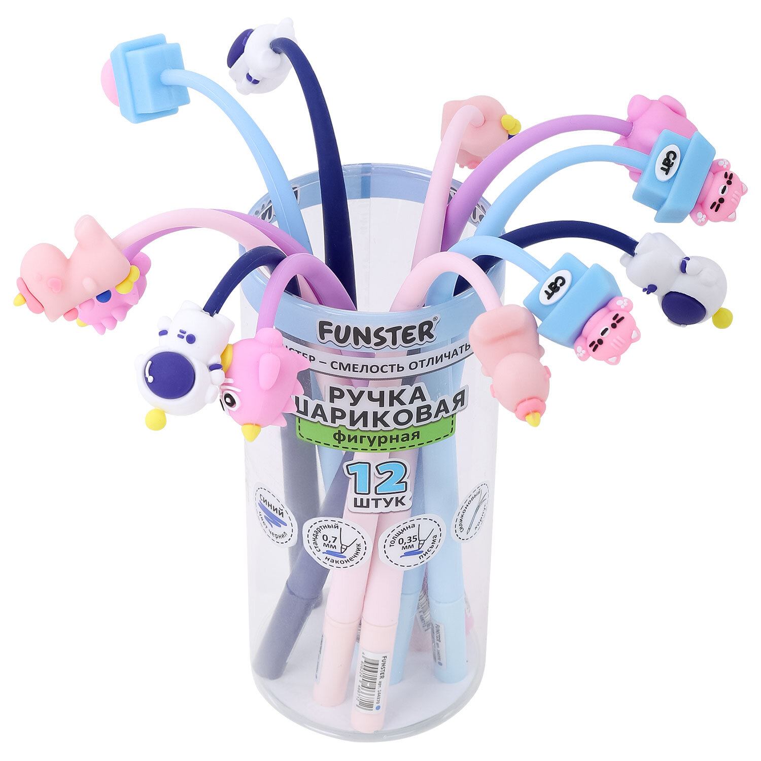 Ручка фигурная силиконовая шариковая FUNSTER (ФАНСТЕР) "SILICONE MIX", СИНЯЯ, корпус ассорти, узел 0,7 мм, линия письма 0,35 мм Код товара: 144370 93,76 ₽ Купить Производитель:FUNSTER Ручка фигурная силиконовая шариковая FUNSTER "SILICONE MIX" – яркий аксессуар для письма в необычном исполнении, который сделает процесс ведения записей интересным и увлекательным. Ручка фигурная FUNSTER "SILICONE MIX" выполнена в мягком силиконовом корпусе, за счет чего изгибается в процессе письма. Конструкция ручки дополнена топпером, который привлечет привлечет внимание своим интересным дизайном и яркими деталями. Линия письма толщиной 0,35 мм создается за счет стандартного наконечника 0,7 мм. Благодаря синему цвету чернил ручка является универсальным инструментом для школы и университета.Производство: КитайТип ручки: шариковаяЦвет чернил: синийТолщина линии письма: 0.35 ммДиаметр пишущего узла: 0.7 ммСерия: ФигурныеДлина сменного стержня: 130 ммФорма наконечника: стандартныйПокрытие корпуса: Силиконовое покрытиеФорма корпуса: фигурнаяЦвет корпуса: ассортиДизайн: ассортиУпаковка: пластиковая тубаСрок годности: 60 месВес: 23 грРазмер упаковки: 2.3 × 23.1 × 2.4 смОбъём: 0.0001 м3Промежуточная упаковка: 12 штТранспортная упаковка: 432 штШтрих-код: 4606224466712 Файлы Сертификат-1.jpg Сертификат-2.jpg Сертификат-3.jpg Сертификат-4.jpg Сертификат-5.jpg Сертификат-6.jpg