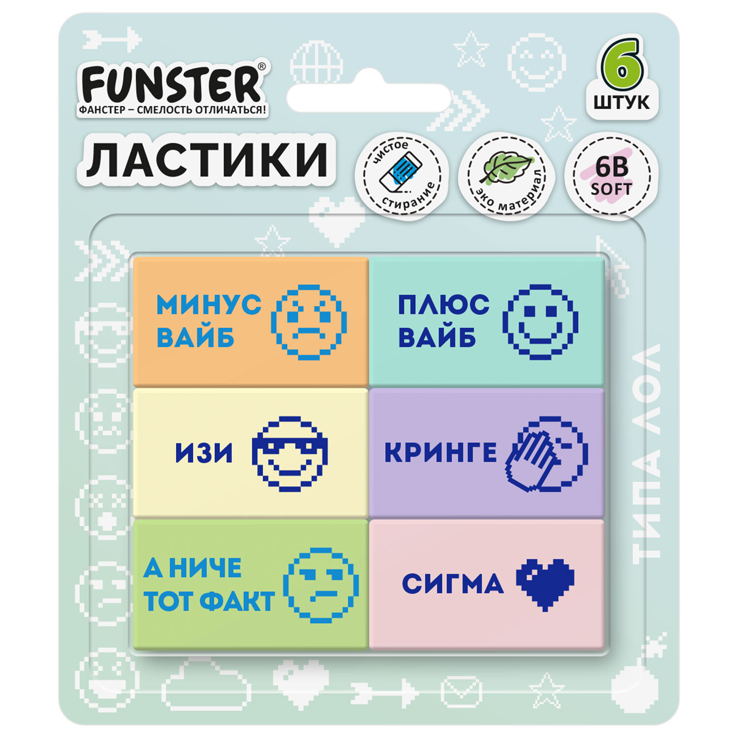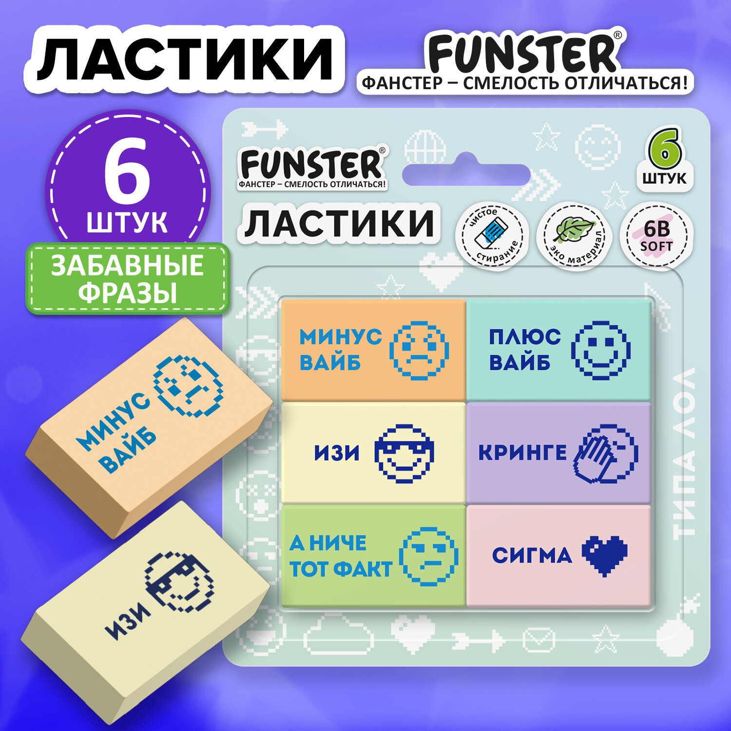 Ластики с надписью FUNSTER (ФАНСТЕР) "ЗАБАВНЫЕ ФРАЗЫ", НАБОР 6 ШТУК, 45х25х10 мм, экологичный ПВХ Код товара: 274019 279,42 ₽ Купить Производитель:FUNSTER Ластики FUNSTER "ЗАБАВНЫЕ ФРАЗЫ" – не только стирают, но и создают настроение. Ластики для тех, кто ценит иронию и дизайн. Ластики FUNSTER "ЗАБАВНЫЕ ФРАЗЫ" имеют удобную прямоугольную форму и идеальны для точного удаления карандашных штрихов. Размер ластика – 45х25х10 мм. Выполнены из современного материала – экологичного ПВХ, который обеспечивает мягкое и чистое стирание, оставляя минимум бумажной пыли. В наборе шесть ластиков в спокойных пастельных цветах. Каждый ластик с краткой, но меткой фразой. Упакованы в блистерную упаковку с подвесом.Производство: КитайКоличество в упаковке: 6 шт.Материал: ECO-PVCФорма: прямоугольнаяСтираемые письменные принадлежности: чернографитные карандашиЦвет: пастельный ассортиСерия: Ластики с фразамиНе оставляет бумажной пыли: даРазмер: 45х25х10 ммИндивидуальная упаковка: даУпаковка: блистер с подвесомВес: 102 грРазмер упаковки: 2.2 × 7.8 × 4.6 смОбъём: 0.0001 м3Промежуточная упаковка: 18 штТранспортная упаковка: 108 штШтрих-код: 4606224512471
