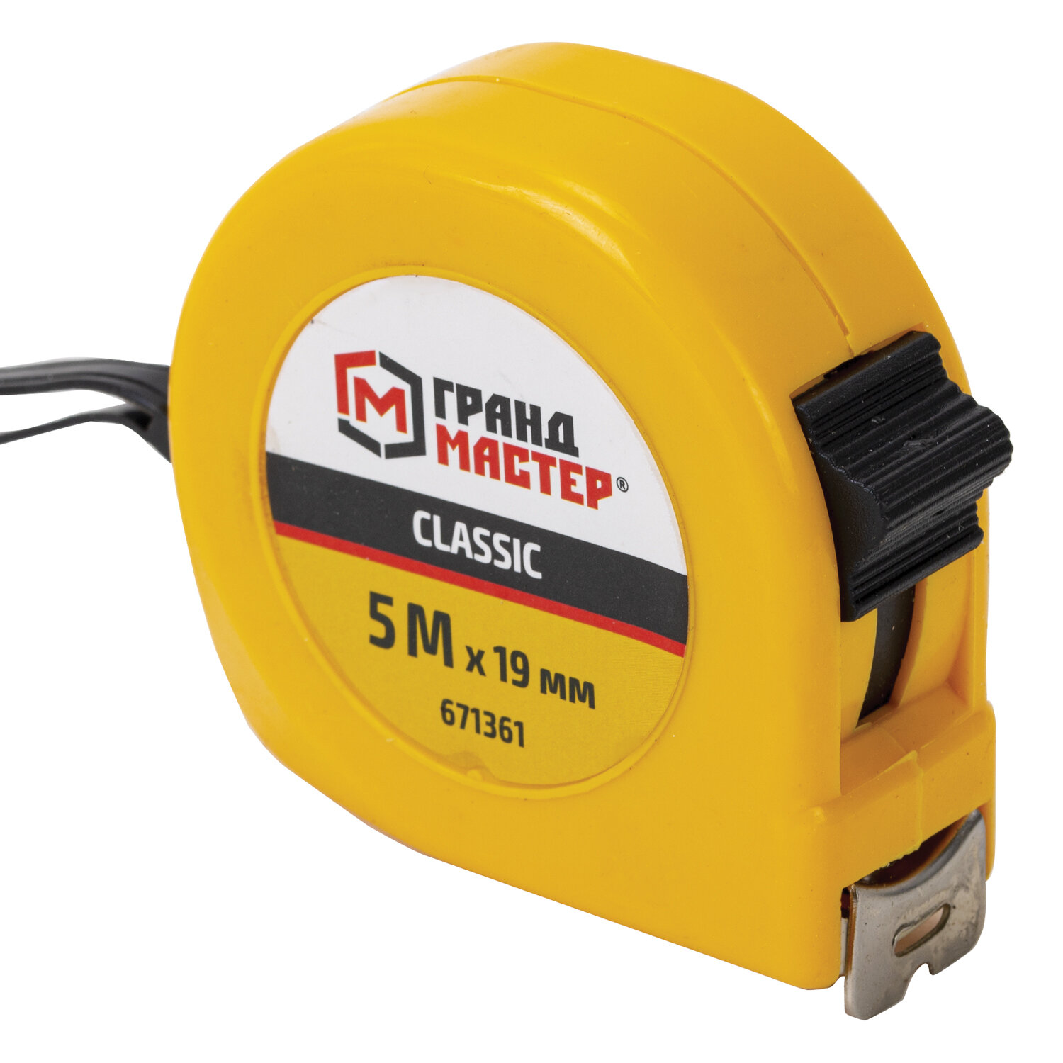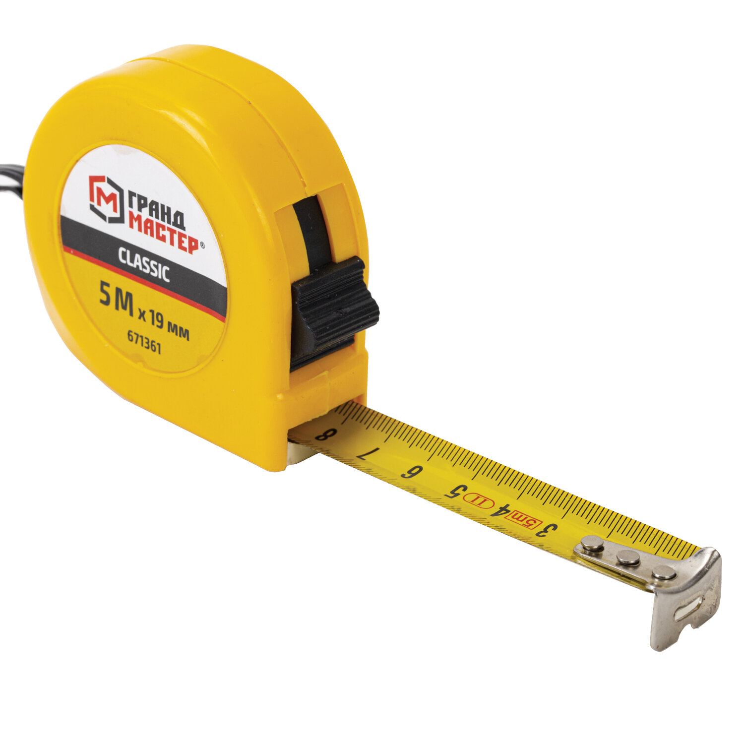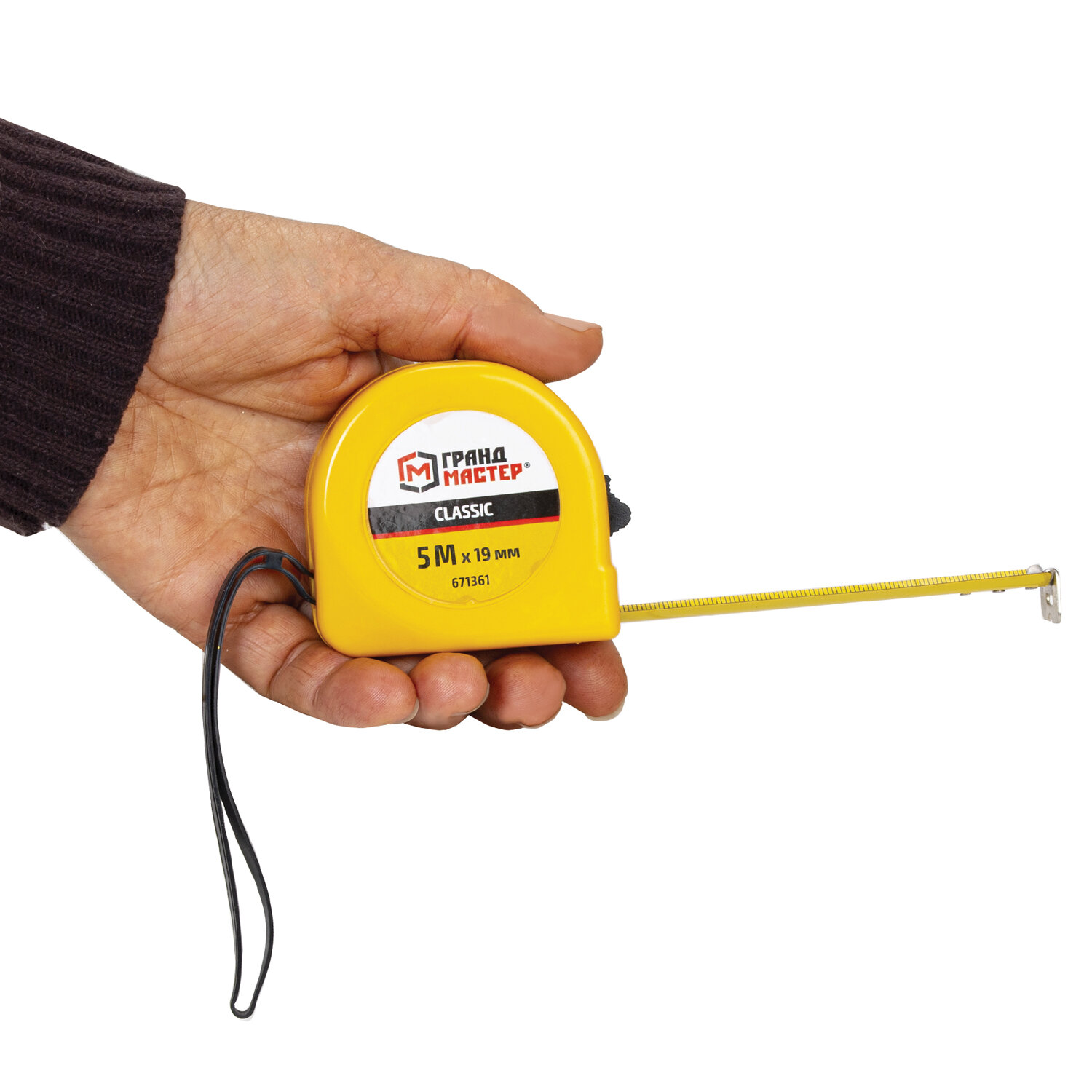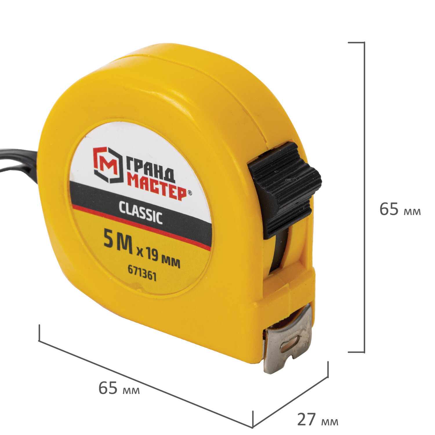 Рулетка измерительная 5 м х 19 мм, пластиковый корпус, с фиксатором, ГРАНДМАСТЕР Classic Код товара: 671361 106,49 ₽ Купить Производитель:ГРАНДМАСТЕР Рулетка ГРАНДМАСТЕР применяется для измерения размеров поверхностей и расстояний. Благодаря эргономичному дизайну и высокому классу точности измерений рулетка станет незаменимым помощником в быту и профессиональной деятельности. Рулетка ГРАНДМАСТЕР проста в обращении и обладает повышенной износостойкостью благодаря корпусу, изготовленному из прочного ABS-пластика. Измерительная лента с метрической шкалой II класса точности изготовлена из прочной марганцевой стали, устойчивой к заломам, и оснащена зацепом для удобства измерений. Рулетка оснащена ремешком для ношения на запястье, а также металлической клипсой для крепления на поясе. Эргономичный дизайн с вертикальным фиксатором измерительной ленты позволит использовать рулетку даже одной рукой. Материал корпуса: ABS-пластик. Цвет корпуса: жёлтый. Материал измерительной ленты: 45 марганцевая сталь. Размеры измерительной ленты: длина 5 метров, ширина 19 миллиметров. Система измерения: метрическая. Цвет ленты: жёлтый. Фиксатор: вертикальный. Упаковка: бумажная карта с европодвесом.Производство: КитайВид рулетки: строительныйШирина ленты: 19 ммДлина ленты: 5 мСерия: РулеткиМатериал ленты: марганцевая стальКоличество режимов фиксации: 1Цена деления: 1 ммКласс точности: 2Тип корпуса: закрытыйМатериал корпуса: пластикВес: 165 грРазмер упаковки: 3.2 × 14.7 × 9.8 смОбъём: 0.0004 м3Промежуточная упаковка: 12 штТранспортная упаковка: 120 штШтрих-код: 4606224470832 Файлы Сертификат-1.jpg Сертификат-2.jpg Сертификат-3.jpg Сертификат-4.jpg Сертификат-5.jpg