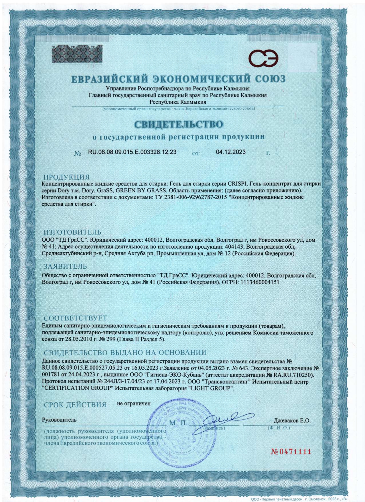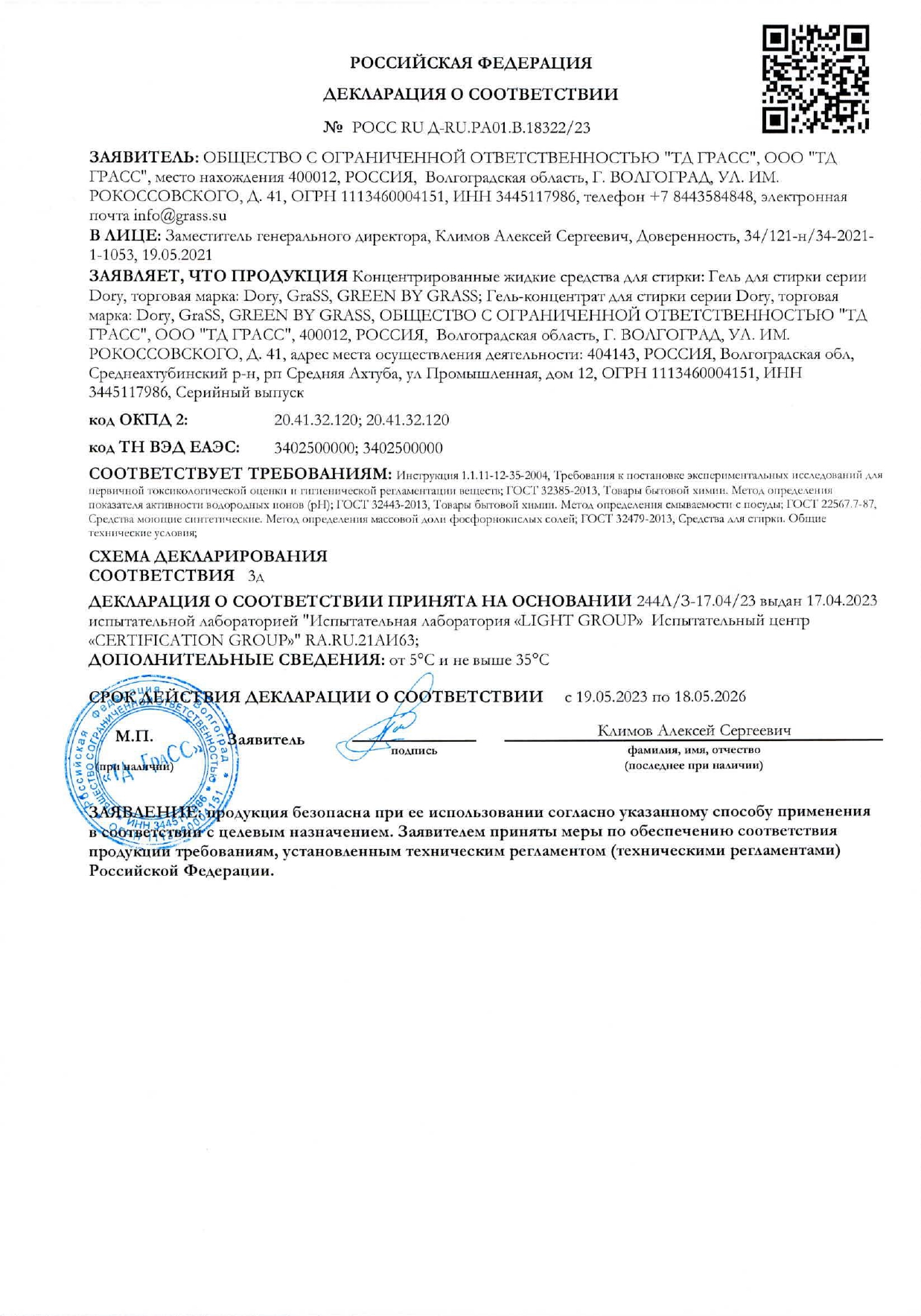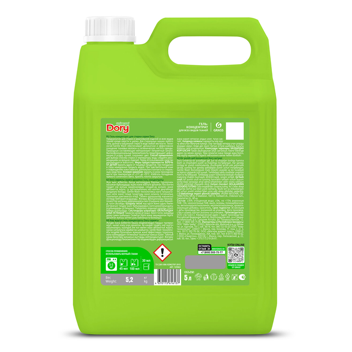 Гель для стирки белья концентрированный, гипоаллергенный, 5 л, DORY by GRASS "Фруктово-цветочная мелодия" Код товара: 702589 864,98 ₽ Купить Производитель:GRASS Гель-концентрат DORY by GRASS "Фруктово-цветочная мелодия" предназначен для стирки и замачивания изделий из всех видов тканей, кроме шерсти и шелка. Для ручной и машинной стирки в воде любой жесткости. Технология Gentle Wash обеспечивает деликатное и эффективное очищение тканевых волокон и гигиеническую чистоту одежды. Природные составляющие нейтрализуют неприятные запахи. Высокофункциональные биокомпоненты предотвращают деформацию и усадку тканей, сохраняют цвет. Ключевые особенности: - фруктово-цветочный аромат, - предотвращает деформацию и усадку тканей, - для всех видов тканей (кроме шерсти и шелка), - гель и кондиционер 2 в 1. Состав: не менее 30% очищенная вода; более 5%, но меньше 15% анионные ПАВ; менее 5%: неионогенные ПАВ, мыло, энзимы, поликарбоксилаты, метилхлороизотиазолинон, метилизотиазолинон, ароматизирующая добавка, краситель Способ применения: для выбора способа стирки и температуры воды следуйте рекомендациям на ярлыках изделий. Перед использованием средство рекомендуется взболтать. Меры предосторожности: беречь от детей! Хранить вдали от пищевых продуктов. При попадании в глаза немедленно промыть водой. При чувствительной коже и повреждениях кожи избегать длительного контакта со средством.Производство: РоссияТип: универсальныйОбъем/Вес: 5000 мл/гВид средства: гель концентратНазначение: для всех видов тканей, кроме шерсти и шелкаОтдушка: фруктово-цветочнаяГипоаллергенный: даКоличество бункеров: 0 шт.Разрешено для детских учреждений: даОбласть применения: бытовое использование, государственные учреждения, предприятия общественного питания, санаторно-курортные учреждения, сфера услуг, торговые учреждения, учреждения образования (школьные, дошкольные, средние, высшие)Серия: GEL CONCENTRATEВид упаковки: канистраСрок годности: 36 месРазмер упаковки: 29.4 × 18.2 × 12.8 смОбъём: 0.008 м3Промежуточная упаковка: 4 штТранспортная упаковка: 4 штШтрих-код: 4670113616137 Сертификат-1.jpg Сертификат-2.jpg Сертификат-3.jpg