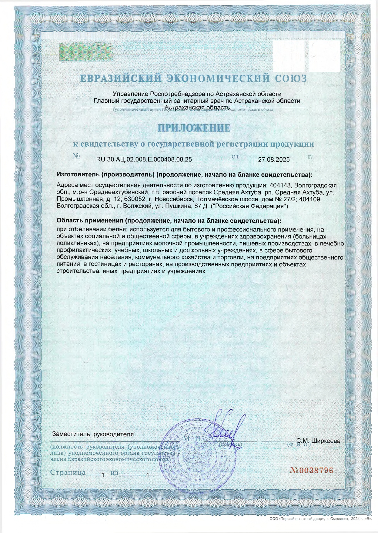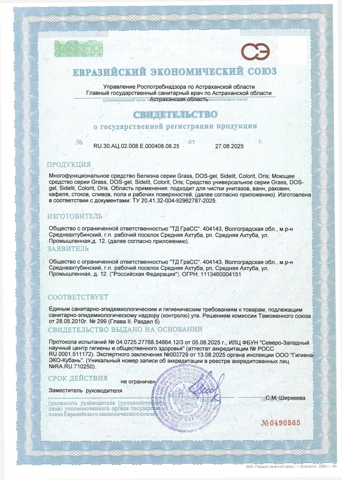 Средство для отбеливания, дезинфекции и уборки 700 мл GRASS БЕЛИЗНА, гель Код товара: 702614 124,58 ₽ Купить Производитель:GRASS Многофункциональное средство GRASS БЕЛИЗНА. Идеально подходит для чистки унитазов, ванн, раковин, кафеля, стоков, сливов, пола и рабочих поверхностей. Используется при отбеливании белья. Колпачок защищен от открывания детьми. Чтобы открыть, надавите на уплотнения по бокам колпачка и поверните против часовой стрелки. Чтобы закрыть, поверните колпачок по часовой стрелке до щелчка. Ключевые особенности: - дезинфицирует, - отбеливает, - очищение за 1 минуту, - густой гель. Состав: не менее 30% вода очищенная; менее 5%: гипохлорит натрия, анионные ПАВ, амфотерные ПАВ, гидроксид натрия, ароматизирующая добавка. Способ применения: • Ванная, раковина: нанести средство на поверхность, обработайте щеткой или губкой, оставить на 1 минуту, смыть тщательно водой. • Унитаз: нанесите под ободок унитаза и оставьте на 30 минут, затем смойте водой. • Стоки и сливы: залейте 250 л в сливное отверстие, оставьте на 15–30 минут, затем промойте водой. • Для мытья полов и рабочих поверхностей разбавить 60 мл средства на 5 л воды. • Отбеливание белья – развести 40 мл средства на 5 л теплой воды, замочить белье в растворе на 45 минут, затем постирать обычным способом. Меры предосторожности: беречь от детей! Хранить вдали от пищевых продуктов. При попадании в глаза немедленно промыть водой. При чувствительной коже и повреждениях кожи избегать длительного контакта со средством.Производство: РоссияТип средства: белизнаНазначение: для отбеливания, дезинфекции и уборкиОбъем: 700 мл/гВид средства: гельРазрешено для детских учреждений: даОбласть применения: бытовое использование, государственные учреждения, пищевая промышленность, предприятия общественного питания, производственные компании, санаторно-курортные учреждения, сфера услуг, торговые учреждения, учреждения образования (школьные, дошкольные, средние, высшие)Серия: БелизнаДозатор: утенокВид упаковки: флаконСрок годности: 24 месВес: 818 грРазмер упаковки: 5.5 × 27.9 × 9.4 смОбъём: 0.0018 м3Промежуточная упаковка: 12 штТранспортная упаковка: 12 штШтрих-код: 4670113623449 Файлы Сертификат-1.jpg Сертификат-2.jpg Сертификат-3.jpg Сертификат-4.jpg Сертификат-5.jpg