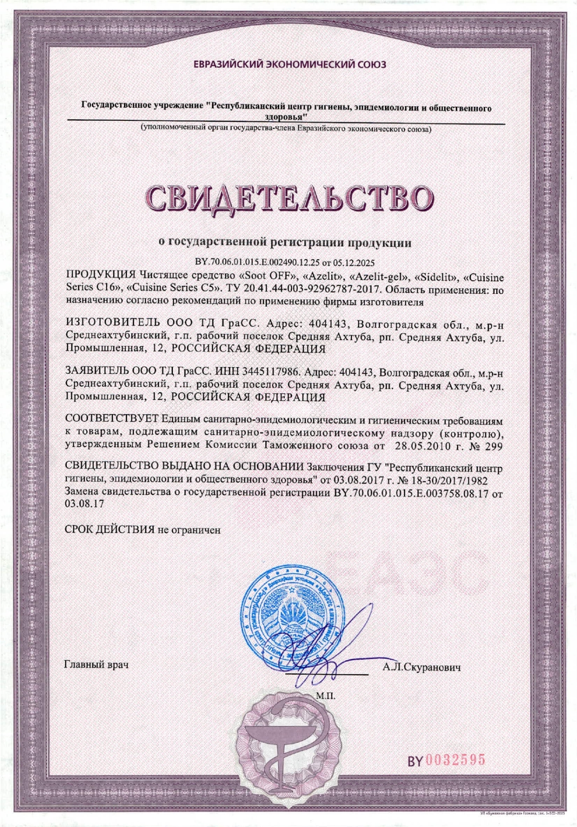 Средство для чистки плит, духовок, грилей от жира/нагара, ГЕЛЬ 500 мл, GRASS AZELIT-GEL, щелочное Код товара: 702623 178,27 ₽ Купить Производитель:GRASS Концентрированный гель с усиленной формулой эффективно удаляет жир, нагар, копоть и пригоревшую пищу с эмалированных и хромированных поверхностей, изделий из стекла, нержавеющей стали, фаянса и фарфора. Используется для мытья сковородок, кухонных плит, коптильных камер, фритюрниц, грилей, духовых шкафов, микроволновых печей. Содержит активные чистящие вещества, компоненты, расщепляющие жир. Гарантирует отличный результат без особых усилий. Ключевые особенности: - густой гель, - антижир, - для различных поверхностей. Состав: не менее 30% вода; более 5%: анионные ПАВ, неионогенные ПАВ, соль ЭДТА, гидроксид натрия, ароматизирующая добавка, d-лимонен, краситель. Способ применения: состав использовать в готовом виде или разбавить с водой 50–100 г/л. Нанести на очищаемую поверхность, оставить на 30 секунд, в зависимости от загрязнения увеличить время экспозиции до 2 минут. Потереть щеткой или губкой, смыть водой. При необходимости обработку повторить. При сильных загрязнениях увеличить время контакта. Меры предосторожности: беречь от детей! Хранить вдали от пищевых продуктов. При попадании в глаза немедленно промыть водой. При чувствительной коже и повреждениях кожи избегать длительного контакта со средством.Производство: РоссияНазначение: для плит, духовок, грилейОбъём/вес: 500 мл/гФорма выпуска: гельОтдушка: без отдушкиДозатор: крышкаСерия: AZELITБез хлора: даСрок годности: 24 месВес: 604 грРазмер упаковки: 4.8 × 25.1 × 9.3 смОбъём: 0.0014 м3Промежуточная упаковка: 8 штТранспортная упаковка: 8 штШтрих-код: 4607072198381 Файлы Приложение-1.pdf Сертификат-1.jpg Сертификат-2.jpg Сертификат-3.jpg Сертификат-4.jpg Сертификат-5.jpg Сертификат-6.jpg Сертификат-7.jpg Сертификат-8.jpg Сертификат-9.jpg Сертификат-10.jpg Сертификат-11.jpg Сертификат-12.jpg Сертификат-13.jpg Сертификат-14.jpg Сертификат-15.jpg Сертификат-16.jpg Сертификат-17.jpg Сертификат-18.jpg Сертификат-19.jpg Сертификат-20.jpg Сертификат-21.jpg Сертификат-22.jpg Сертификат-23.jpg Сертификат-24.jpg Сертификат-25.jpg
