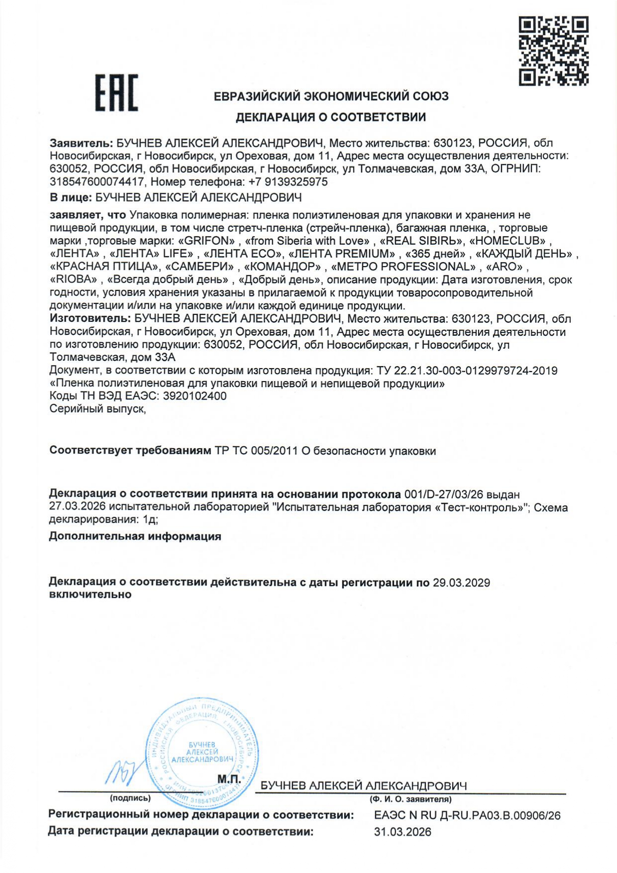 Багажная пленка для ручной упаковки, ассорти, 29 см х 70 м, 12 мкм, GRIFON Код товара: 701359 194,46 ₽ Купить Производитель:GRIFON Багажная пленка – это прочная, эластичная стретч-пленка для упаковки чемоданов, сумок и коробок вручную. Представлена в цветах ассорти (желтый, красный, синий, зеленый) для легкой идентификации своего багажа на ленте выдачи. Толщина 12 мкм обеспечивает максимальную защиту от ударов, царапин, влаги и попыток вскрытия. Рулон 29 см х 70 м – оптимальный объем для путешествий. Идеальное решение для семейного отдыха, защиты дорогих чемоданов, переездов и транспортировки хрупких грузов.Производство: РоссияШирина: 290 ммТолщина: 12 мкмДлина намотки: 70 мВес без втулки: 0.1 кгВнутренний диаметр втулки: 38.5 ммРастяжение: 200 %Сырье: полиэтиленЦвет: разноцветныйВес: 248 грРазмер упаковки: 4.8 × 31.1 × 4.9 смОбъём: 0.0012 м3Промежуточная упаковка: 15 штТранспортная упаковка: 15 штШтрих-код: 4607693010451 Файлы Сертификат-1.jpg Сертификат-2.jpg Сертификат-3.jpg