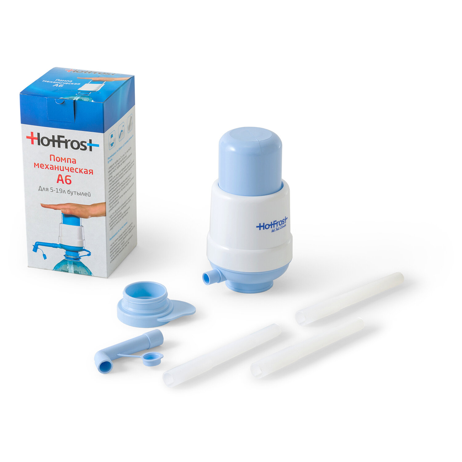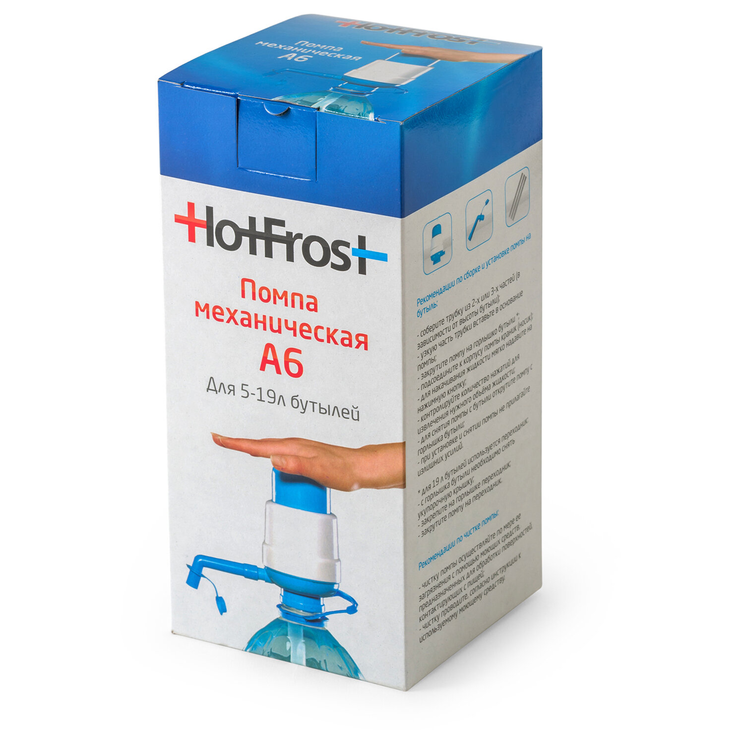 Помпа для воды HOT FROST A6, механическая Код товара: 454297 548,63 ₽ Купить Производитель:HOT FROST Надевается прямо на бутыль. Не требует электропитания. Подача воды осуществляется за счёт создания насосом помпы избыточного давления воздуха в бутыли. Воду дает порционно, при каждом нажатии на кнопку насоса. Самое простое устройство для розлива воды комнатной температуры. Подходит для розлива воды из 19-ти, 5-ти и 8-ми литровых бутылей.Рекомендации по сборке и установке помпы на бутыль: - соберите трубку из 2-х или 3-х частей (в зависимости от высоты бутыли); - узкую часть трубки вставьте в основание помпы; - закрутите помпу на горлышко бутыли; - подсоедините к корпусу помпы краник (носик); - для накачивания жидкости мягко надавите на нажимную кнопку; - контролируйте количество нажатий для извлечения нужного объёма жидкости; - для снятия помпы с бутыли открутите помпу с горлышка бутыли; - при установке и снятии помпы не прилагайте излишних усилий. для 19-литровых бутылей используется переходник: - с горлышка бутыли необходимо снять укупорочную крышку; - закрепите на горлышке переходник; - закрутите помпу на переходник.Производитель на свое усмотрение и без дополнительных уведомлений может менять комплектацию, внешний вид, страну производства и технические характеристики модели.Производство: БолгарияТип помпы: механическийКоличество режимов: 0Производительность: 0 л/минТип установки: на бутыль (бутыль в комплект не входит)Материал корпуса: пластикСерия: AЦвет: белый/голубойВысота: 17.5 смДиаметр: 9.3 смКомплектация: инструкция, носик, помпа, пробка для носика, телескопические трубкиВес: 267 грРазмер упаковки: 10.5 × 20 × 11.1 смОбъём: 0.0027 м3Промежуточная упаковка: 24 штТранспортная упаковка: 24 штШтрих-код: 4630004841505 Файлы Приложение-1.pdf Сертификат-1.jpg Сертификат-2.jpg Сертификат-3.jpg
