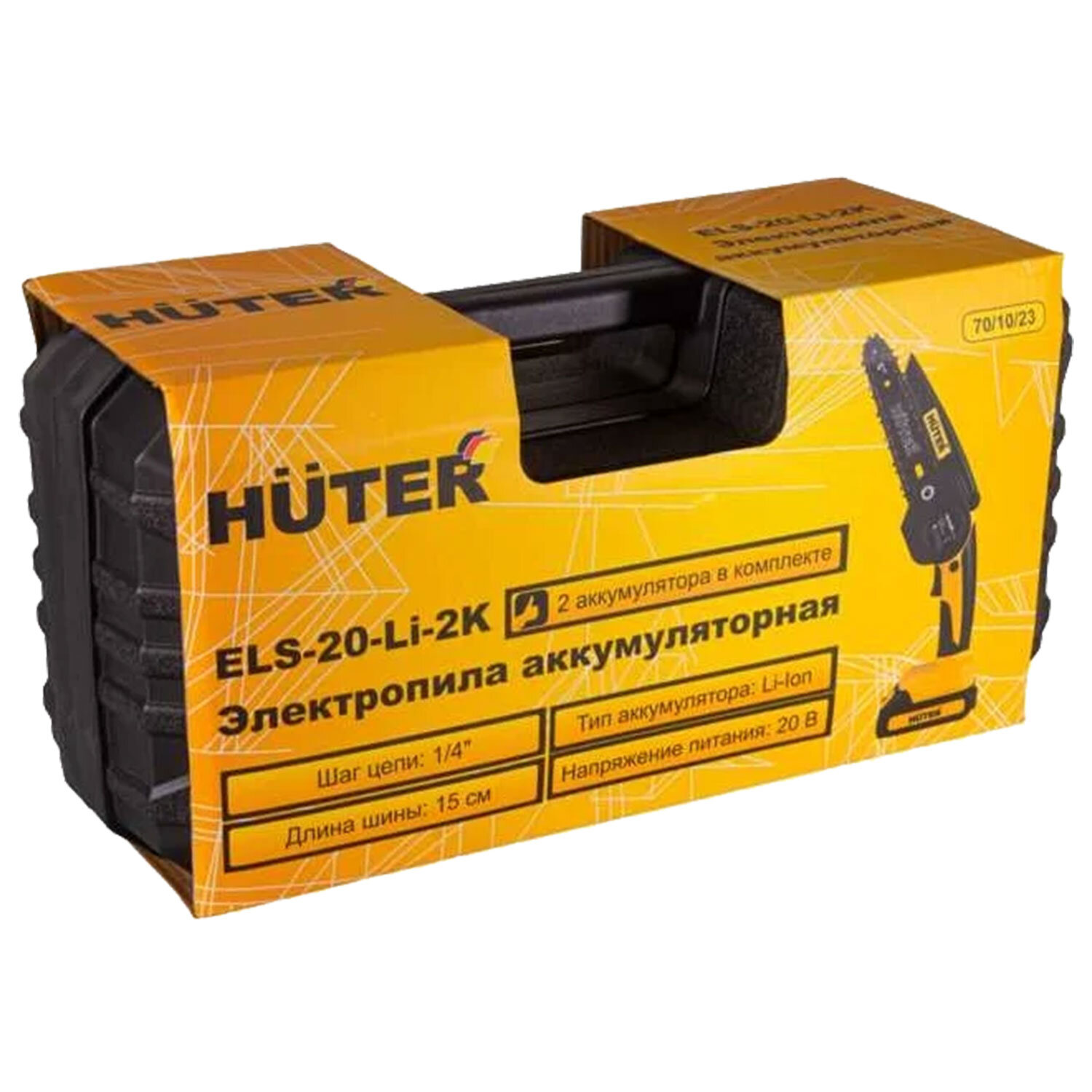 Пила цепная аккумуляторная HUTER ELS-20-Li-2К ЕА+, 20В, 150мм, Li-ion 2х2 Ач, кейс Код товара: 671573 4 304,72 ₽ Купить Производитель:HUTER Аккумуляторная цепная пила HUTER ELS-20-Li-2К ЕА+ (20 В, шина 150 мм) — мобильный помощник для дачи и сада. С двумя Li-Ion аккумуляторами 2 Ач и кейсом в комплекте. Обрезка веток, заготовка дров, работы на участке. Цепная аккумуляторная пила HUTER ELS-20-Li-2К ЕА+ (70/10/23) предназначена для обрезки сучьев, спиливания небольших деревьев, заготовки дров, работ с пиломатериалами на даче и в саду. Подходит для частных пользователей и садоводов. Ключевые характеристики: напряжение аккумулятора: 20 В; ёмкость аккумулятора: 2х2Ач, Li-Ion; длина шины: 150 мм (6"); шаг цепи: 1/4"; количество звеньев цепи: 36 шт.; скорость пиления: 6,5 м/с; максимальный диаметр распиливаемого дерева: до 100 мм; вес: 2,833 кг; габариты упаковки: 0,240х0,140х0,200 м. Комплектация: цепная пила; шина; цепь; защитный чехол шины; универсальный ключ; 2 аккумулятора; зарядное устройство; кейс для хранения и транспортировки; инструкция. Преимущества: два аккумулятора в комплекте — длительная непрерывная работа; мобильность — независимость от электросети, свобода перемещения по участку; экологичность — отсутствие выхлопов, подходит для работы в закрытых помещениях; низкий уровень шума — комфорт для пользователя и окружающих; компактный размер и небольшой вес (2,8 кг) — удобство при работе и транспортировке; электронный тормоз цепи — быстрая остановка для безопасности; прочный корпус из качественного пластика — долговечность при активном использовании; эргономичная рукоятка — надёжный хват и снижение усталости при долгой работе; кейс в комплекте — безопасное хранение и удобная переноска; гарантия: 1 год. Вся информация на сайте о товарах носит справочный характер и не является публичной офертой в соответствии с пунктом 2 статьи 437 ГК РФ. Производитель оставляет за собой право изменять характеристики товара, его внешний вид и комплектность без предварительного уведомления продавца.Производство: КитайТип товара: пилаДлина шины: 15 смКоличество звеньев: 36 шт.Шаг цепи: 0.375 дюймСкорость вращения цепи: 6.5 м/сек.Тип аккумулятора: Li-IonНапряжение аккумулятора: 20 ВКоличество аккумуляторов в комплекте: 2 шт.Емкость аккумулятора: 2 АчДлина: 240 смШирина: 140 смВысота: 200 смВес нетто: 2.8Серия: ELSВес: 3,2 кгРазмер упаковки: 14 × 19 × 40 смОбъём: 0.0129 м3Промежуточная упаковка: 6 штТранспортная упаковка: 6 штШтрих-код: 4606059043775 Файлы