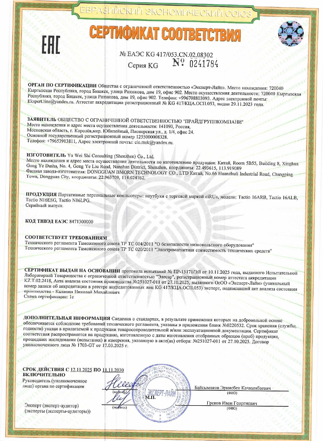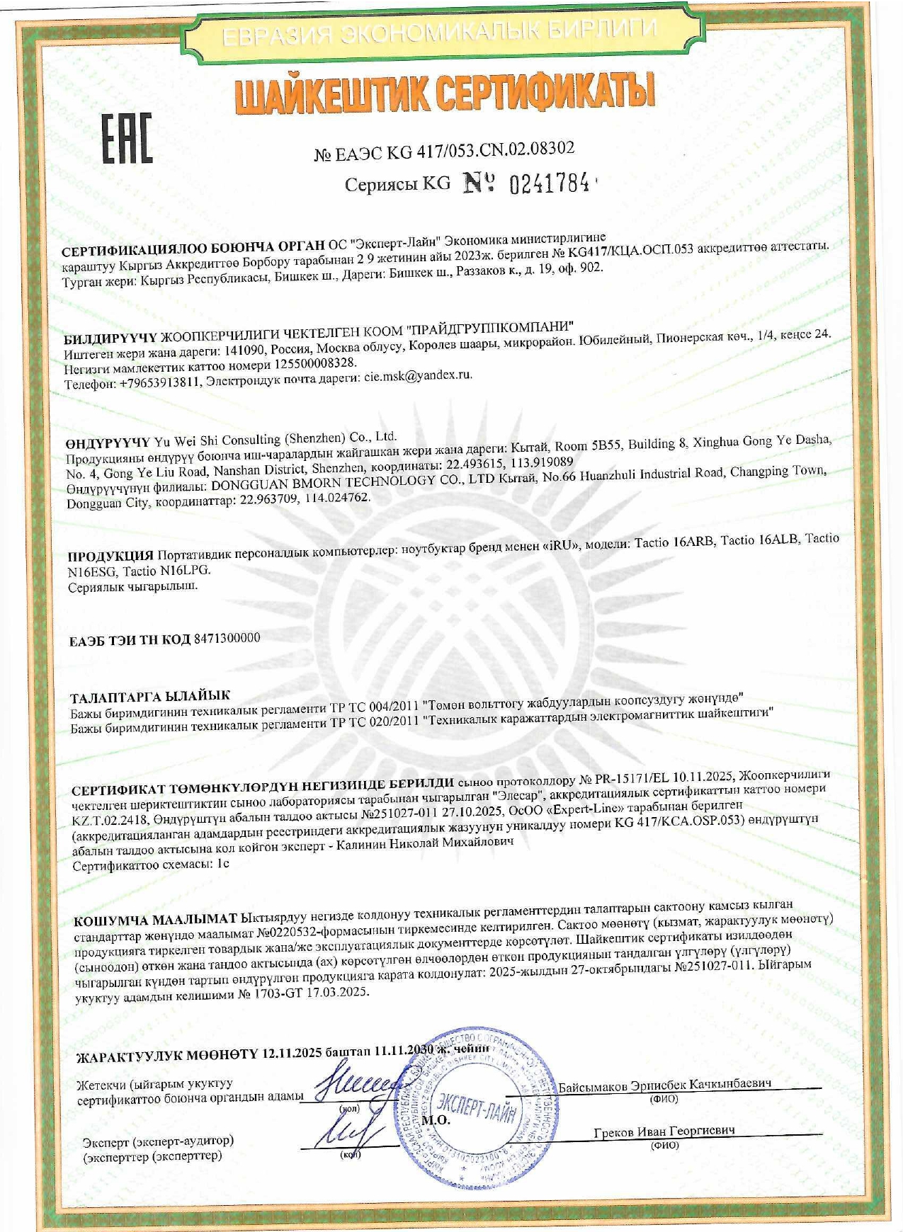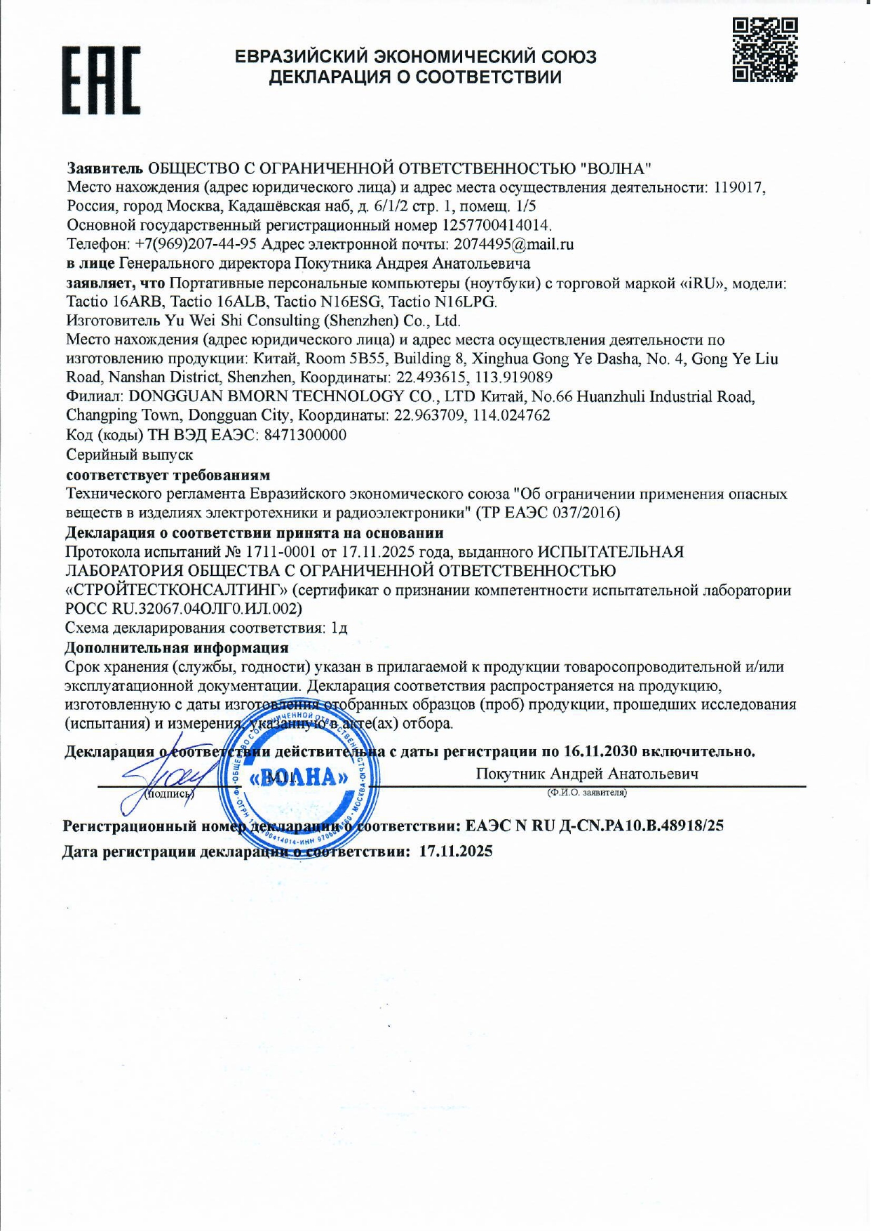 Ноутбук IRU Tactio 16ALB 16", Intel Core i5-1235U, 16 Гб, SSD 256 Гб, Windows 11 Pro, серый Код товара: 355112 57 362,66 ₽ Купить Производитель:IRU Ноутбук IRU Tactio 16ALB 16" – производительность и комфорт для ежедневных задач. Экран 16 дюймов – это возможность разместить два окна рядом без потери читаемости, комфортно работать с Excel-таблицами на 1000+ строк, верстать документы или писать код. Матовое покрытие снижает блики – глаза устают меньше даже после 8-часового рабочего дня. Процессор Intel Core i5-1235U – архитектура нового поколения: 2 мощных ядра для тяжелых задач и 8 энергоэффективных для фоновых процессов. Результат – высокая производительность при сохранении автономности. Видеозвонки, браузер, офисные приложения – все работает плавно и одновременно. 16 Гб оперативной памяти – забудьте о недостатке памяти. Открывайте 30+ вкладок в браузере, работайте с PDF, PowerPoint и Zoom одновременно – система остается отзывчивой. SSD 256 Гб – загрузка Windows за 10–12 секунд, мгновенный запуск программ. Объем оптимален для работы с облачными хранилищами и документами. При необходимости слот M.2 позволяет легко расширить память. Windows 11 Pro: поддержка домена, шифрование BitLocker, удаленный рабочий стол, групповые политики. Ноутбук готов к использованию в корпоративной среде без дополнительных затрат на лицензии. Серый корпус из прочного пластика – практичный, немаркий, строгий. Выглядит уместно в офисе, университете, кафе или дома. Вся информация на сайте о товарах носит справочный характер и не является публичной офертой в соответствии с пунктом 2 статьи 437 ГК РФ. Производитель оставляет за собой право изменять характеристики товара, его внешний вид и комплектность без предварительного уведомления продавца.Производство: КитайДиагональ экрана: 16 "Разрешение экрана: 1920x1200 пикселейПоверхность экрана: матоваяОперационная система: Windows 11 ProfessionalПроцессор: IntelМодель процессора: Core i5 1235UЧисло ядер процессора: 10 шт.Максимальная частота процессора: 4.4 ГГцБазовая частота процессора: 1.3 ГГцТип оперативной памяти: DDR4Размер оперативной памяти: 16 ГБТип накопителя: SSDОбъем жесткого диска (HDD): 0 ГБОбъем твердотельного накопителя (SSD): 256 ГБТип видеокарты: интегрированнаяПроизводитель видеочипа: IntelМодель видеокарты: Intel UHD GraphicsРазмер видеопамяти: 0 МБСкорость сетевого адаптера: 0 Мбит/сБеспроводные подключения: BlueTooth, Wi-FiВстроенные динамики и микрофон: даВстроенная веб-камера: даКартридер: даРазъем RJ-45: 0 шт.Разъем USB 2.0: 1 шт.Разъем USB 3.0: 2 шт.Разъем USB Type-C: 1 шт.Разъем VGA (D-Sub): 0 шт.Разъем HDMI: 1 шт.Разъем DisplayPort: 0 шт.Разъем для наушников/микрофона: даЗапасаемая энергия: 0 Вт/чВремя автономной работы: 6 чМатериал корпуса: пластикЦвет корпуса: серыйВысота: 25 смШирина: 35.7 смГлубина: 1.9 смВес: 2.2 кгСерия: TactioРазмер упаковки: 28.5 × 39.5 × 8.3 смОбъём: 0.0093 м3Промежуточная упаковка: 1 штТранспортная упаковка: 1 штШтрих-код: 4640131365690 Файлы Сертификат-1.jpg Сертификат-2.jpg Сертификат-3.jpg Сертификат-4.jpg Сертификат-5.jpg Сертификат-6.jpg Сертификат-7.jpg