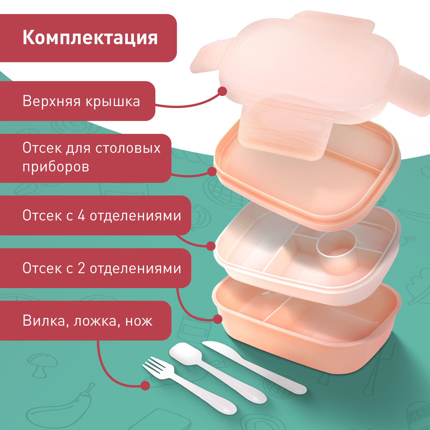Ланч-бокс контейнер, 3 секции, 8 отделений, 1,9 л, ложка, вилка, нож, 10х21х14 см, персиковый, JOYLUX (ДЖОЙЛЮКС) Код товара: 609351 698,12 ₽ Купить Производитель:Joylux Многофункциональный герметичный ланч-бокс Joylux объемом 1900 мл имеет три уровня и изготовлен из пластика высокого качества – это универсальное и безопасное решение для полноценного сбалансированного приема пищи в офисе, школе, поездках и путешествиях! Ланч-бокс Joylux выполнен из высококачественного полипропилена, который соответствует всем требованиям безопасности и не содержит бисфенола А. Материал устойчив к высоким температурам и подходит для использования в микроволновой печи и посудомоечной машине, что делает уход за контейнером максимально простым. Герметичность обеспечивается за счёт силиконового уплотнителя на крышке – это позволяет безопасно переносить даже жидкие блюда без риска протекания. В комплект входят пластиковые ложка, вилка и нож, которые удобно хранятся в верхней секции ланч-бокса. Объём ланч-бокса – 1900 мл, что оптимально для полноценного обеда. Он состоит из трёх уровней: нижний (950 мл) с двумя отделениями подойдёт для основного блюда, например, гарнира и мяса; средний (750 мл) с четырьмя отсеками идеален для салатов, сэндвичей, снеков, десертов и соусов; дополнительная верхняя секция (250 мл) — предназначена для хранения столовых приборов, которые идут в комплекте, и подойдёт для размещения ломтика хлеба или нескольких хлебцев. Благодаря продуманной конструкции блюда сохраняют вкусовые качества и не смешиваются между собой. Joylux отличается современным универсальным дизайном, который понравится и детям, и взрослым. Компактные размеры и удобная форма позволяют легко разместить ланч-бокс в сумке или рюкзаке. Рекомендации по использованию: - Используйте ланч-бокс для хранения и транспортировки горячих и холодных блюд (диапазон температур при использовании от -20 до +110 °C). - Перед разогревом в микроволновой печи убедитесь, что крышка открыта. - Подходит для посудомоечной машины и микроволновой печи.Производство: КитайОбъем: 1.9 лНазначение: СВЧ, хранениеКоличество секций: 3Особенности: герметичныйЦвет контейнера: персиковыйЦвет крышки: персиковыйМатериал: пластикВысота: 10 смШирина: 21 смГлубина: 14 смВес: 513 грРазмер упаковки: 10.6 × 23 × 15.6 смОбъём: 0.0045 м3Промежуточная упаковка: 30 штТранспортная упаковка: 30 штШтрих-код: 4606224440101 Сертификат-1.jpg Сертификат-2.jpg Сертификат-3.jpg
