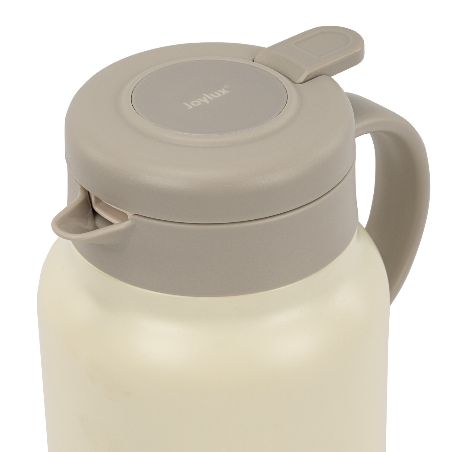 Чайник-термос 1 л JOYLUX (ДЖОЙЛЮКС) COFFEE BREAK, нержавеющая сталь SUS304, заварник/сито, бежевый матовый Код товара: 700329 1 039,89 ₽ Купить Производитель:Joylux Термос-чайник JOYLUX объединяет функции термоса и заварного чайника: позволяет заваривать напитки в корпусе и сохранять температуру. Оснащён кнопкой-дозатором, съёмным ситом от чаинок и носиком без проливания. Практичное решение для дома и офиса. Термос-чайник JOYLUX COFFEE BREAK изготовлен из высококачественной пищевой нержавеющей стали SUS304, обеспечивающей долговечность и безопасность использования. Конструкция включает двойные вакуумные стенки, силиконовые уплотнители и надёжную крышку, что гарантирует полную герметичность и исключает протечки в процессе эксплуатации. Внутри предусмотрен съёмный фильтр-ситечко из нержавеющей стали, эффективно удерживающее чаинки и другие частицы заварки. Модель оснащена удобной крышкой с кнопкой-дозатором, позволяющей наливать напиток без полного откручивания крышки – это помогает дольше сохранять температуру содержимого. Эргономичная ручка выполнена из качественного пластика, а стильный корпус представлен в бежевом матовом цвете. Следует учитывать, что длительность удержания температуры зависит от ряда факторов: частоты открывания, времени нахождения в открытом состоянии, температуры окружающей среды и начальной температуры налитой жидкости. Термос-чайник имеет высоту 17,6 см, диаметр горлышка – 11,3 см, диаметр донышка – 11,9 см. Объем – 1 л.Производство: КитайОбъем: 1 лТип горла: узкоеНаличие ручки: даСерия: COFFEE BREAKВысота: 17.6 смДиаметр: 15.4 смЦвет: бежевыйМатериал: нержавеющая сталь 304Тип упаковки: картонная коробкаВес: 719 грРазмер упаковки: 13.7 × 19.1 × 13.5 смОбъём: 0.0044 м3Промежуточная упаковка: 12 штТранспортная упаковка: 12 штШтрих-код: 4606224473703 Файлы Сертификат-1.jpg Сертификат-2.jpg